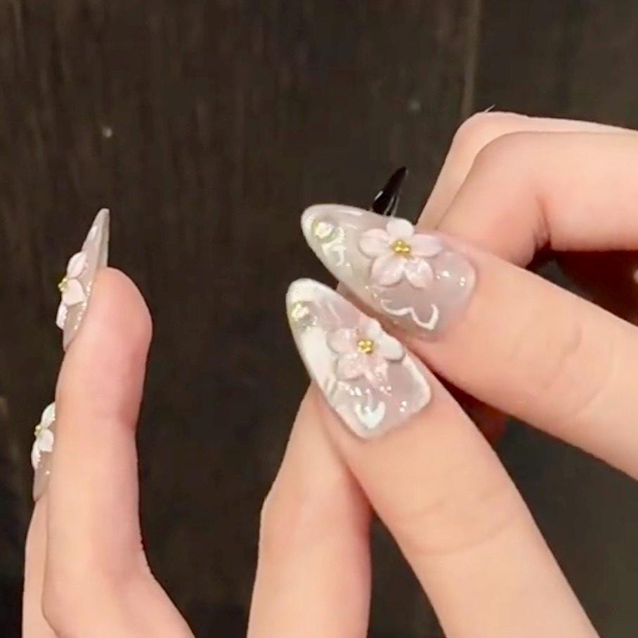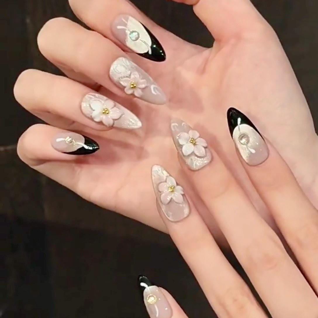 This graceful press-on nail set blends soft blush pink with bold black tips, featuring intricate 3D floral accents and delicate glitter shimmer throughout. Each nail is finished with luminous rhinestones and graceful hand-painted white swirls, adding depth and sparkle. The sculpted flowers in white and soft pink are placed over a satin shimmer base, creating a balanced look that is both romantic and refined. Perfect for weddings, formal events, or everyday elegance with a luxurious twist.