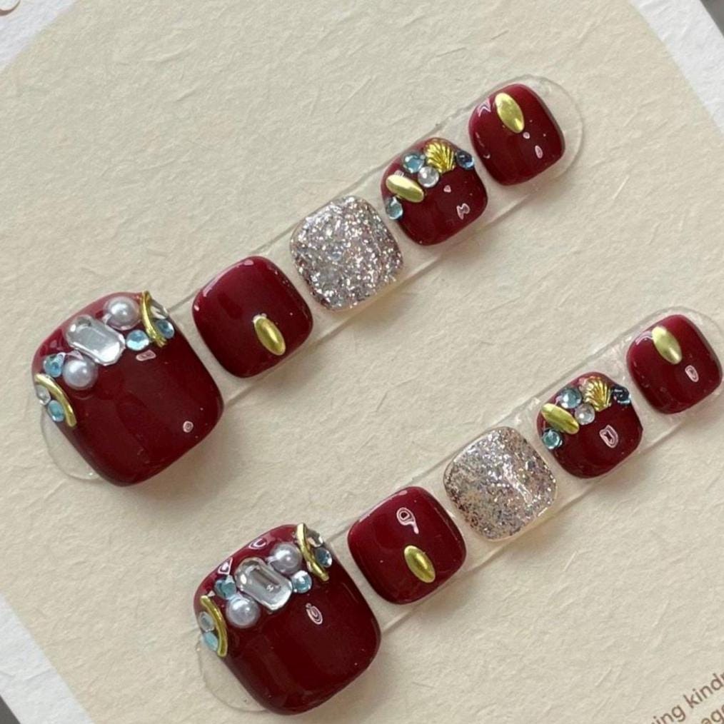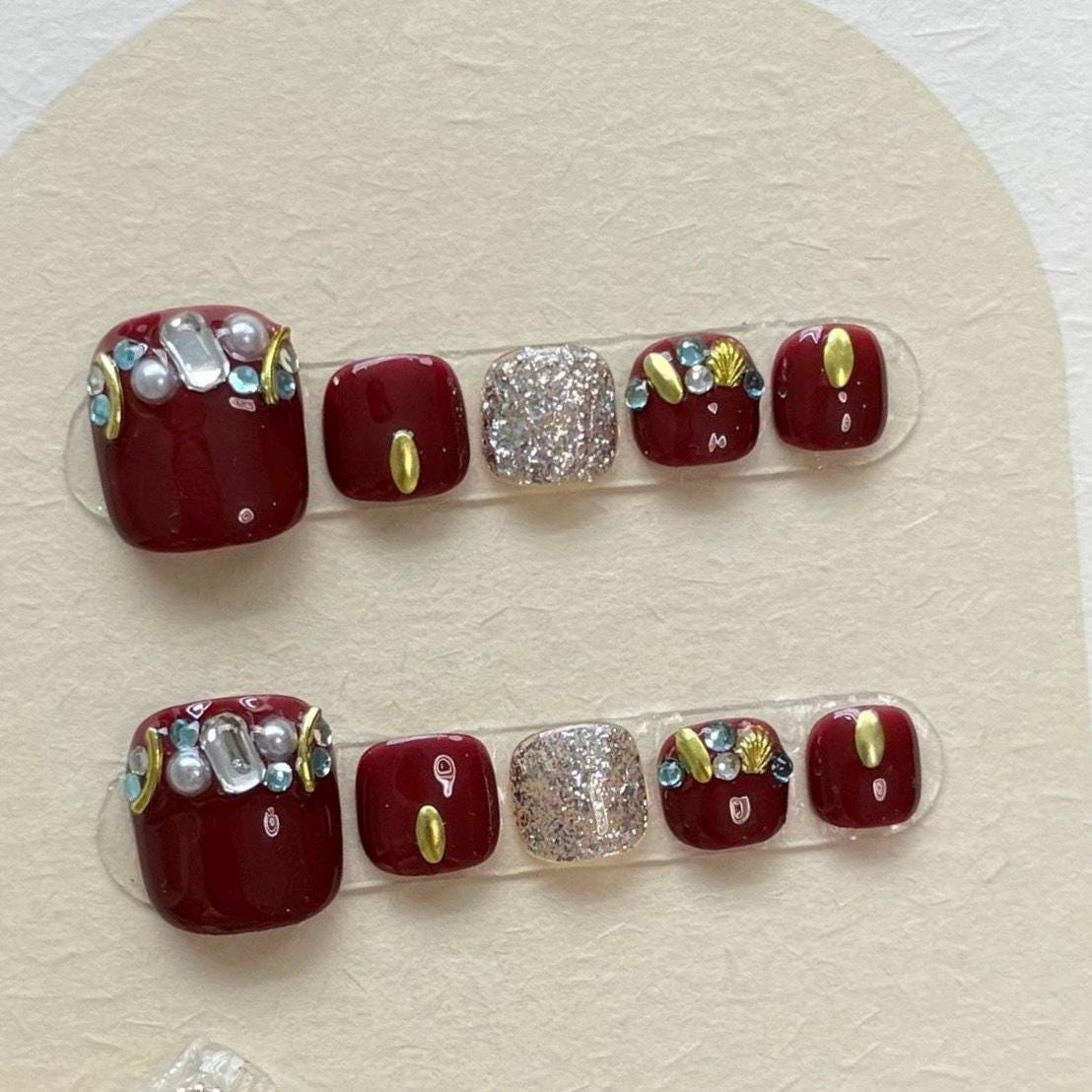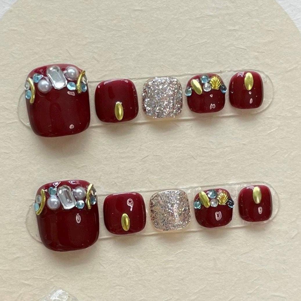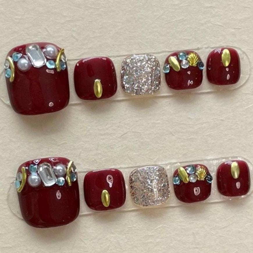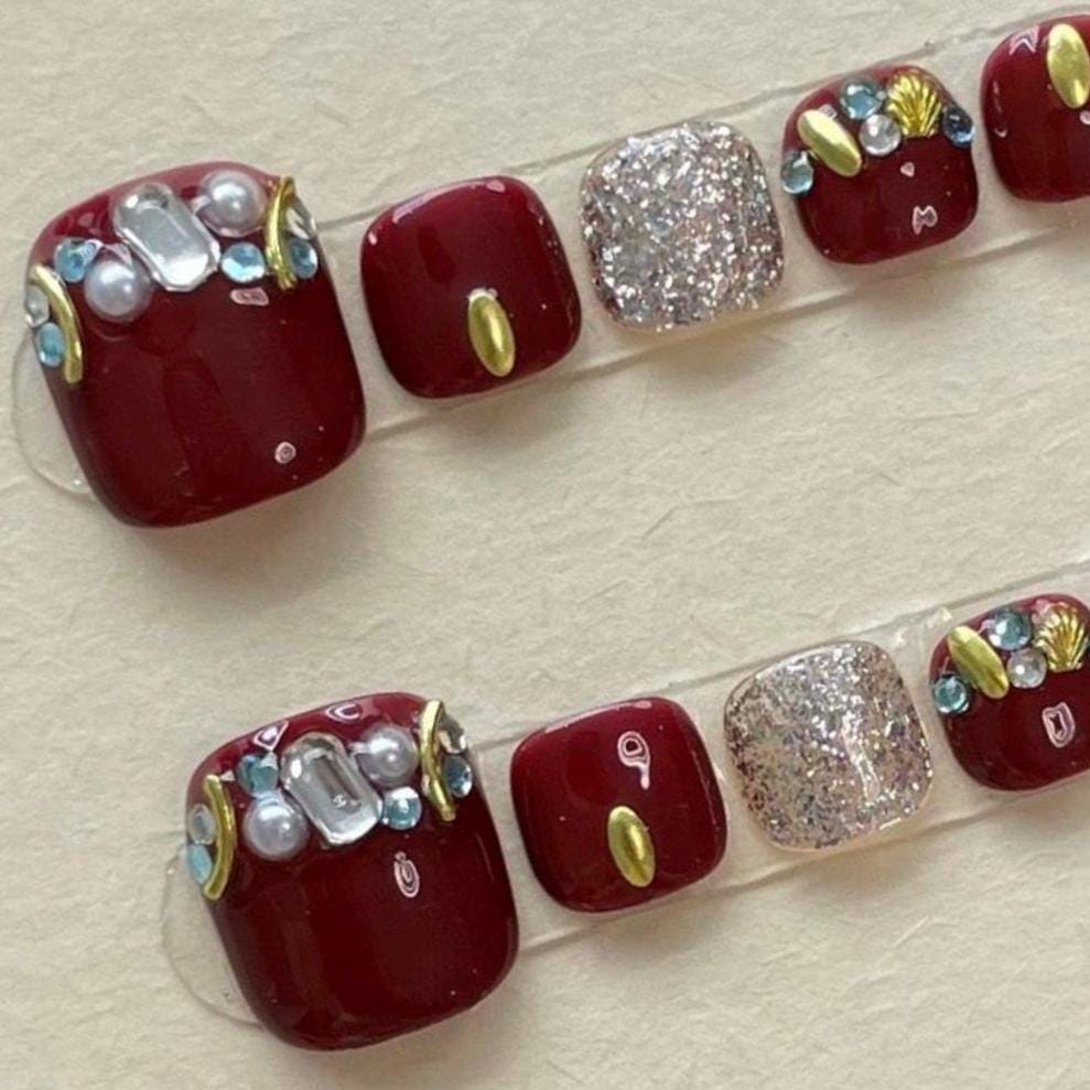 This luxurious press-on toenail set features a deep burgundy base accented with gold embellishments, pearls, and sparkling rhinestones. One glittery silver toe adds the perfect pop of shimmer. Ideal for special occasions or to elevate your everyday style with a touch of glam and sophistication.