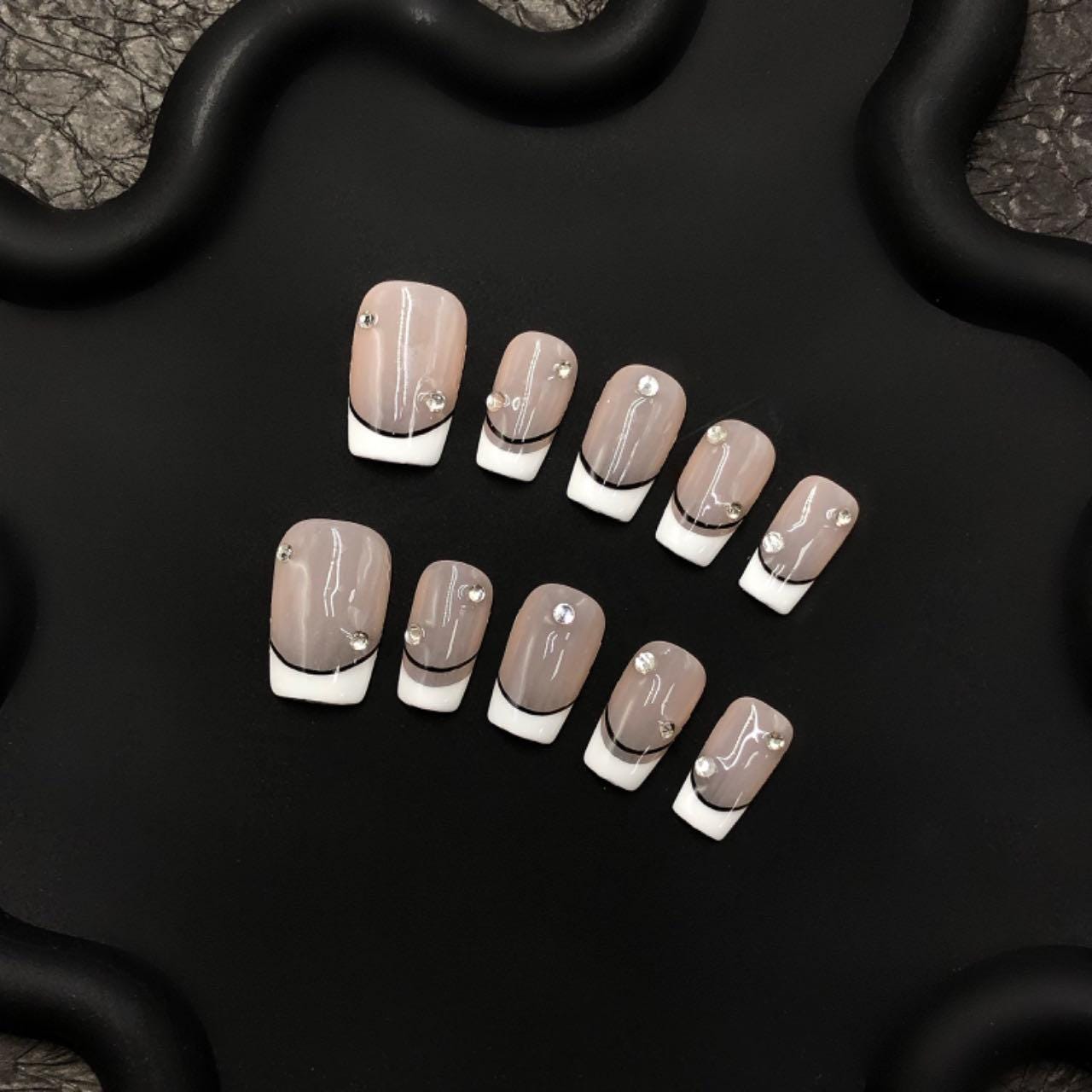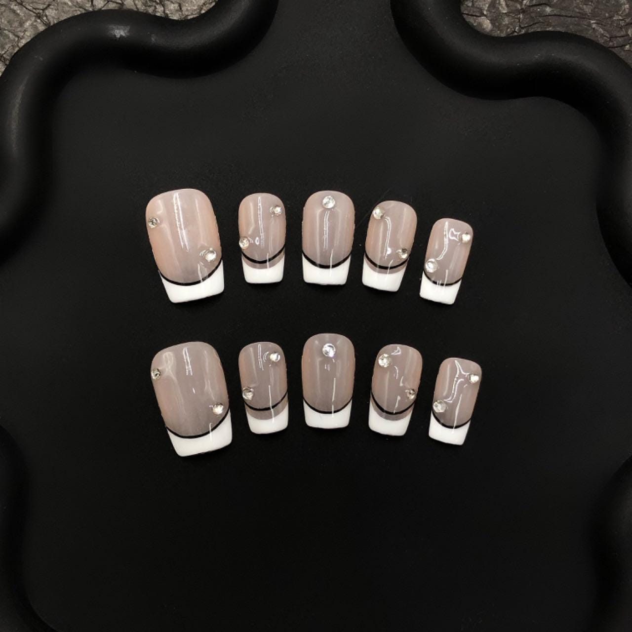 Elegant French Tip Press On Nails – Nude & White with Black Accent – Rhinestone Embellished Glossy Nails – Custom Luxury Nail Set