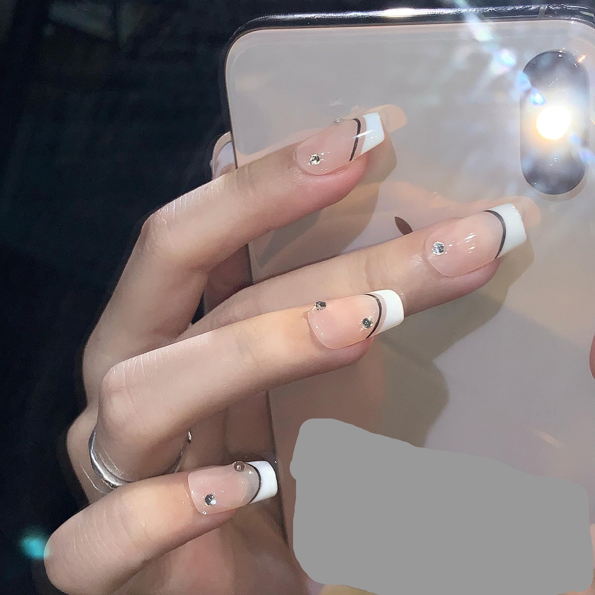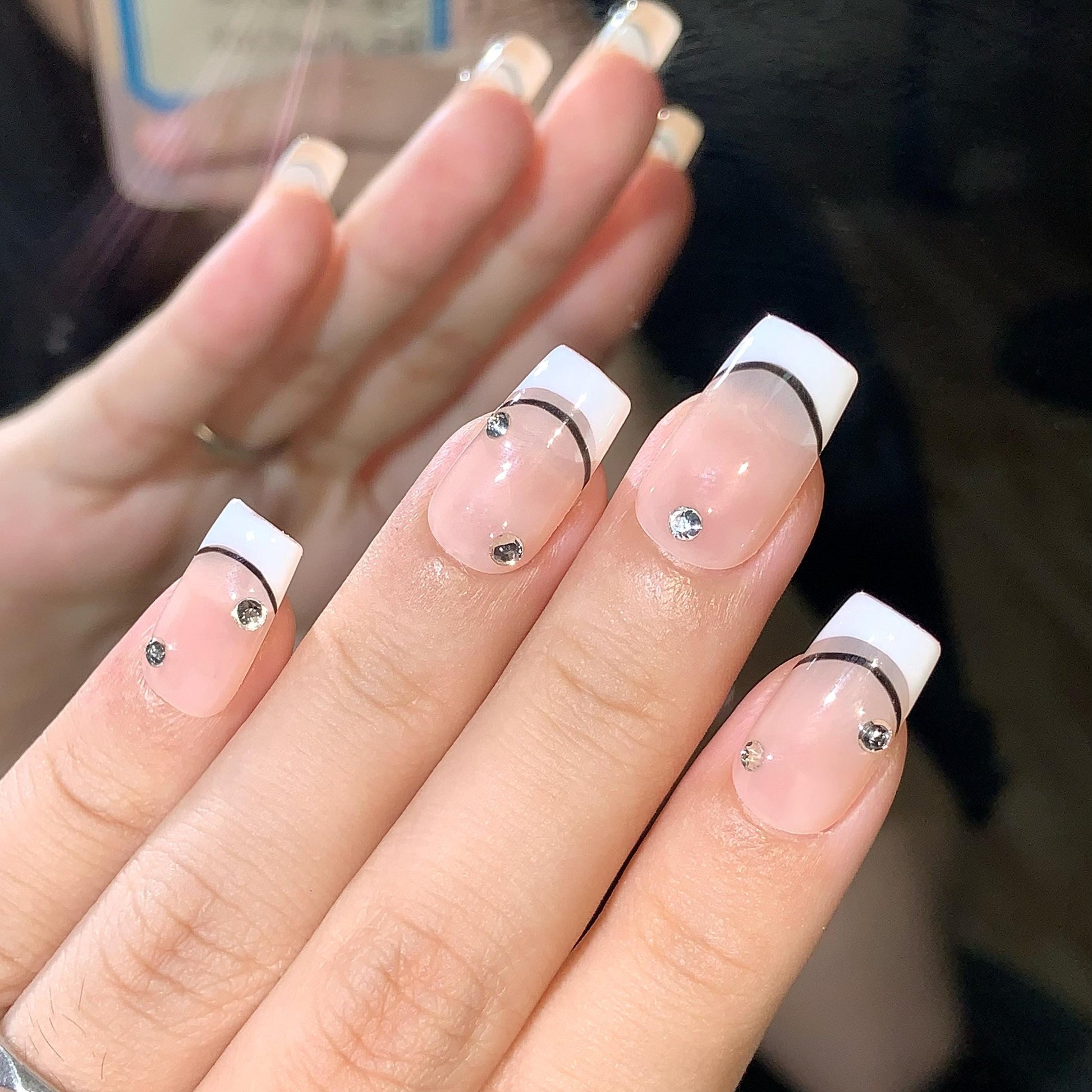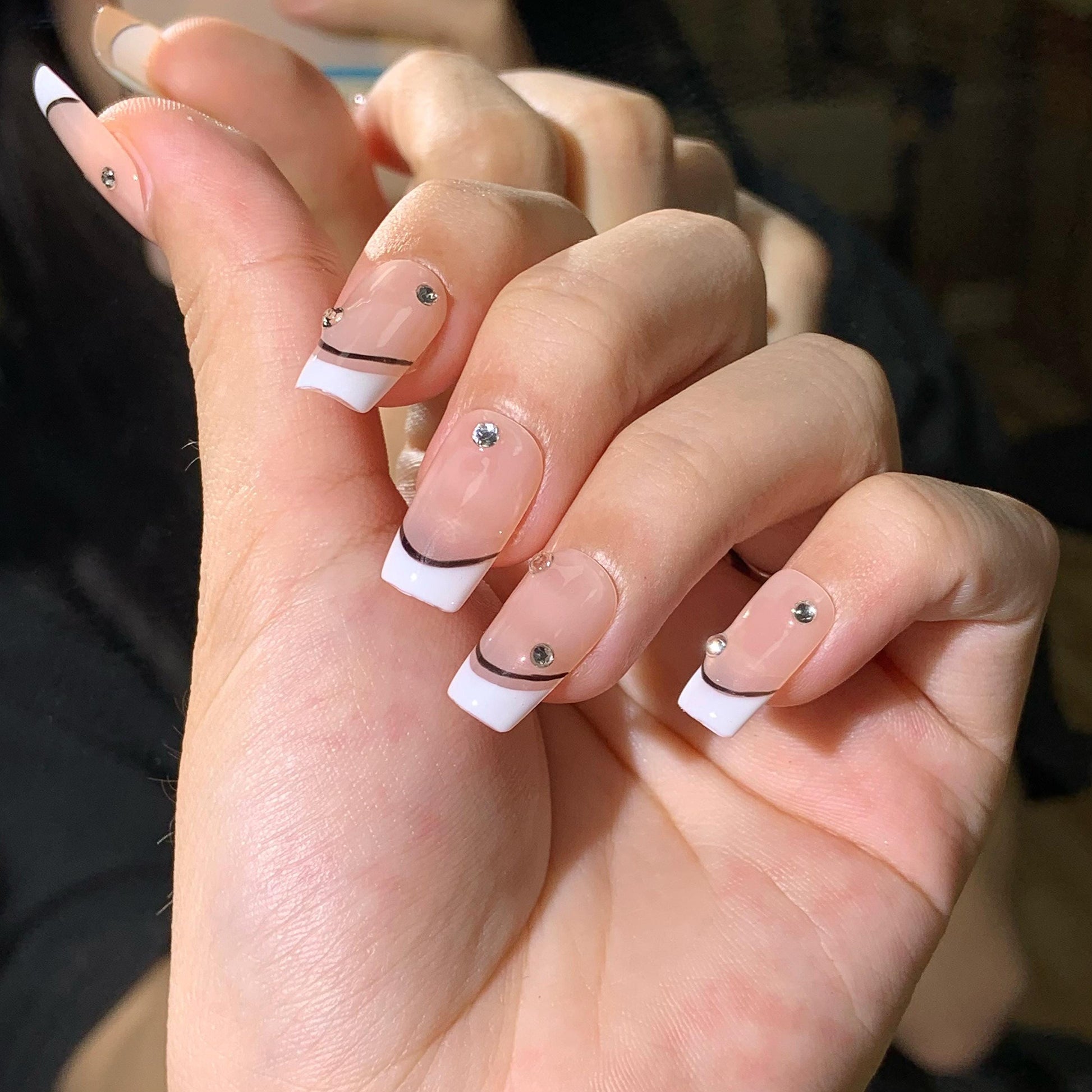 These elegant press-on nails feature a modern twist on the classic French tip with a nude base, crisp white tips, and a sleek black accent line. Subtle rhinestone embellishments add a touch of luxury and sophistication. Perfect for any occasion, these glossy, high-quality nails provide a chic and timeless look with effortless application.