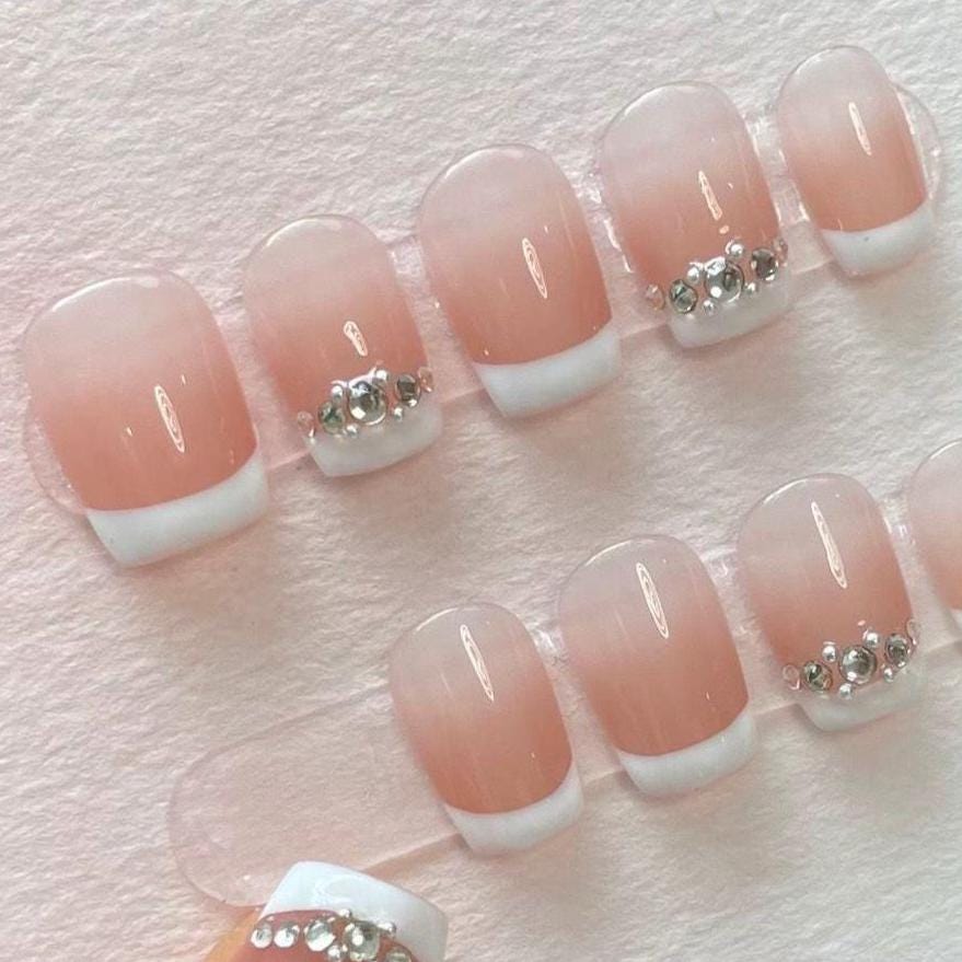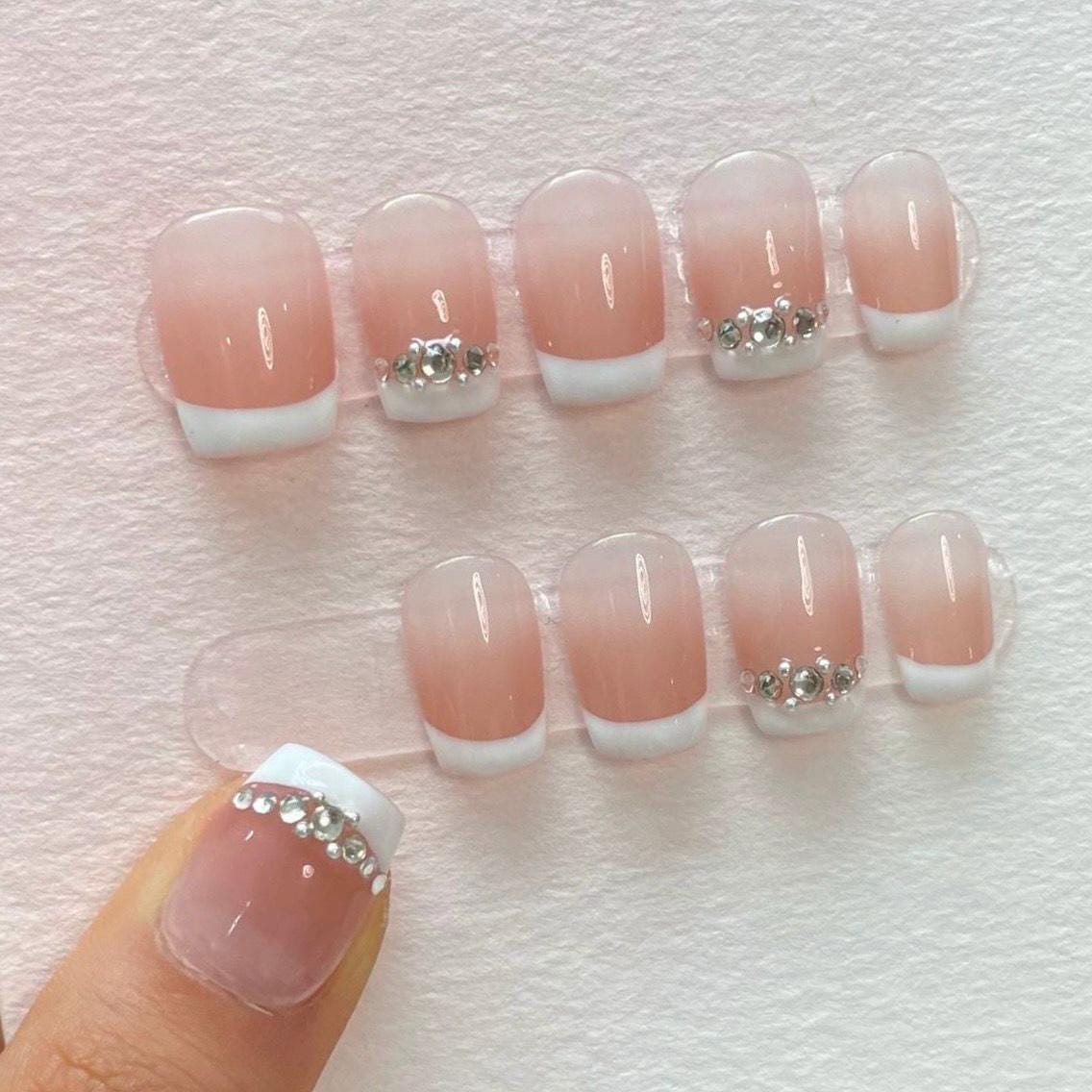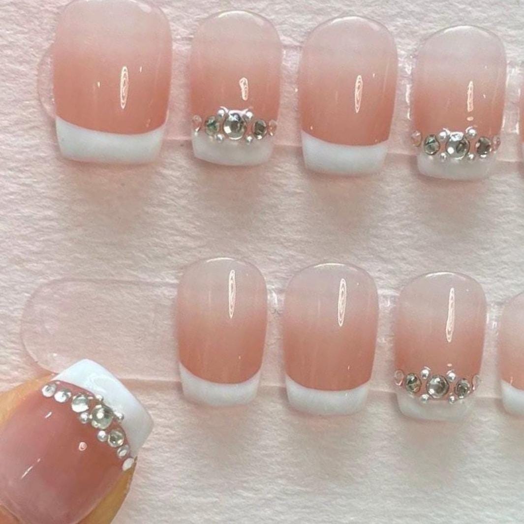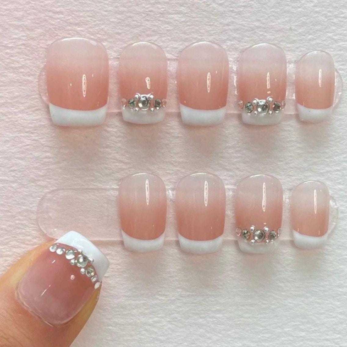 Add a touch of glam to your classic look with these French tip press-on nails. Featuring a soft nude base, crisp white tips, and sparkling rhinestone embellishments, this short square set is perfect for weddings, parties, or an elevated everyday look. Easy to apply, reusable, and effortlessly chic.