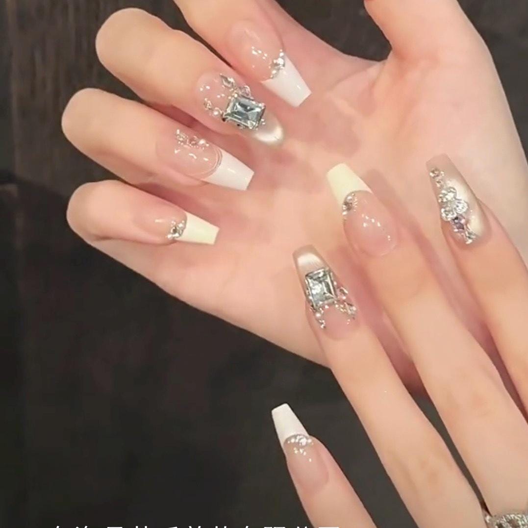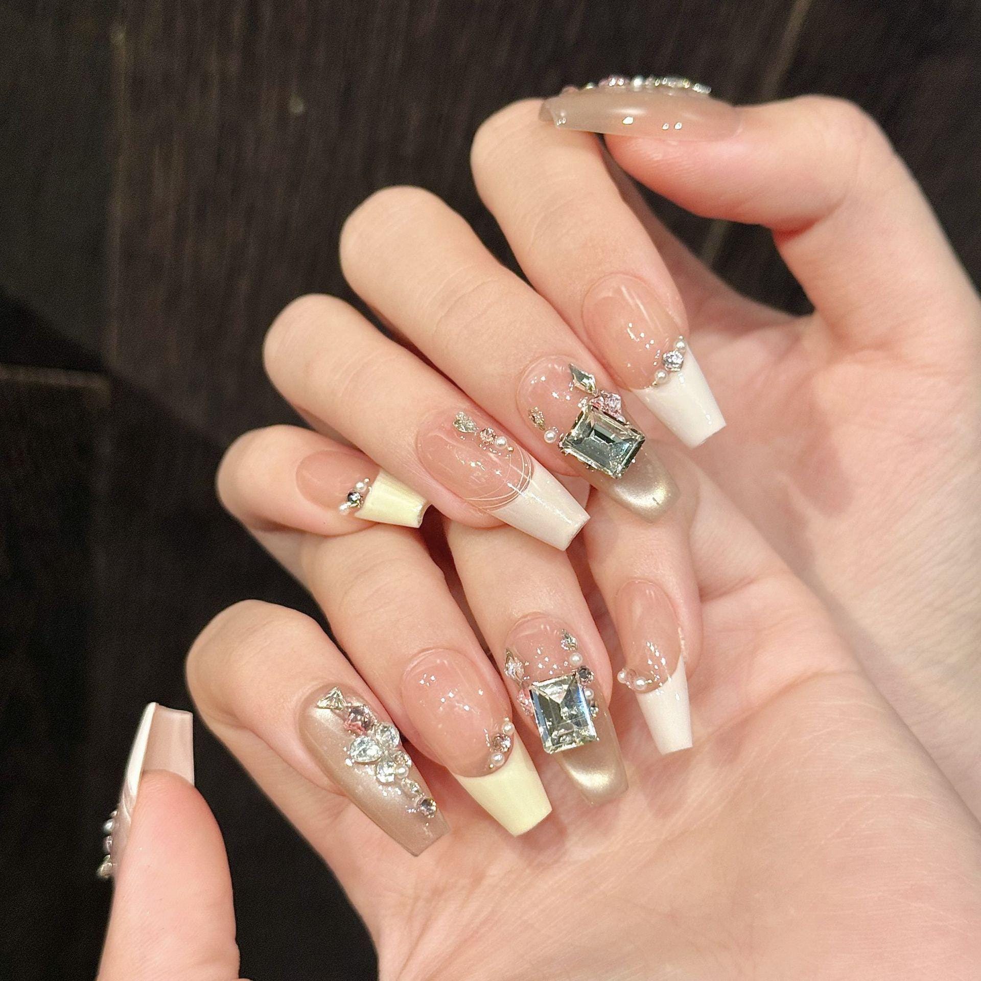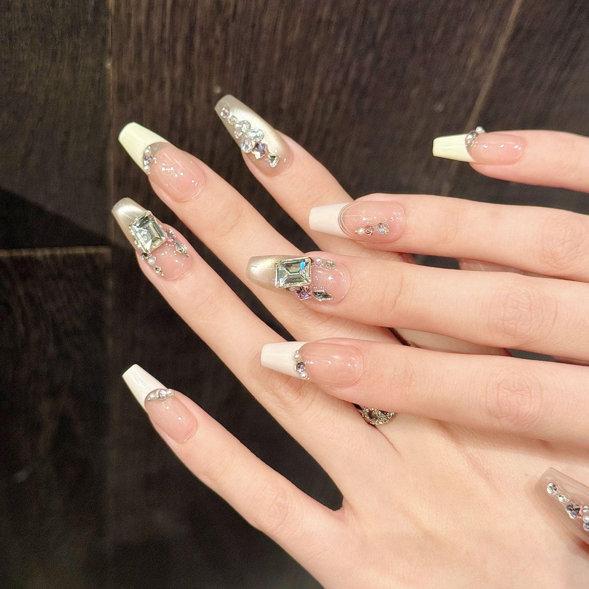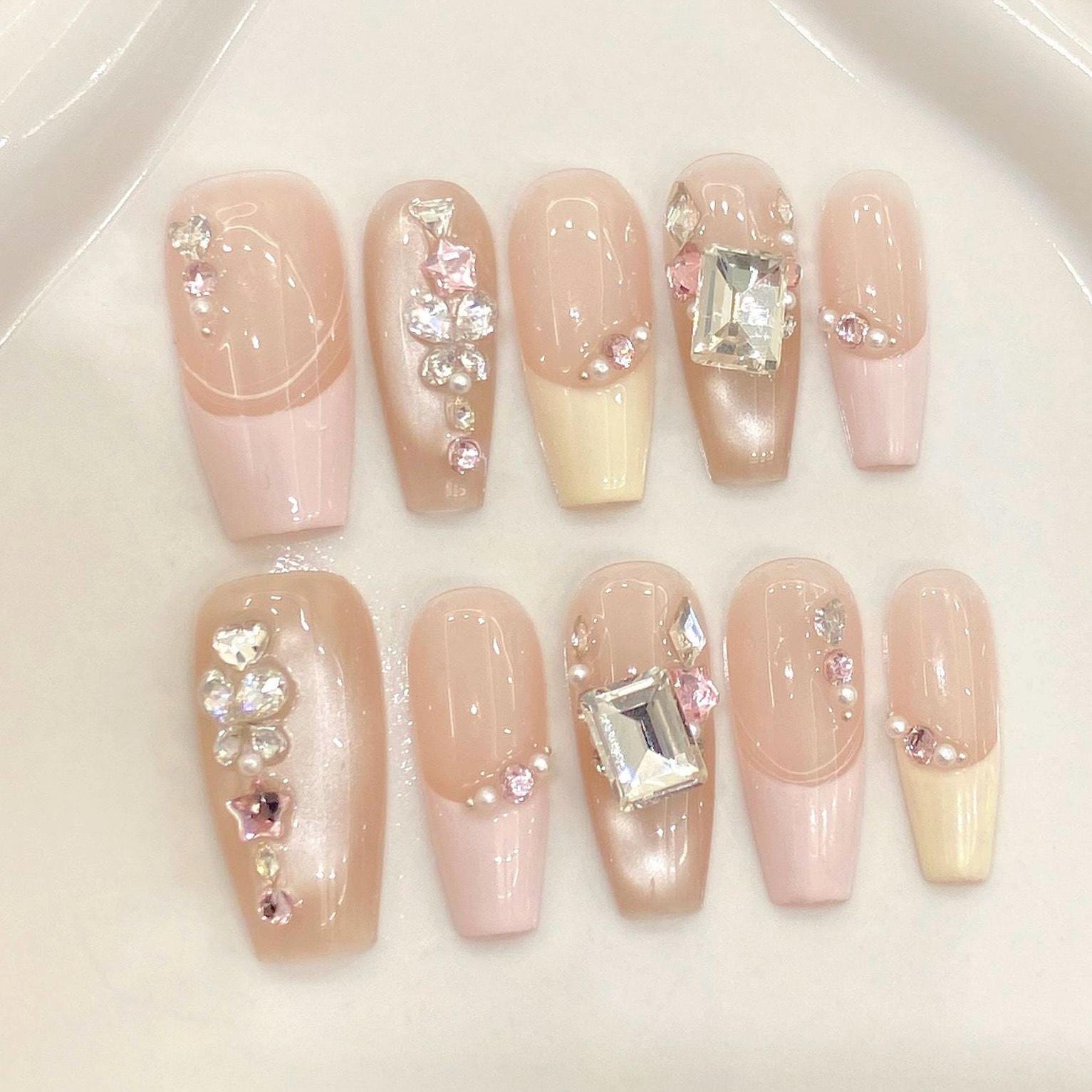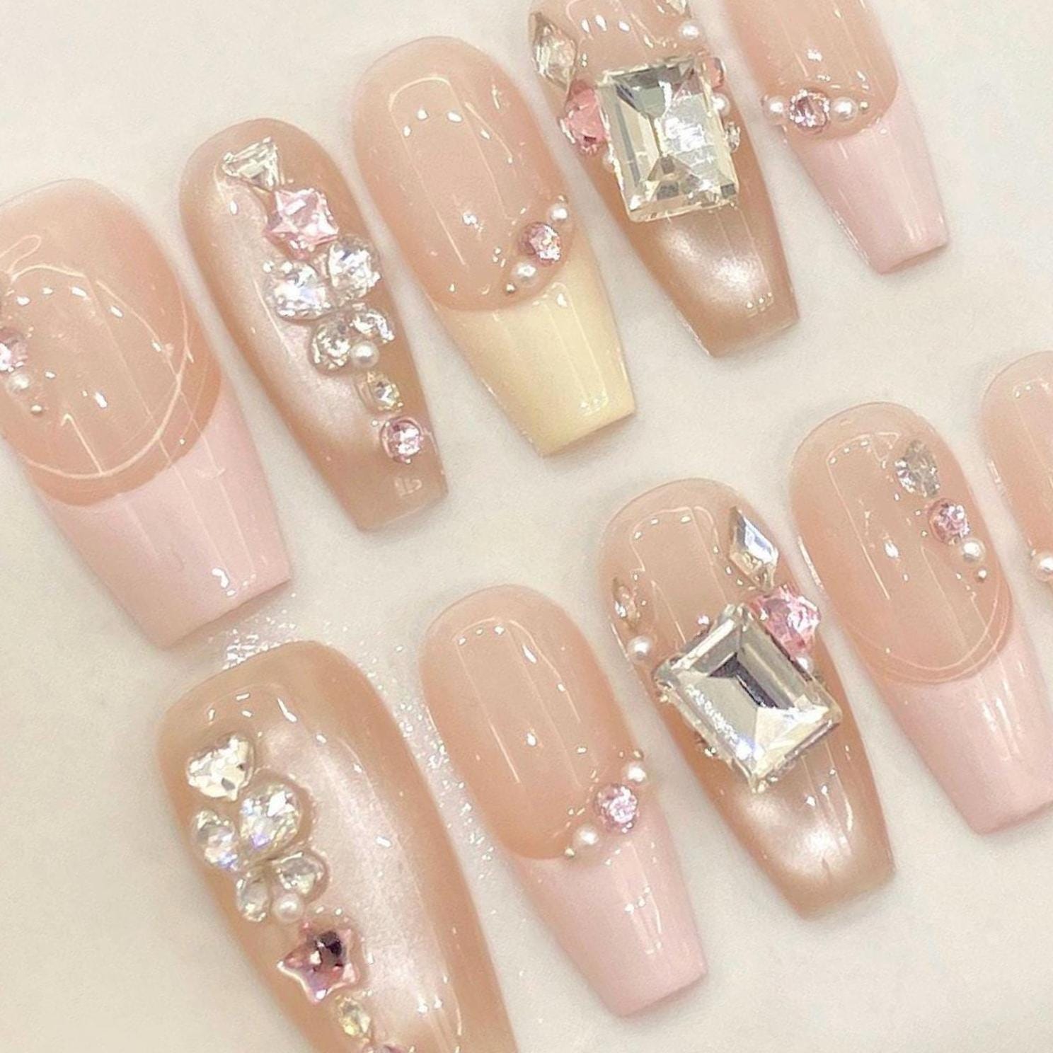 This luxurious press-on nail set features a chic blend of nude, blush pink, and champagne hues, elegantly paired with glossy finishes and French tip-inspired accents. Each nail is uniquely adorned with a dazzling arrangement of rhinestones, pearls, and crystals—ranging from delicate heart gems to statement-cut stones. The soft neutral tones and squared-off silhouette make this set perfect for formal occasions, bridal wear, or elevating your everyday style with a refined sparkle. Reusable and easy to apply, these press-ons bring salon-quality glam straight to your fingertips.