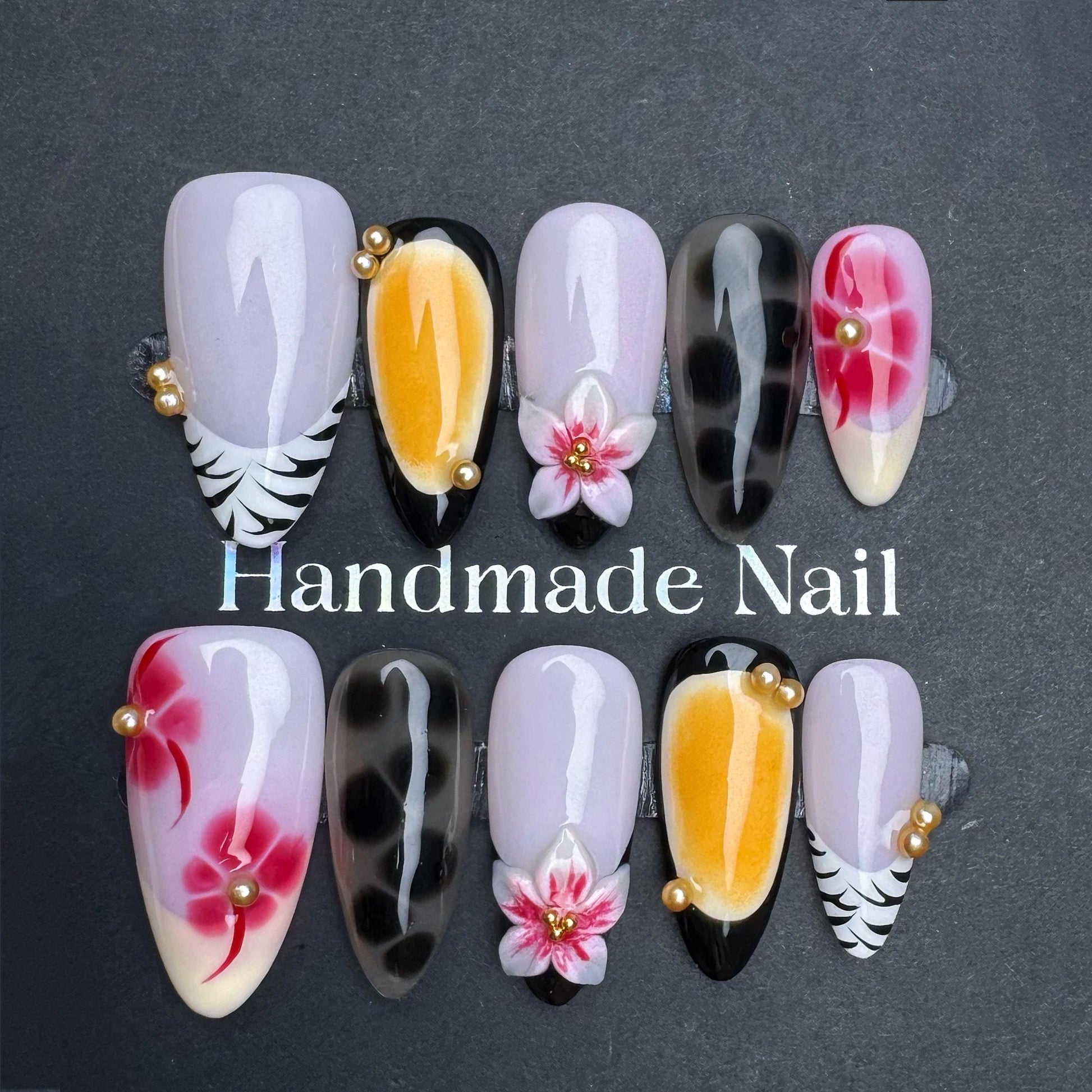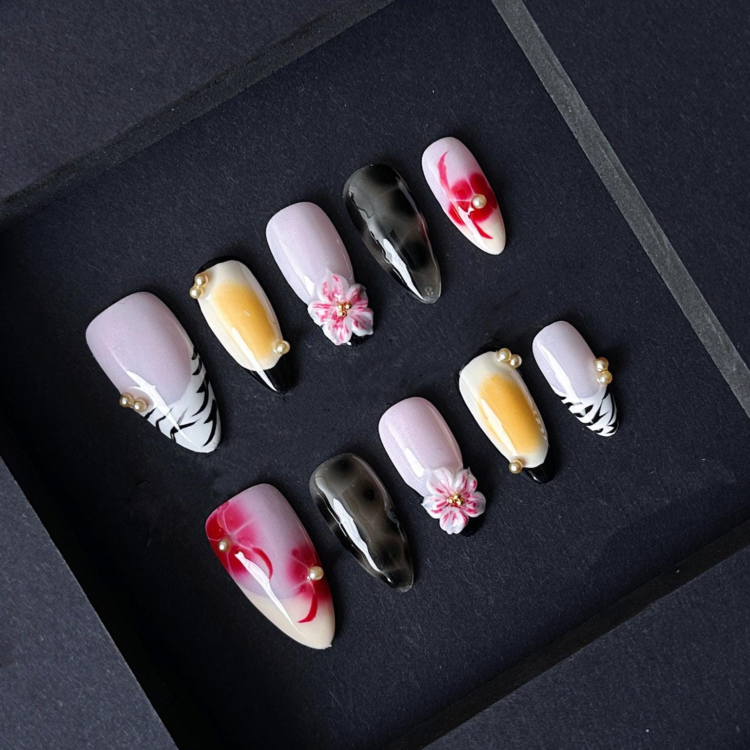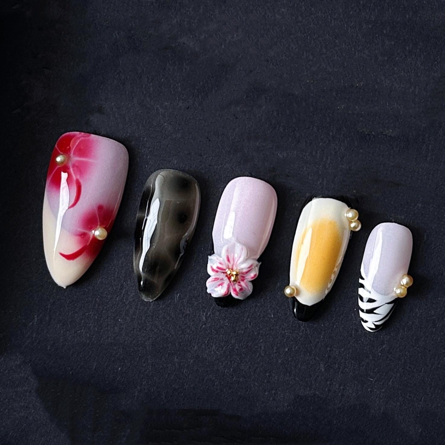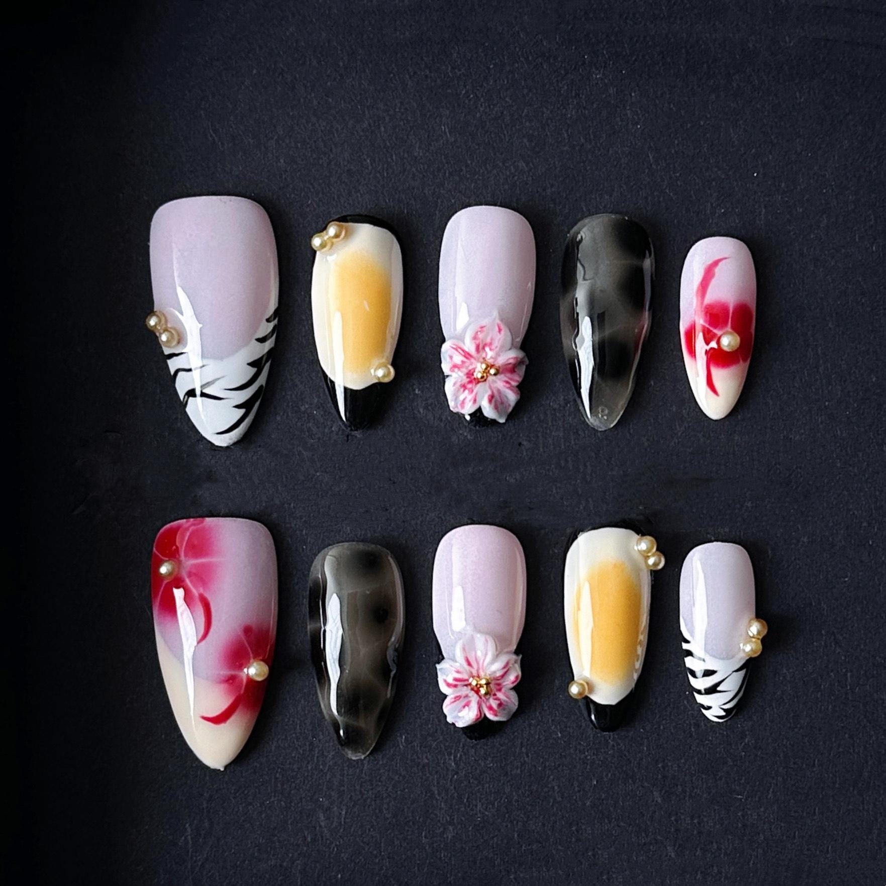 This uniquely artistic press-on nail set blends eastern floral elegance with bold modern accents. Featuring soft pink and ivory ombre bases, hand-painted cherry blossoms, zebra-striped tips, and glossy black and gold gradients, each nail is adorned with delicate pearl embellishments for a refined finish. The layered 3D floral accents and abstract brushstroke effects bring this set to life, offering a fashionable fusion of nature and statement edge. Perfect for special occasions, seasonal transitions, or artistic everyday flair.