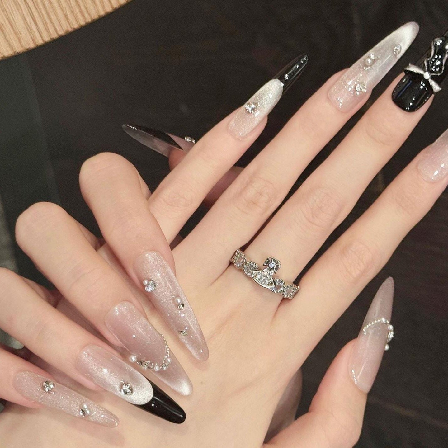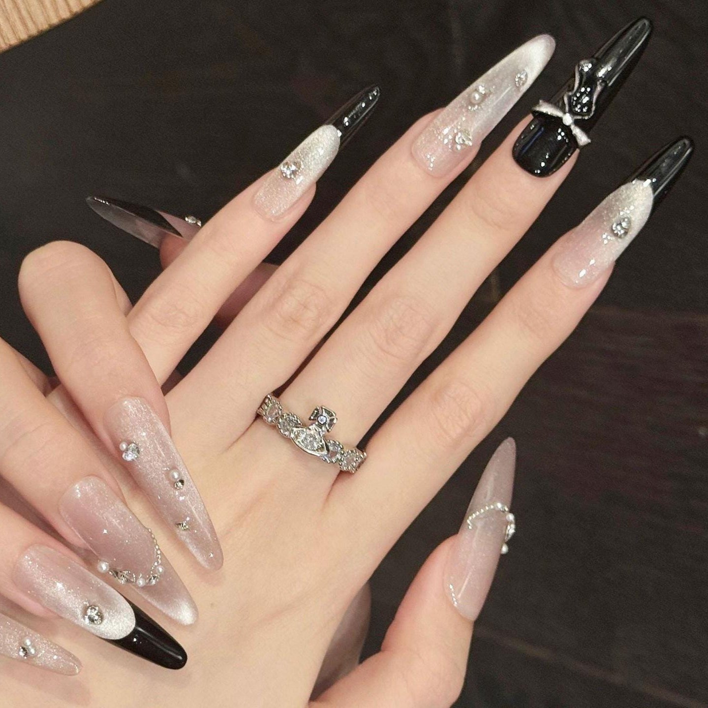 Elegant Pearl & Bow Press-On Nails – Nude Black Glam French Set glue on artificial long stiletto 3d embellishments rhinestone nail art