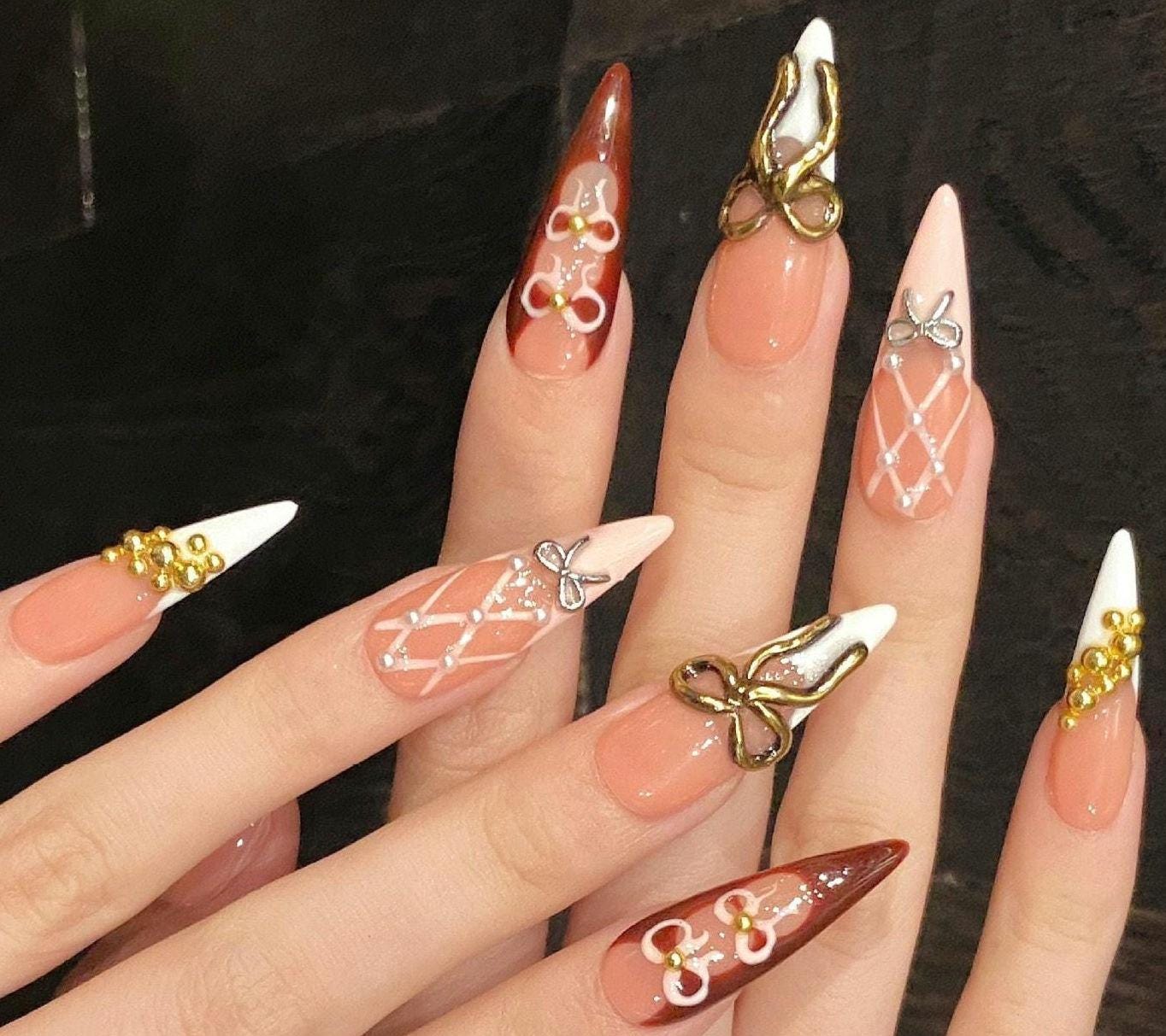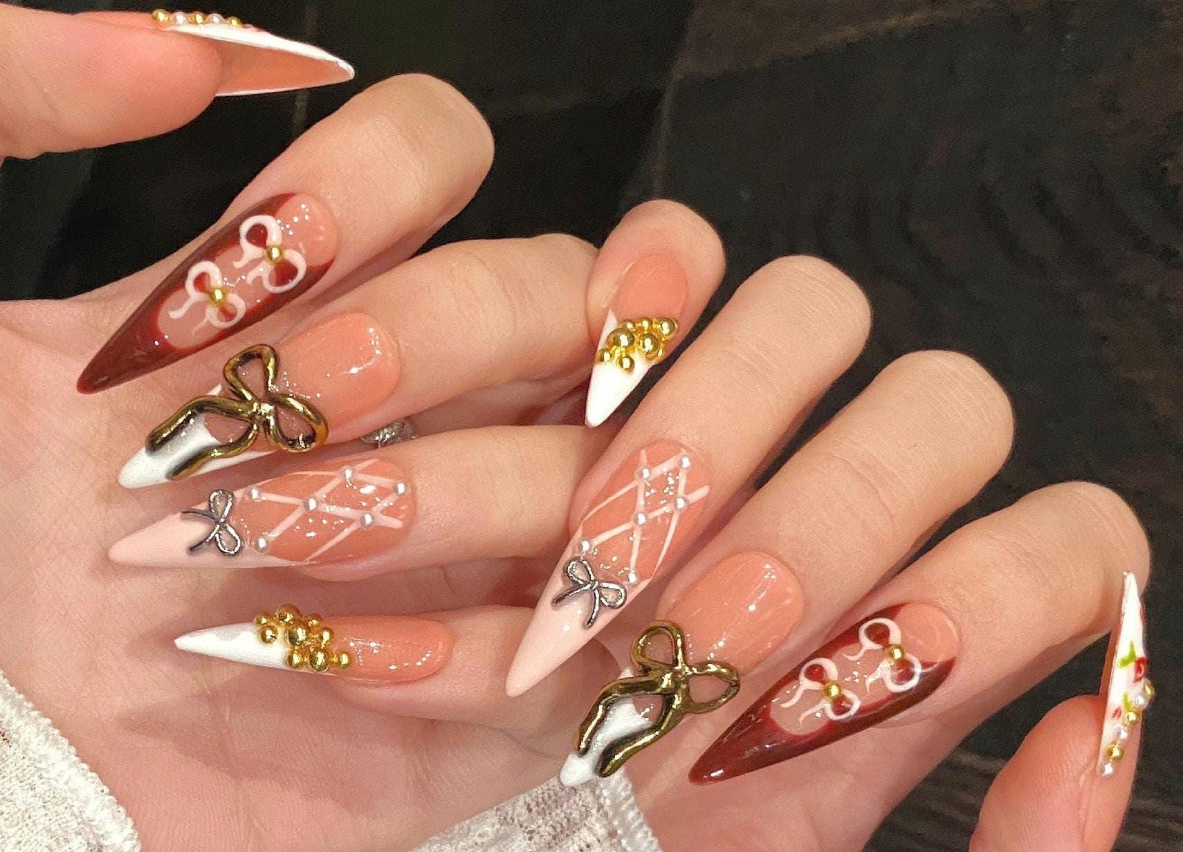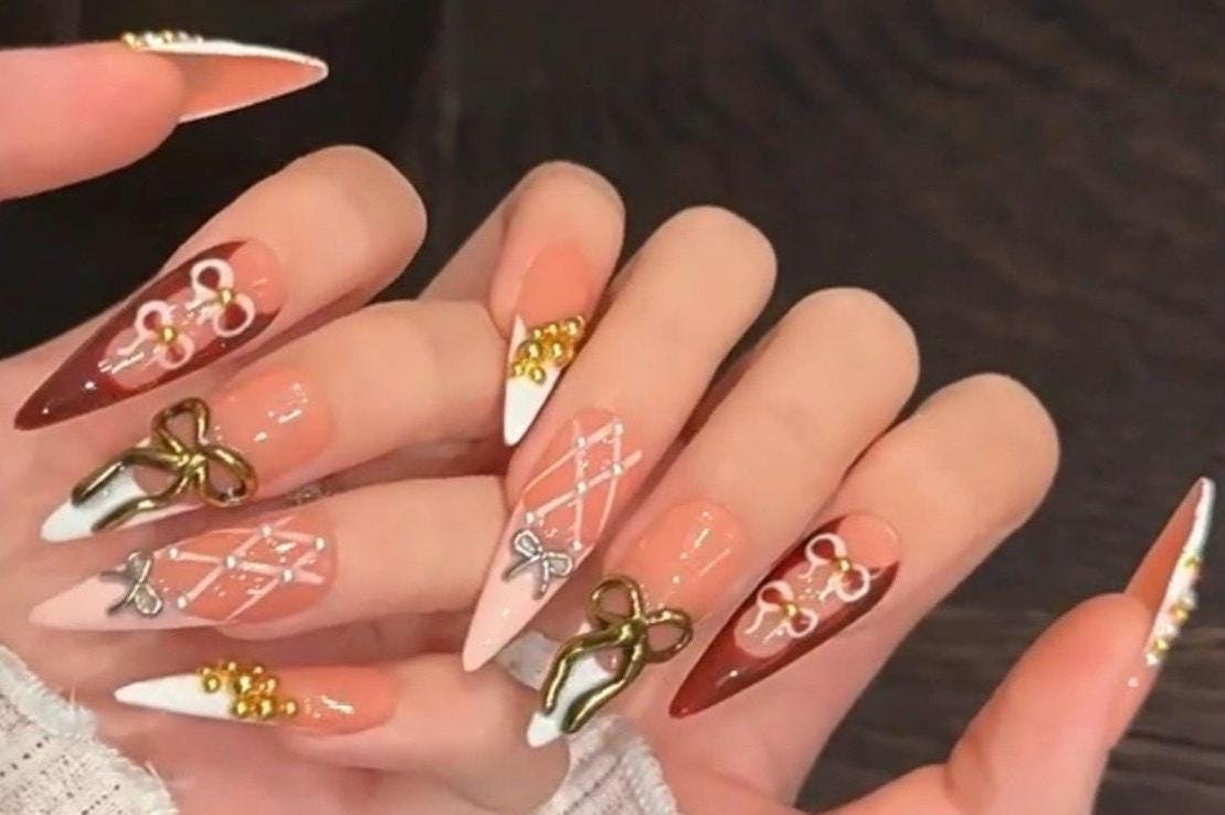 Add a romantic, couture touch to your nails with this handcrafted press-on nail set featuring 3D gold and silver bows, pearl beading, rose accents, and crisscross ribbon detailing. A soft pink base is paired with burgundy and white tips for a graceful, feminine finish. Ideal for weddings, bridal showers, anniversaries, or any elegant occasion.