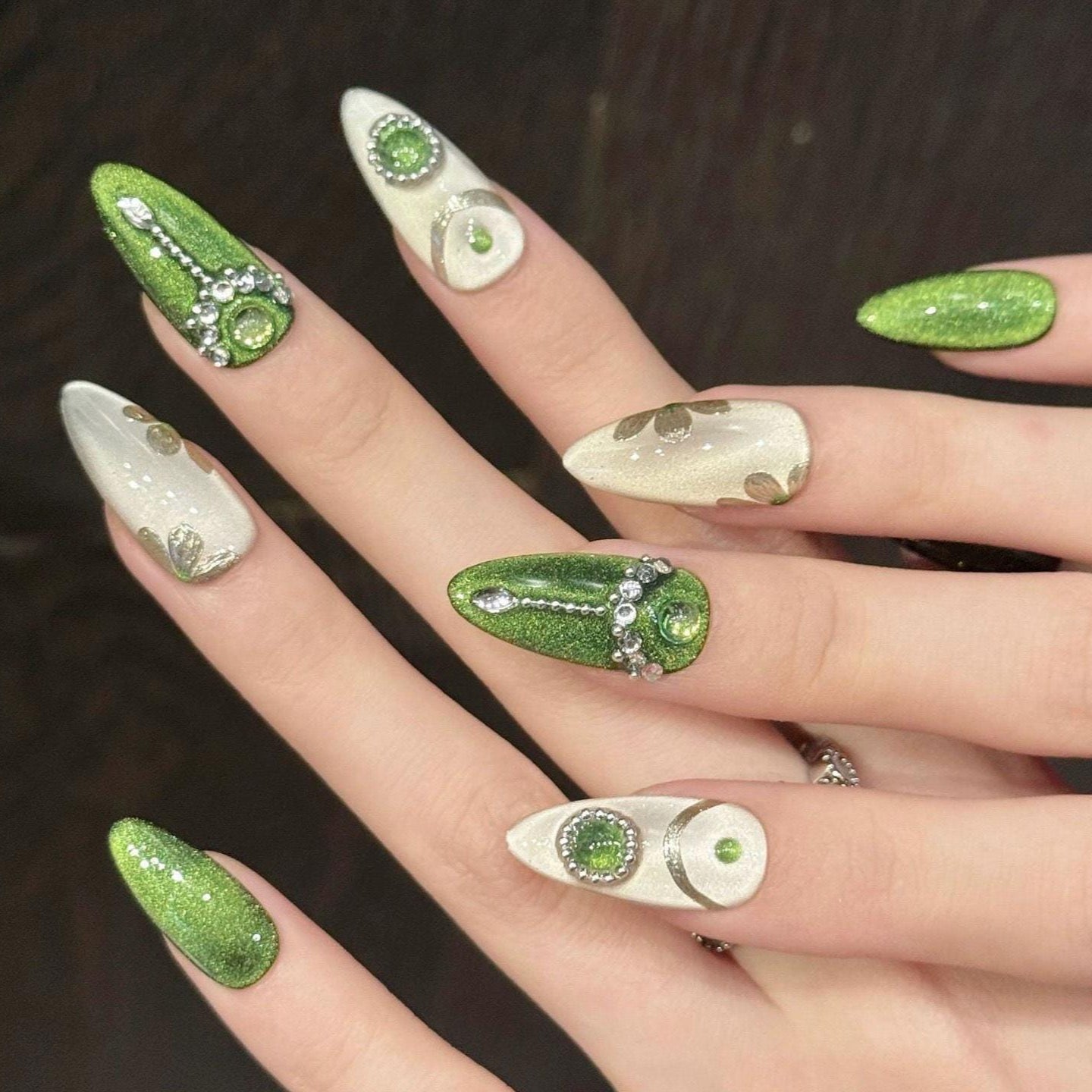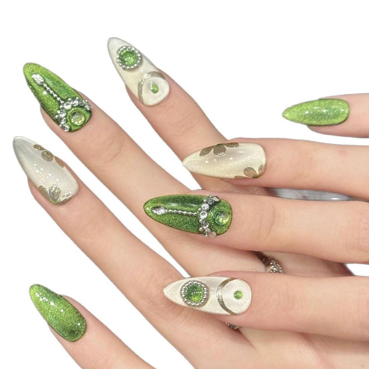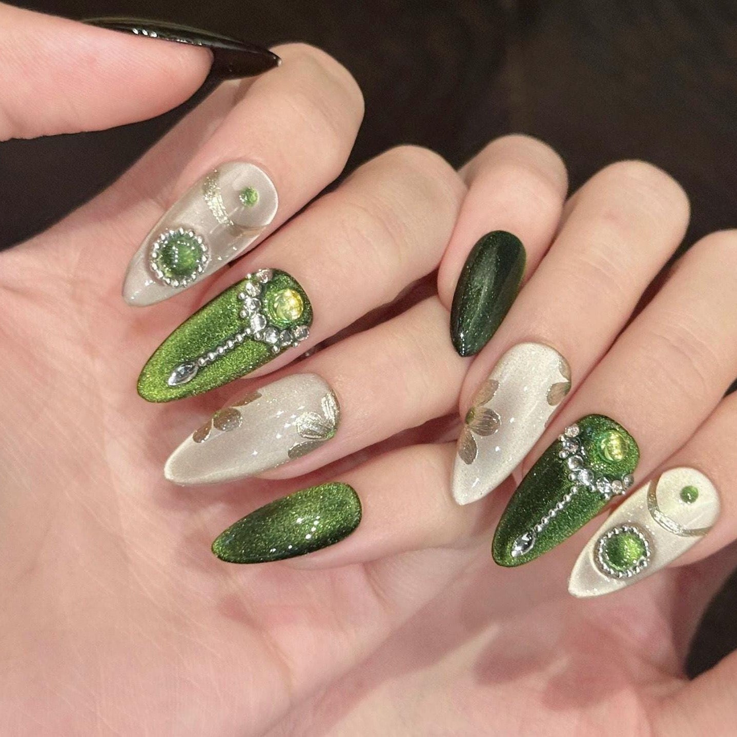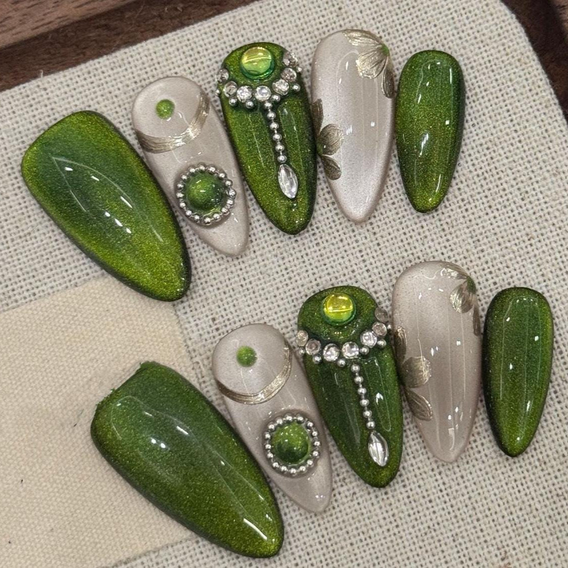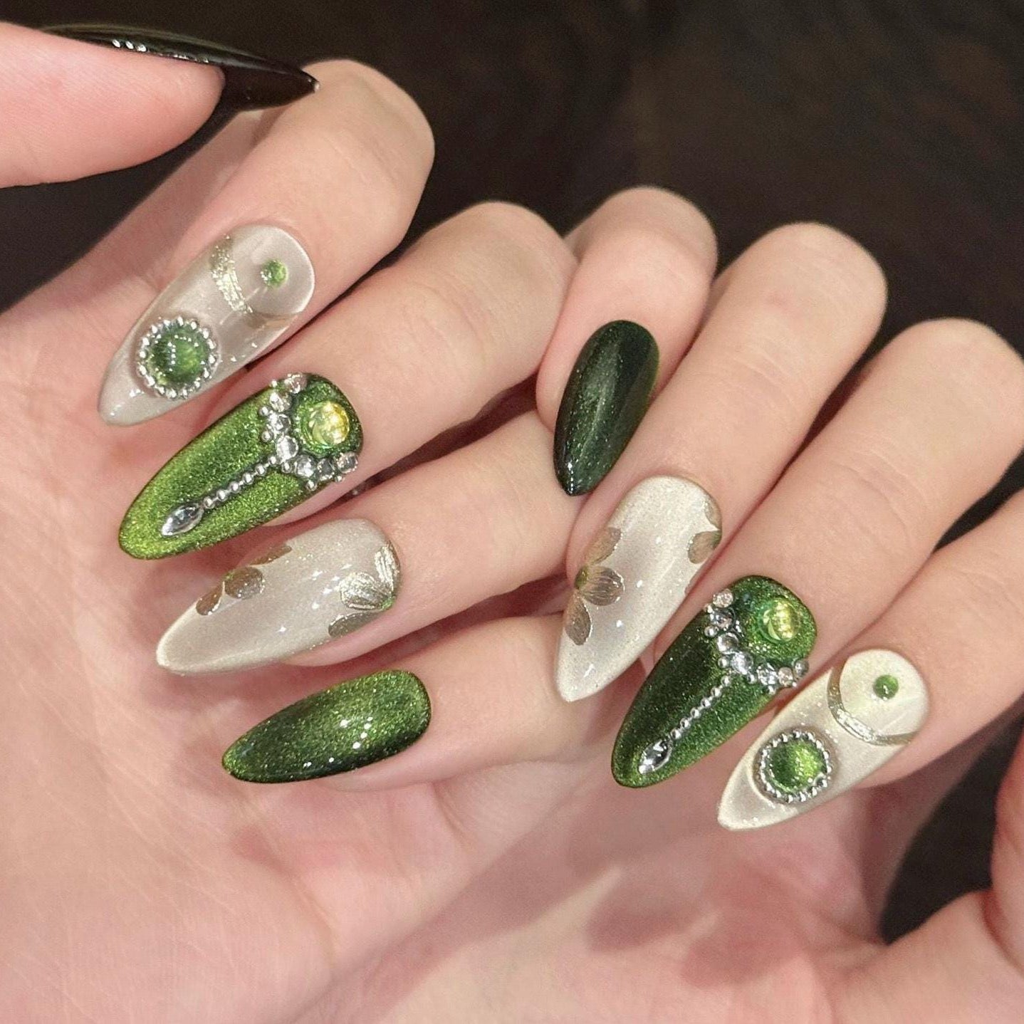 This luxe press-on nail set features a dazzling blend of deep emerald green, champagne shimmer, and ornate rhinestone and gem accents. A regal, vintage-inspired design for elegant events or goddess-level glam.