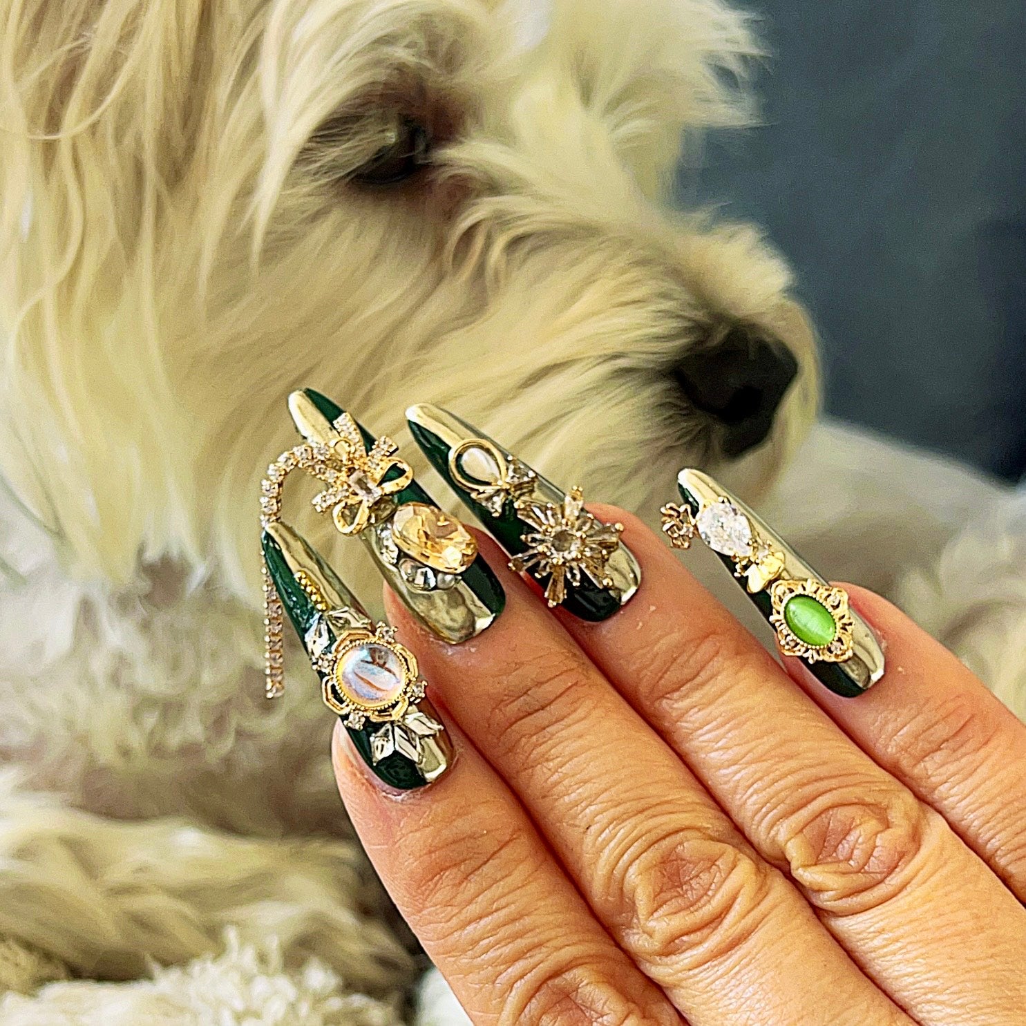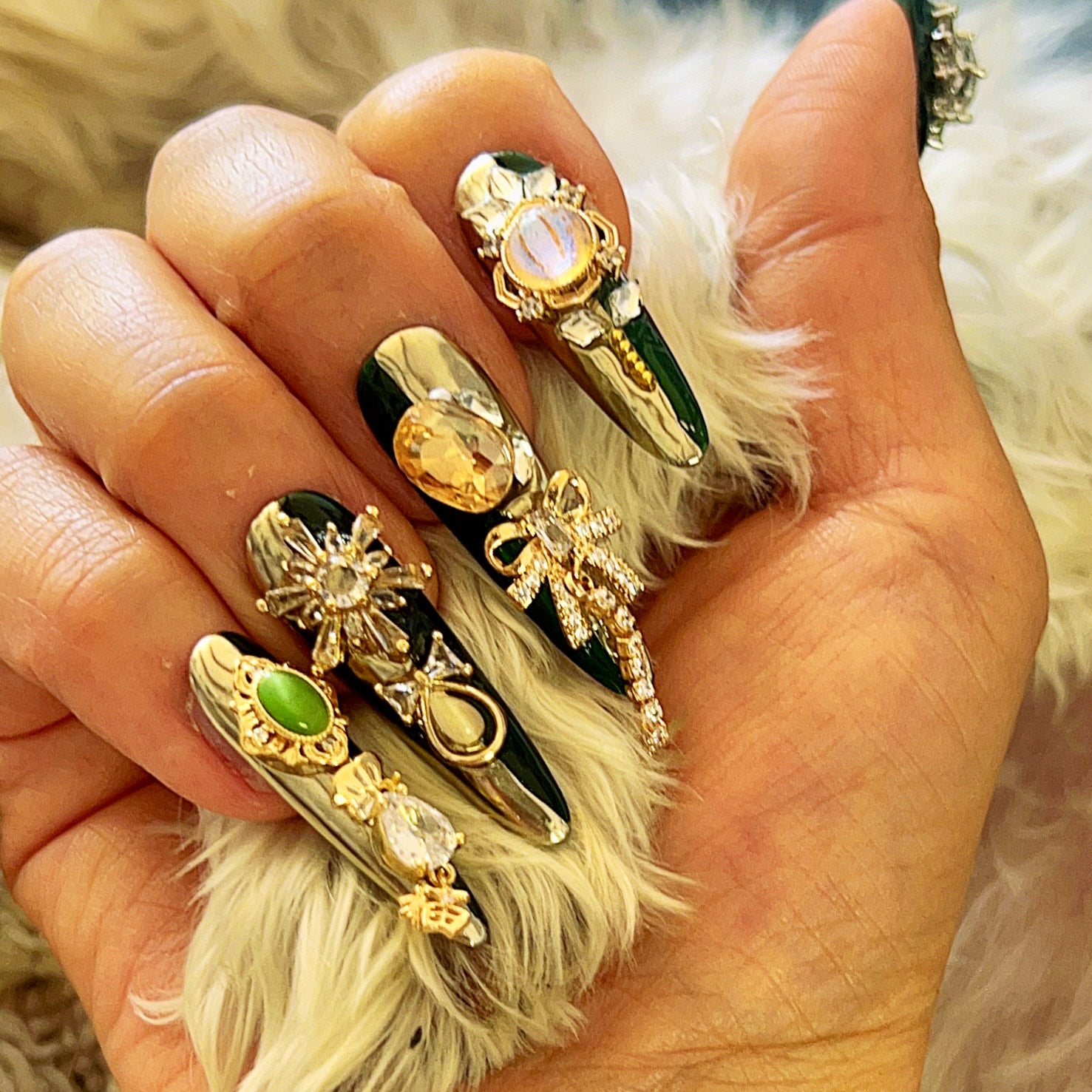 Elevate your nail game with this opulent set of emerald and gold press-on nails, featuring dazzling 3D crystal embellishments and extravagant gemstone details. Rich green and gleaming gold create a sophisticated base, adorned with ornate charms including bows, flowers, pearls, and vintage-inspired settings. The striking combination of teardrop gems, faceted stones, and golden chain links gives each nail a bold, regal feel. Perfect for holiday parties, formal events, or glam photoshoots, these nails exude royalty and extravagance with every fingertip.