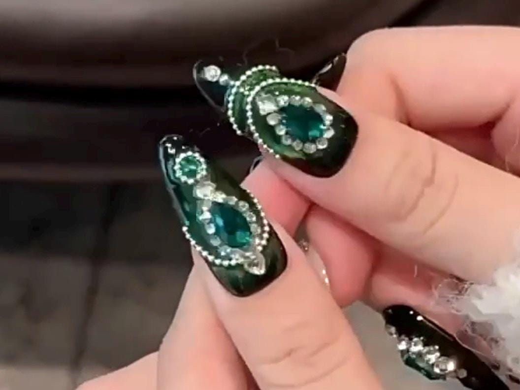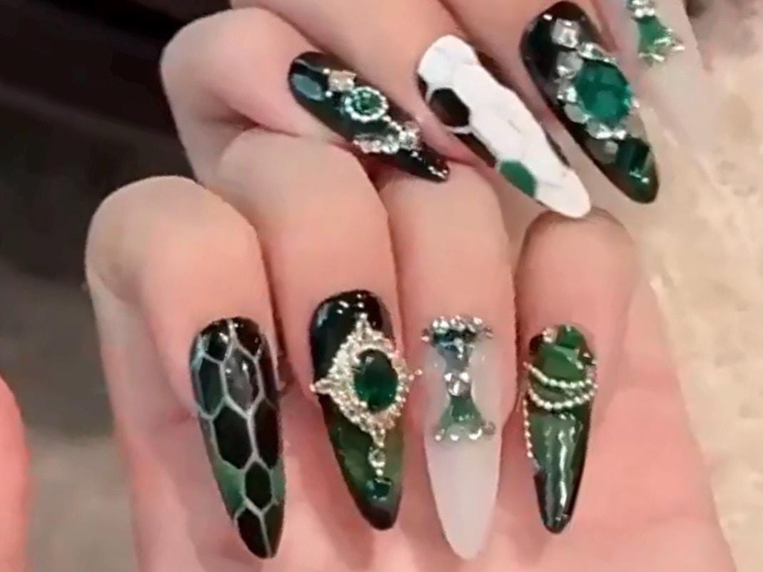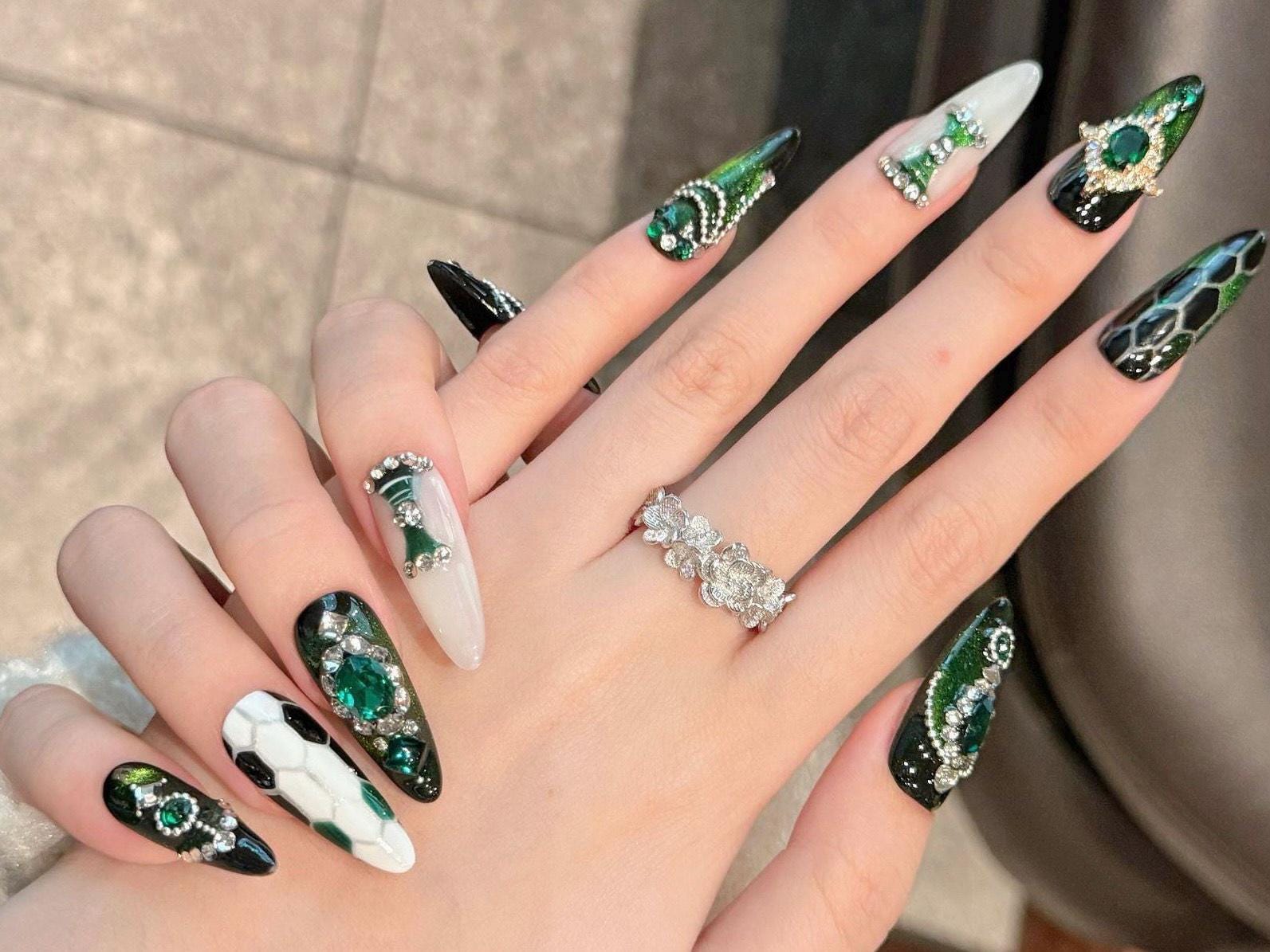 This stunning press-on nail set features a rich emerald green ombré design accented with black, white, and luxurious 3D rhinestones and jewel embellishments. With intricate gem placements and bold contrast colors, this long nail set is perfect for a glamorous night out or statement look. Each nail is handmade for precision and reusable for multiple wears.