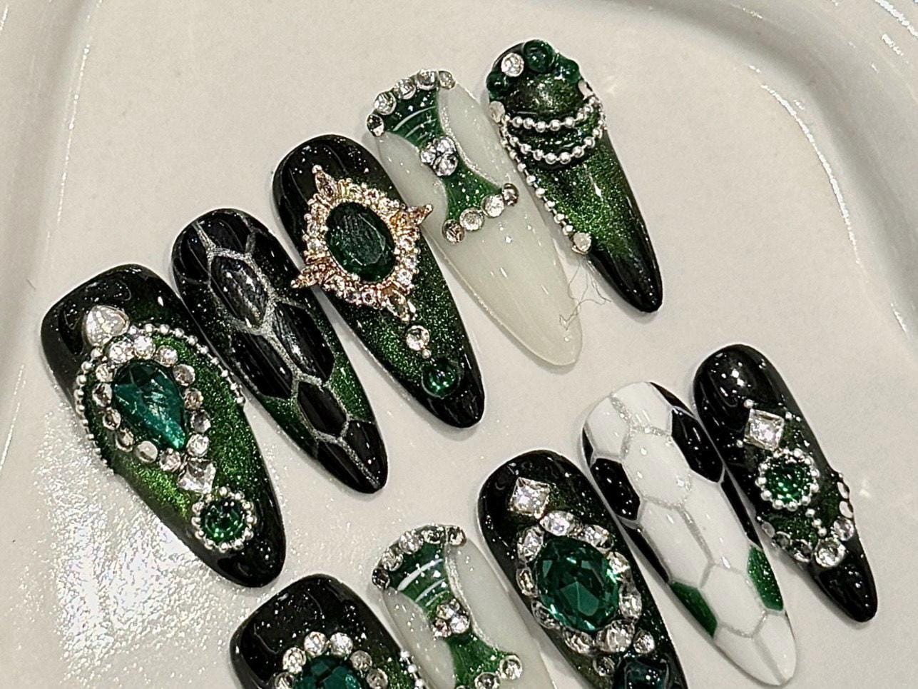 Emerald Green Black White Press On Nails with Rhinestones 3D Jewels Long Glam Nail Set Handmade Luxury Bling Ombré Statement Nails