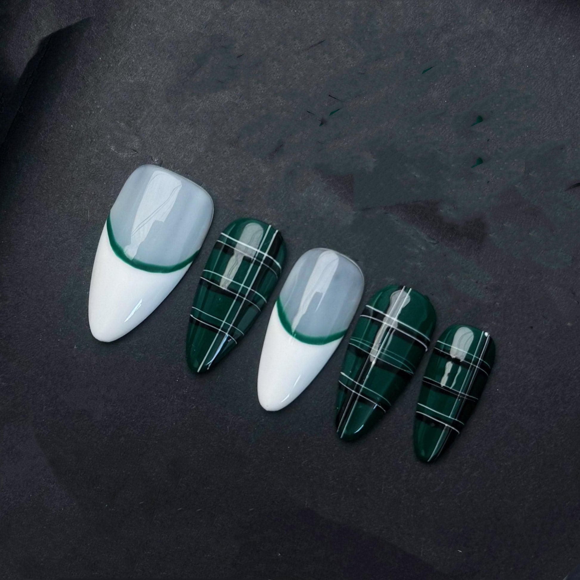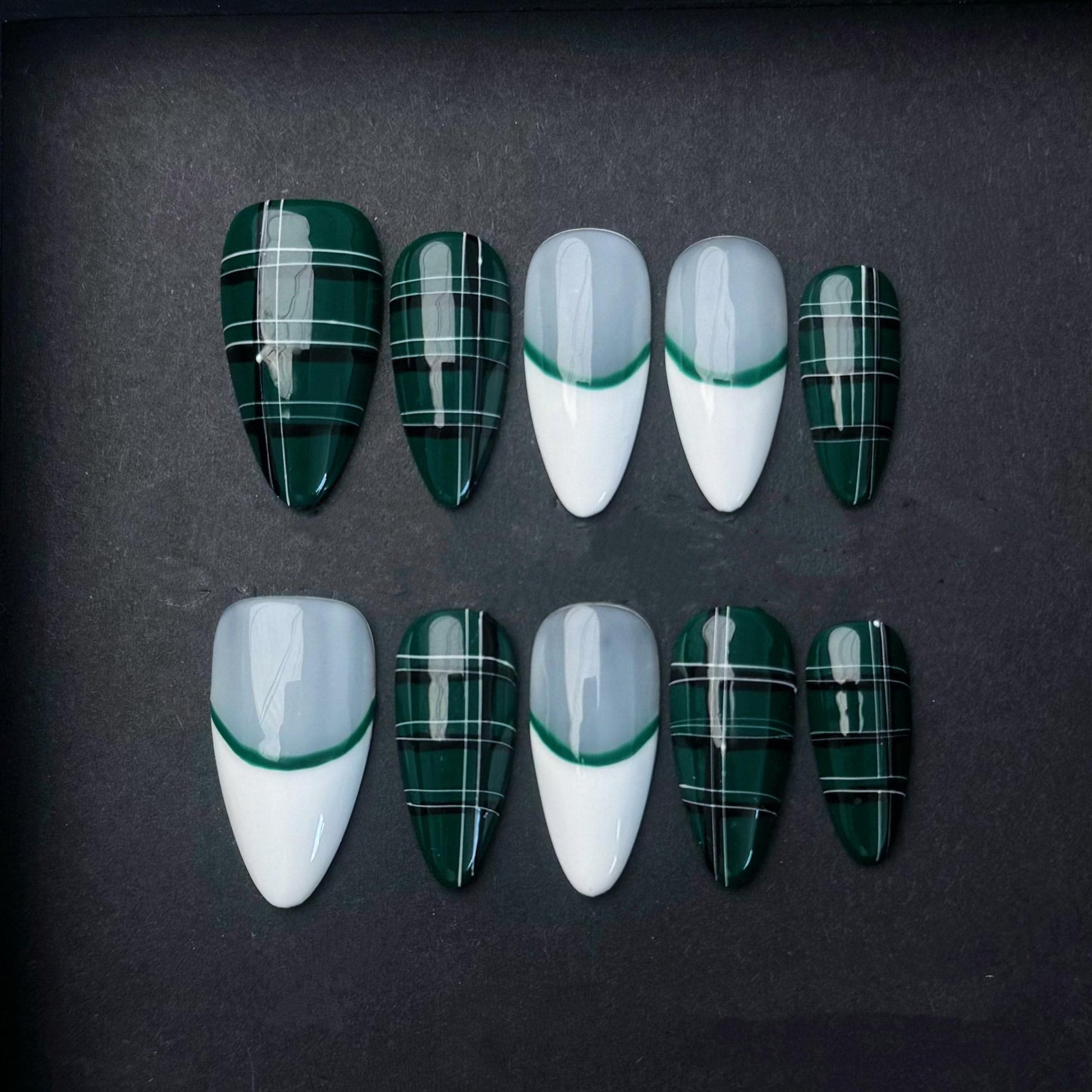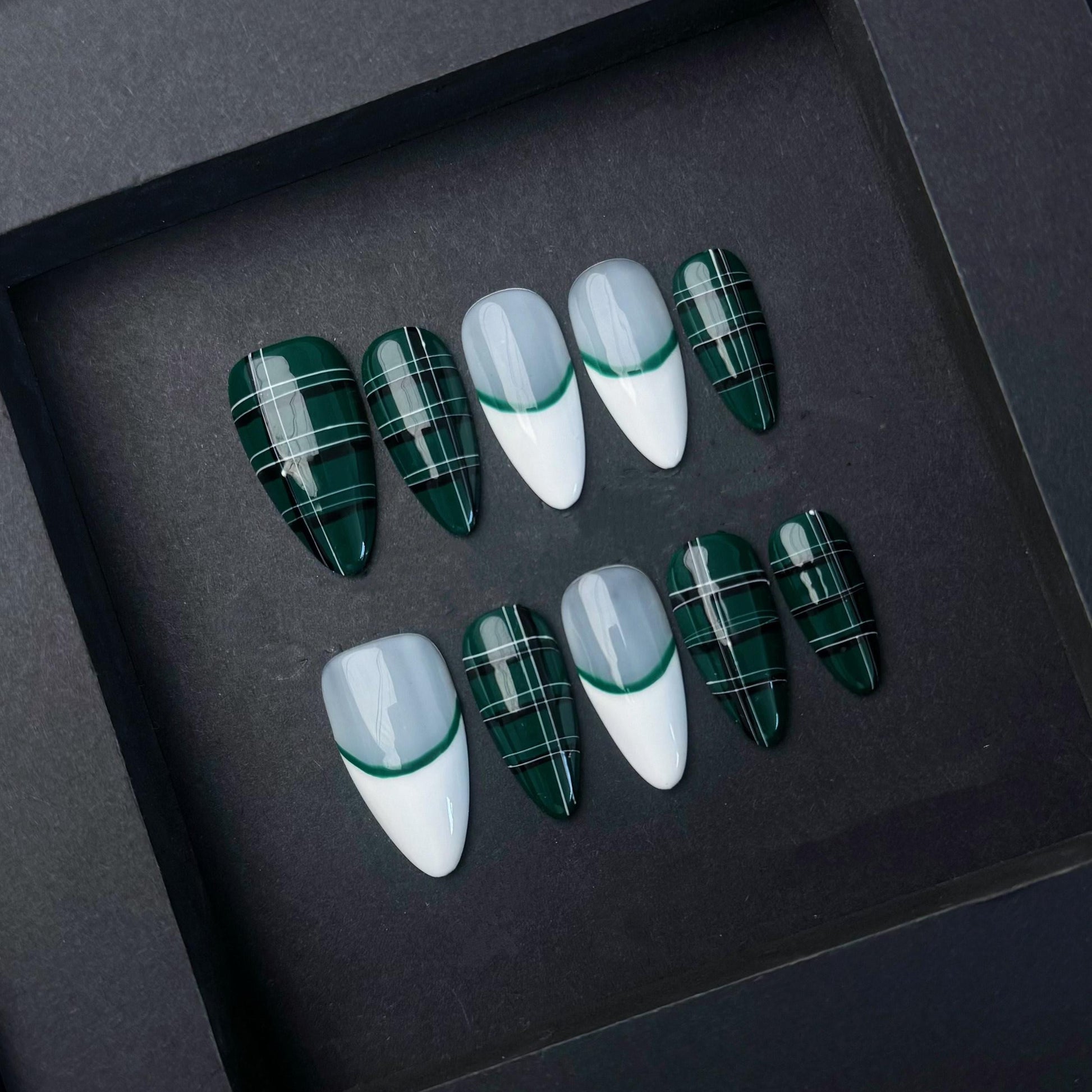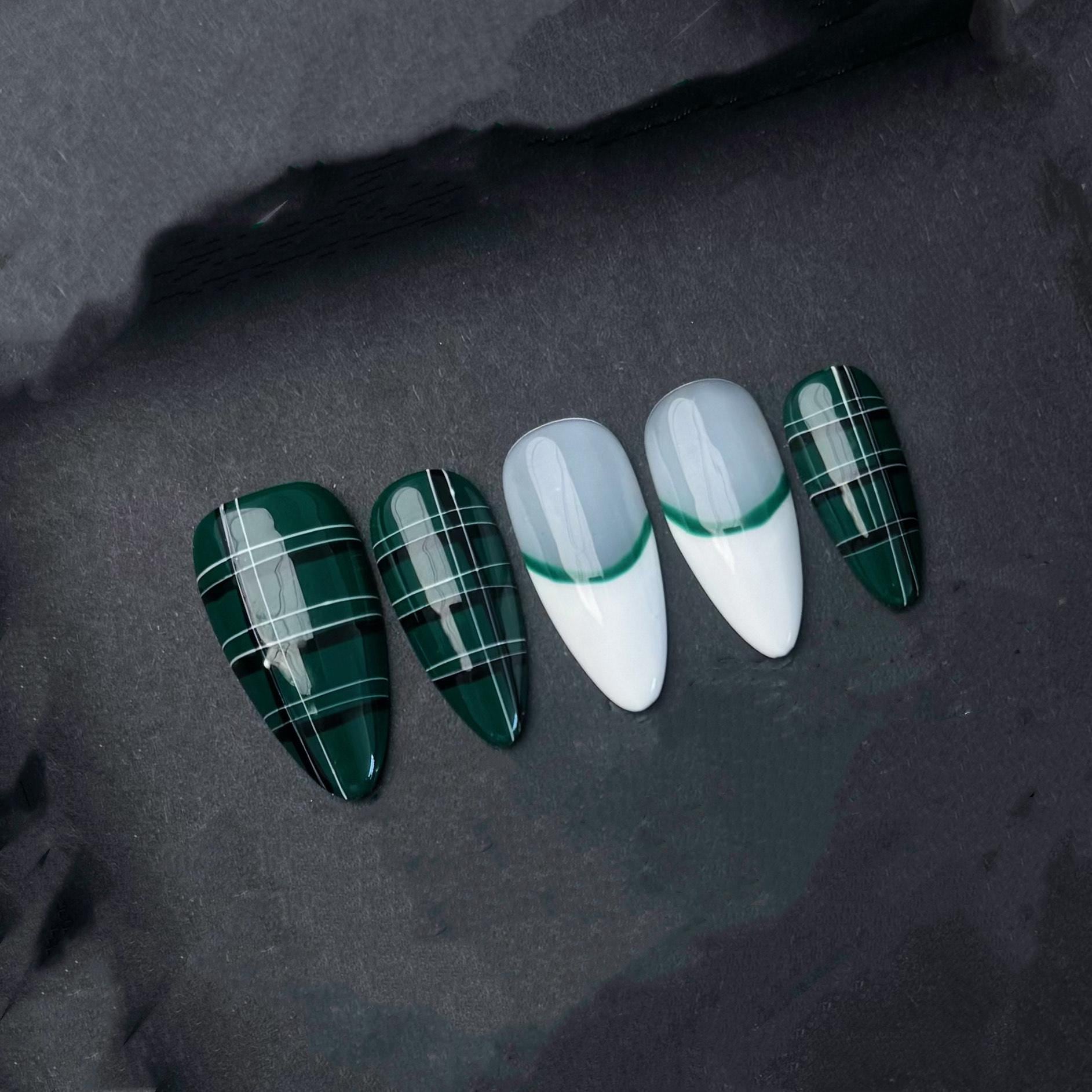 This striking press-on nail set features a bold contrast between deep emerald green and clean white. Half of the nails display an elegant green French tip on glossy white bases, while the others showcase crisp plaid striping in white and green, reminiscent of classic tartan patterns. The hand-painted precision and glossy finish lend a sleek and modern edge to this timeless design. Perfect for those who want a fashion-forward look with a touch of preppy chic, ideal for holidays, fall fashion, or stylish everyday wear.