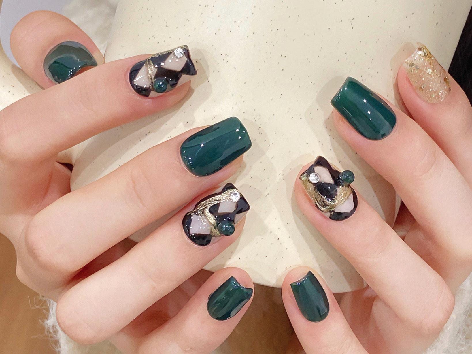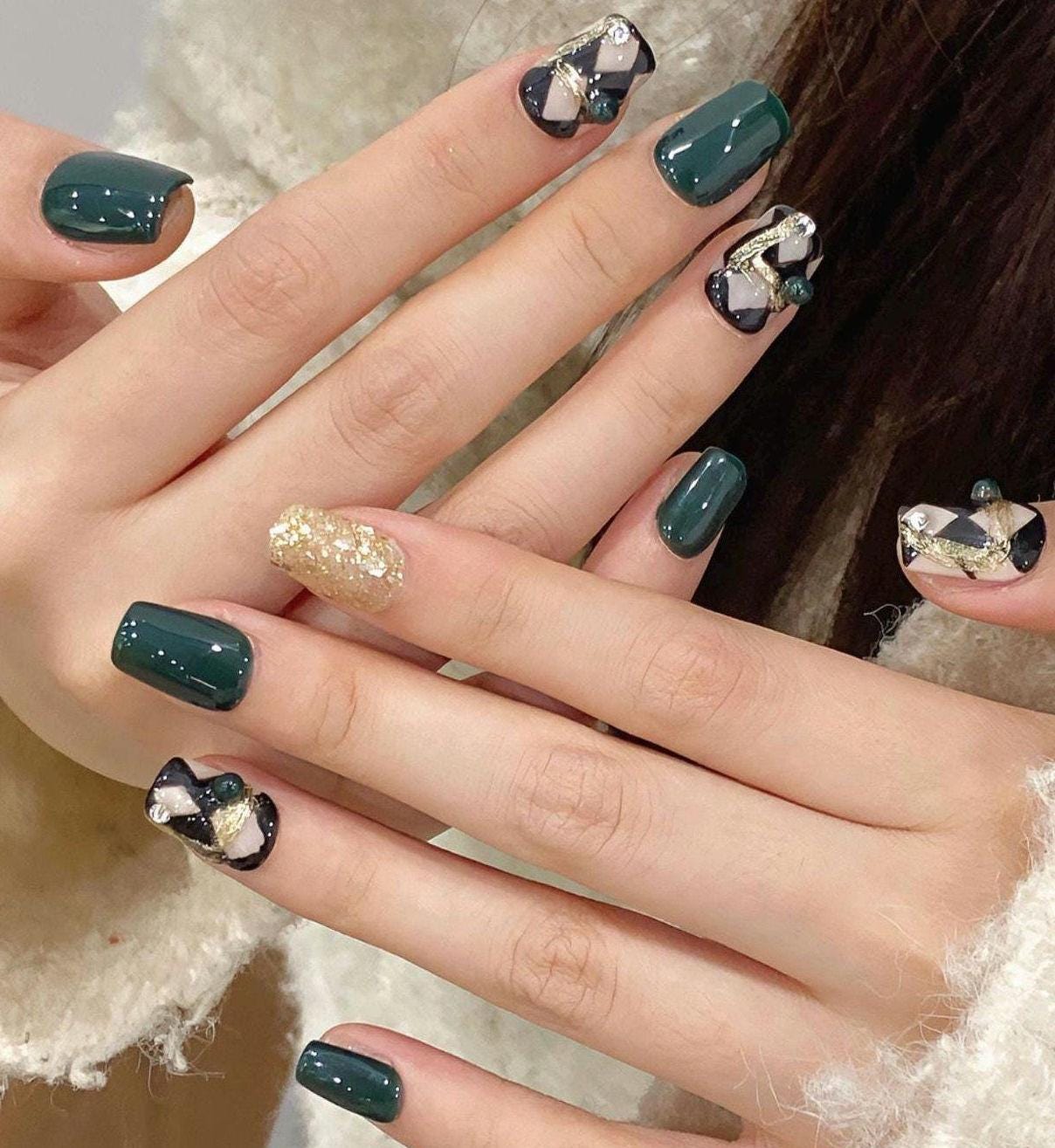 This luxurious emerald green press on nail set features a bold harlequin pattern with black and nude diamonds wrapped in gold string and crystal embellishments. Paired with solid deep green nails and a sparkling gold accent, this design blends elegance with edgy glamour. Perfect for parties, holidays or a chic everyday look.