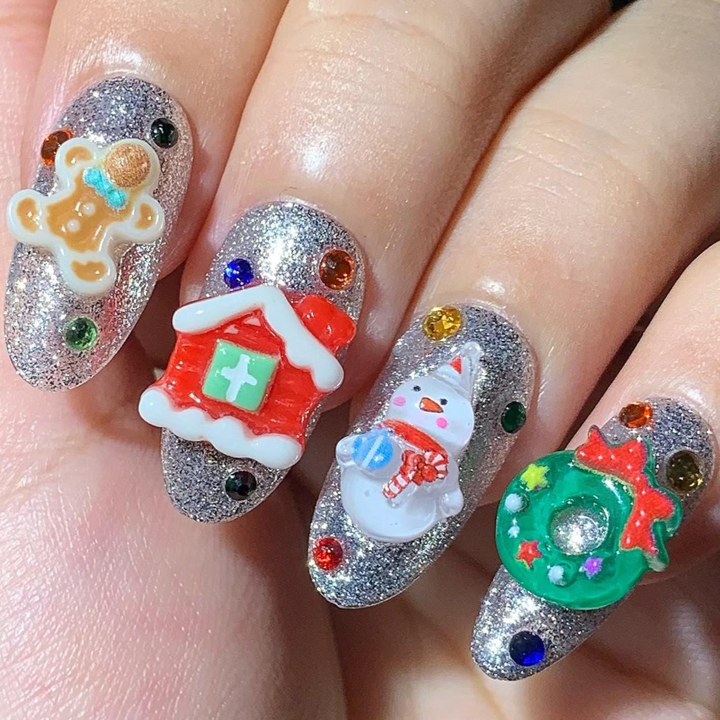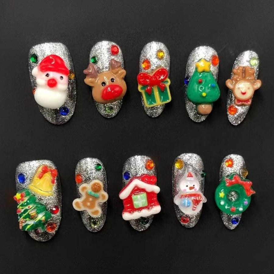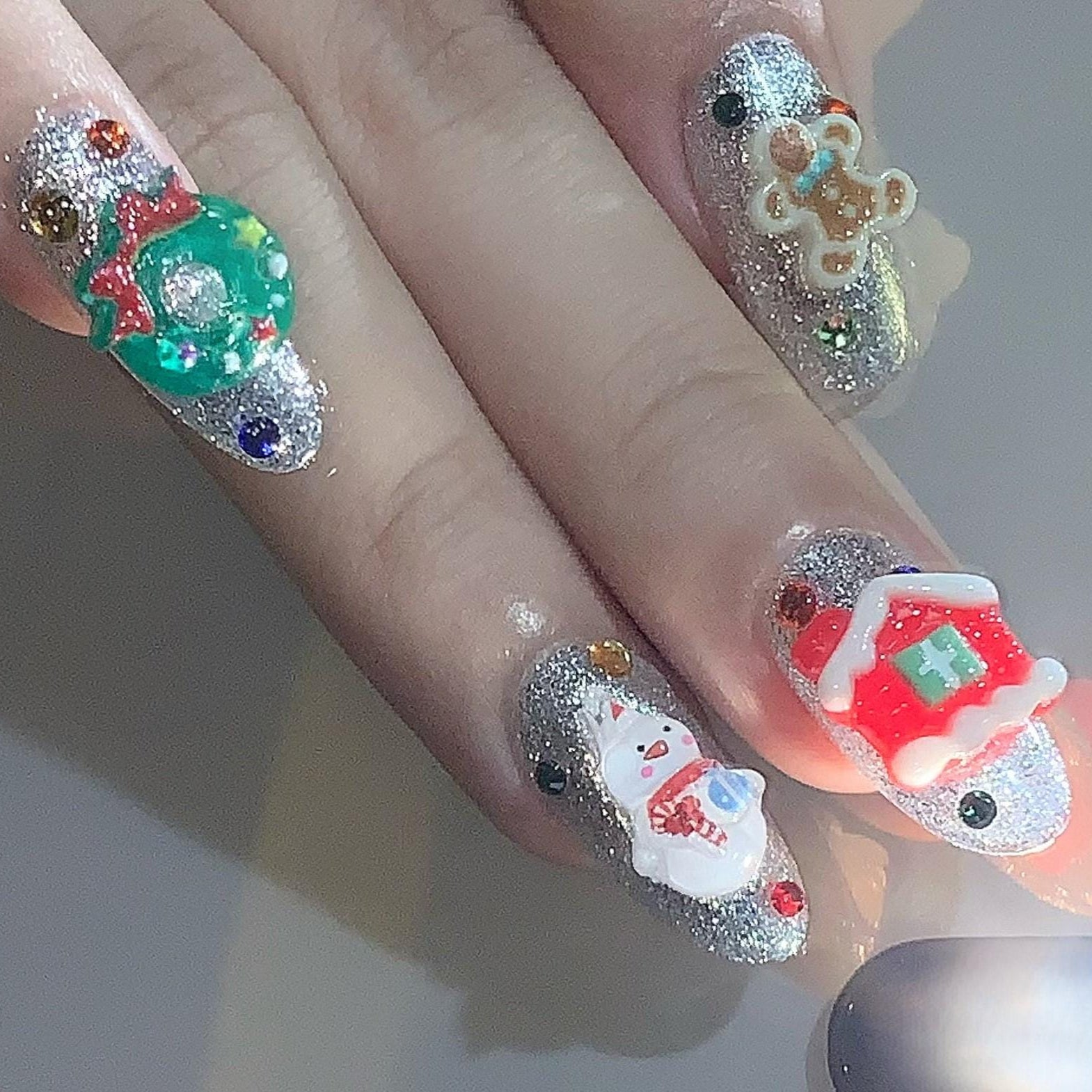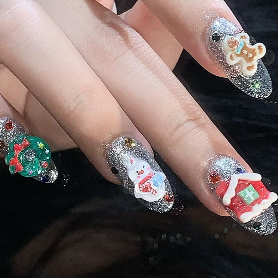 Celebrate the holiday season in sparkling style with these Christmas-themed press-on nails! Featuring a silver glitter base adorned with colorful rhinestones and 3D festive charms—like gingerbread men, snowmen, wreaths, and Santa's gift house—this set is a cheerful, eye-catching addition to any winter wardrobe. Perfect for Christmas parties, gifts, or spreading holiday joy!