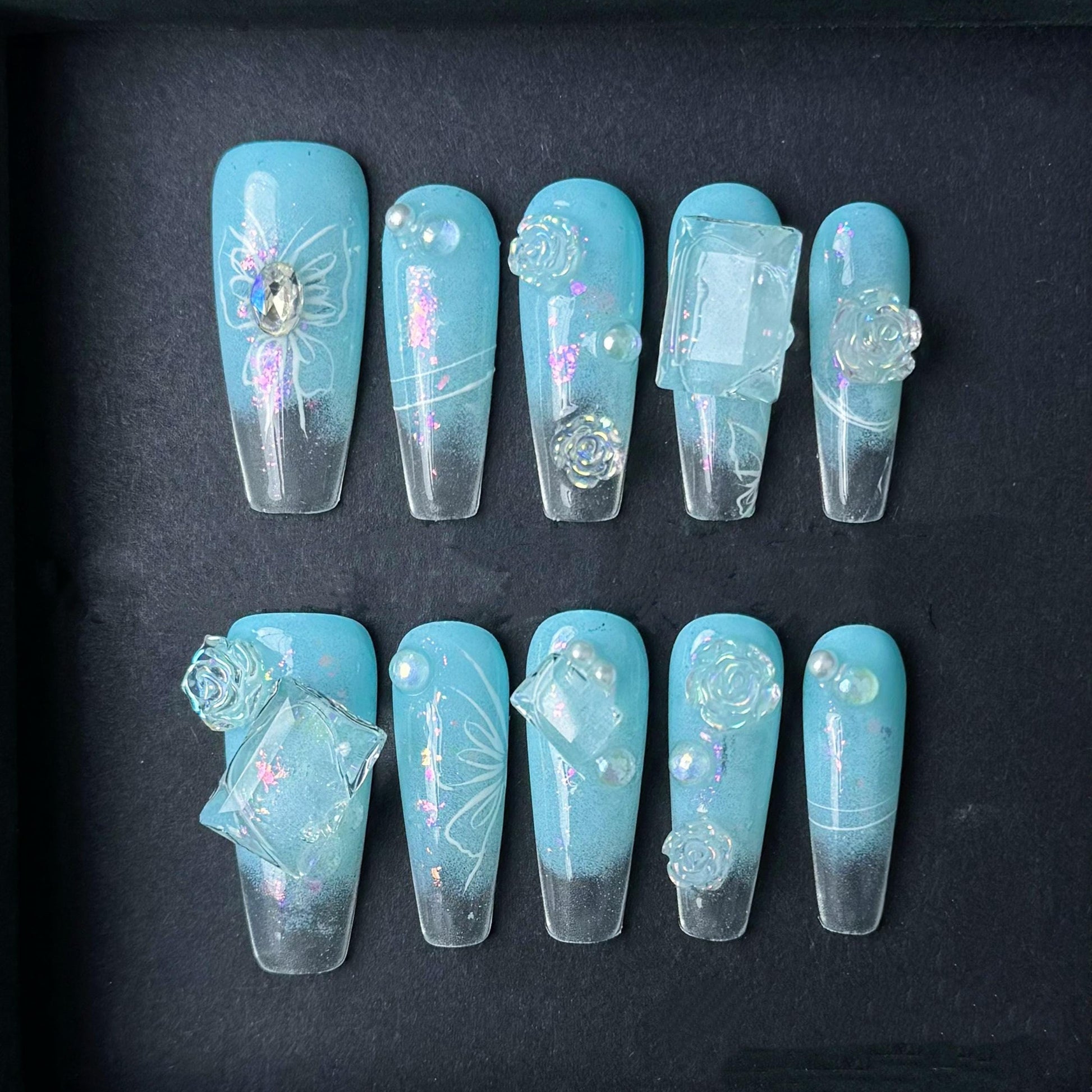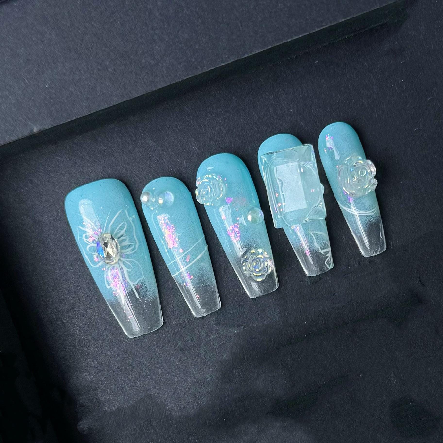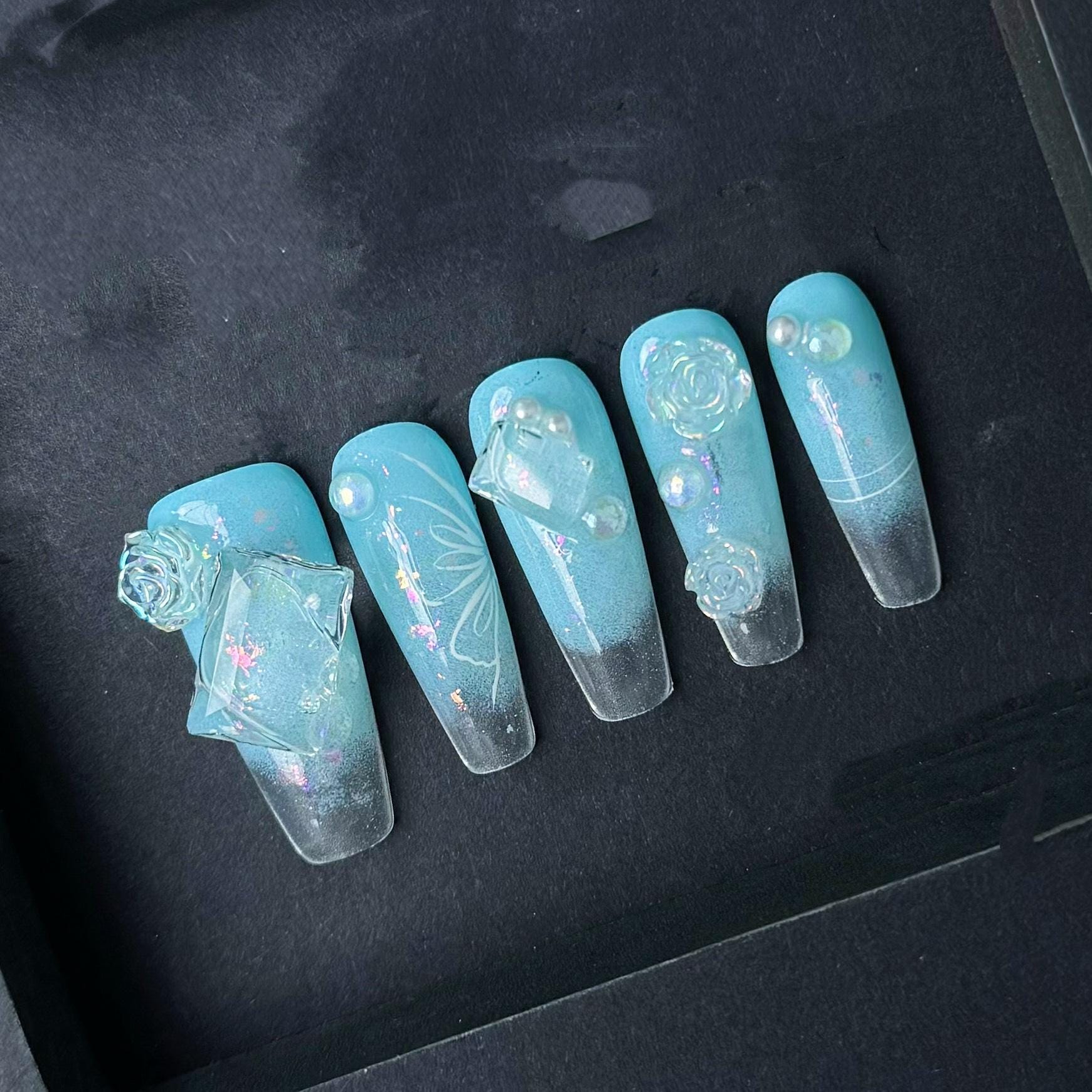 This enchanting press on nail set features a frosty blue to clear ombre base with sparkling iridescent glitter 3d floral accents pearl touches and sculpted crystal charms. Perfect for winter weddings fairytale lovers or anyone who adores an elegant frozen inspired look.
