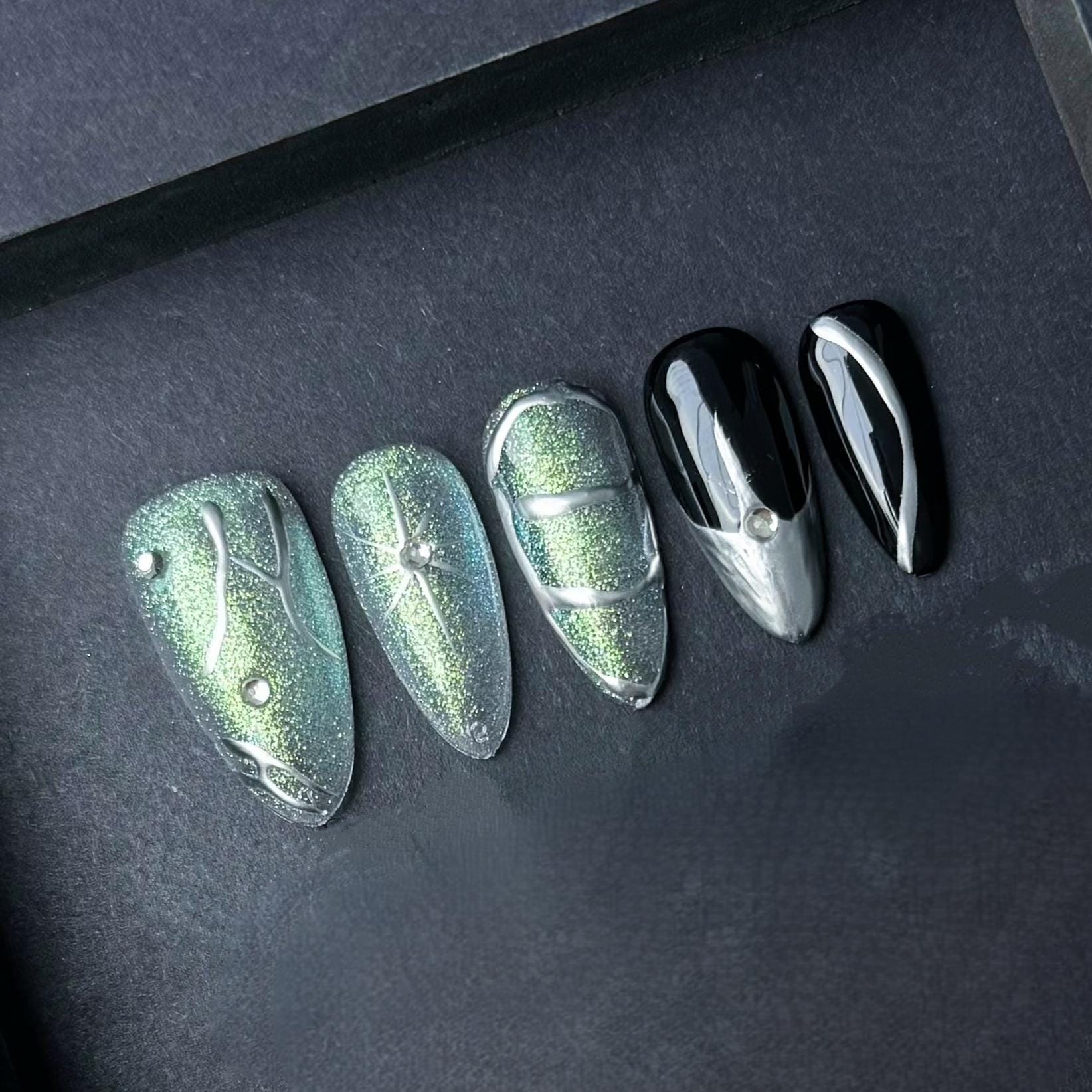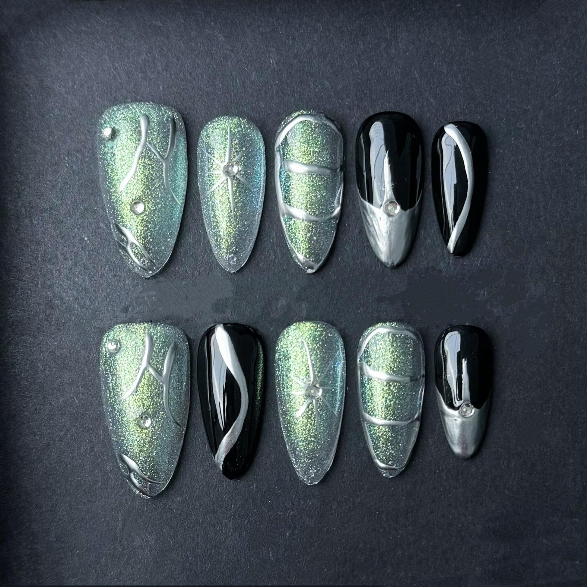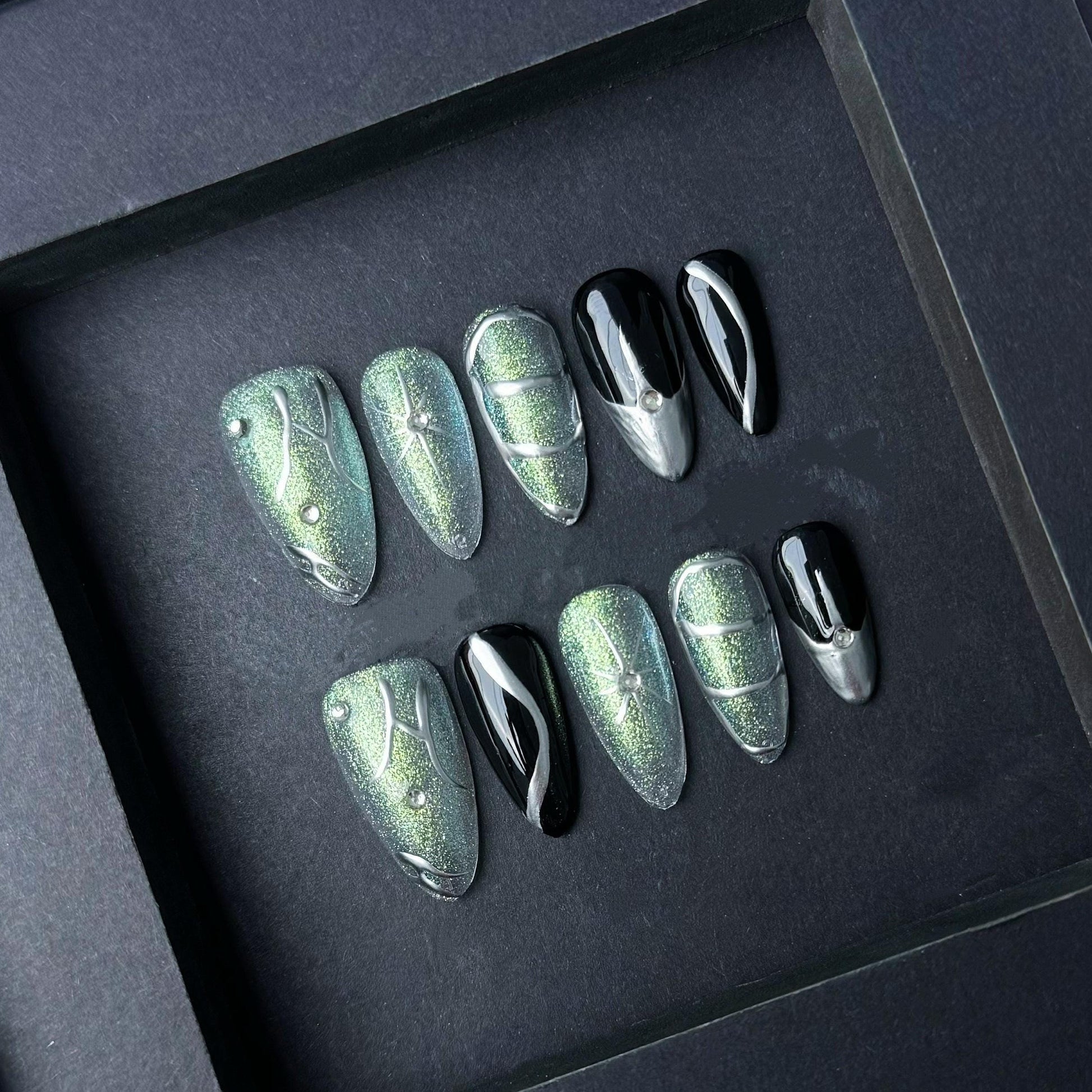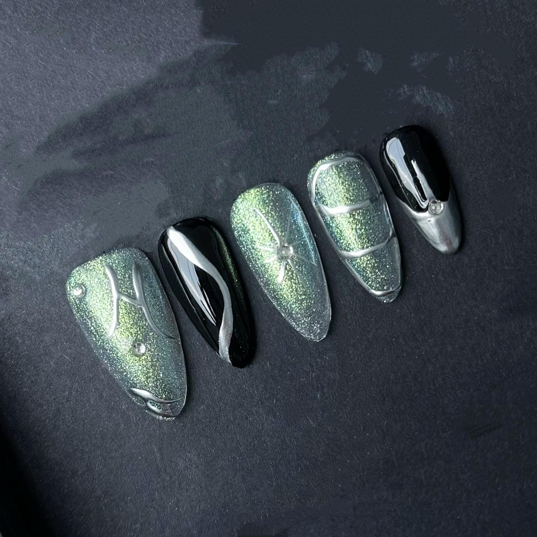 This futuristic press-on nail set features an iridescent green cat-eye shimmer base contrasted with high-gloss black and chrome silver tips. Each nail is intricately adorned with dimensional metallic line art, gem studs, and reflective details that mimic stardust trails or cosmic circuits. The combination of magnetic sparkle and sleek black creates a bold, high-fashion look perfect for nightwear, galas, or anyone channeling celestial energy with a tech-edge twist.