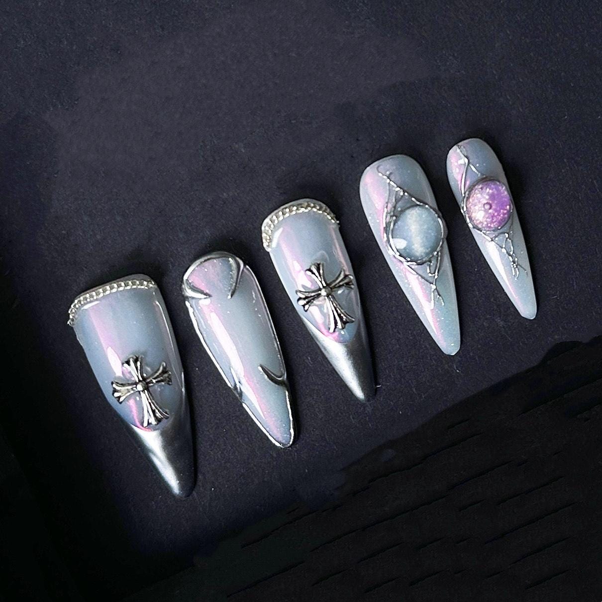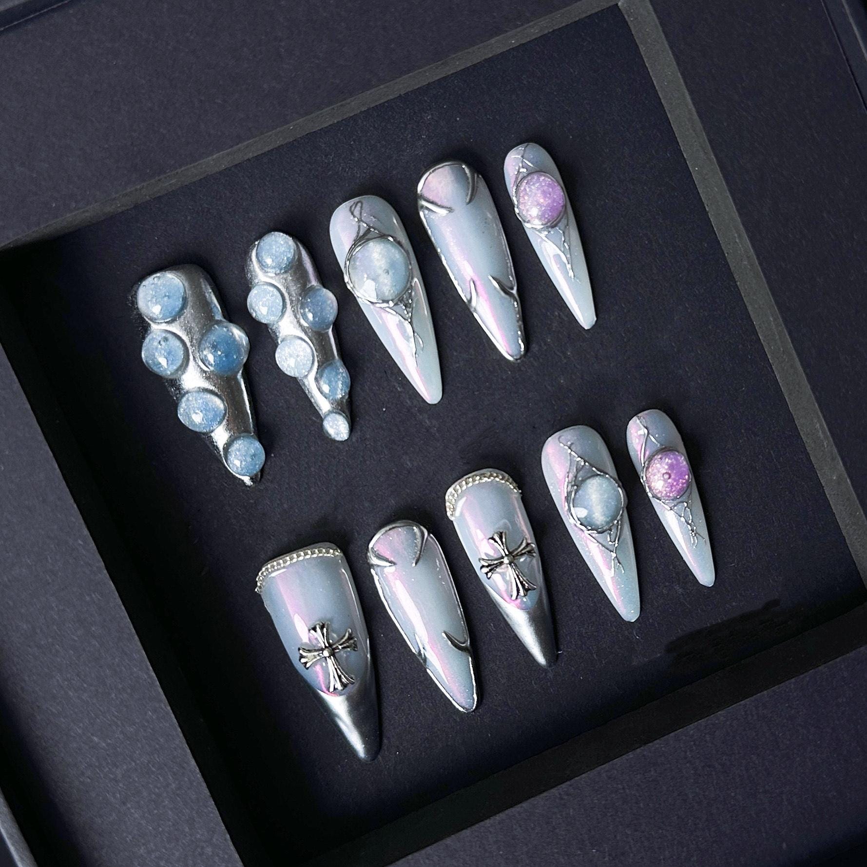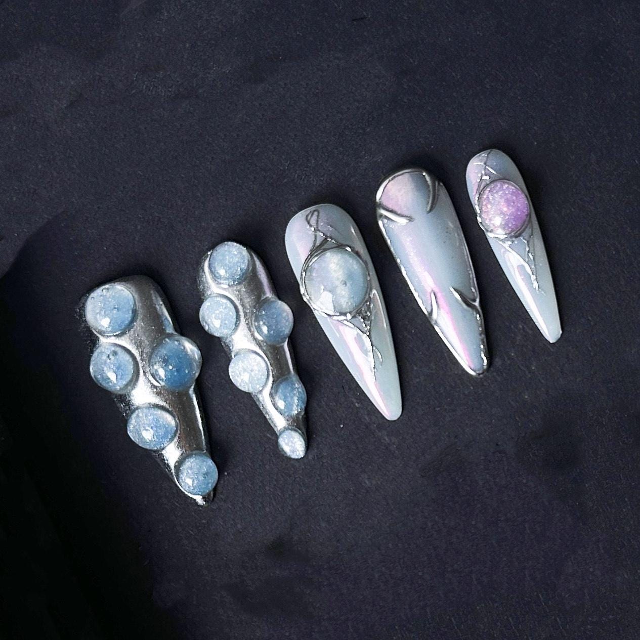 These stunning press on nails feature a chrome and pearl base with shimmering 3d orbs in soft blue and violet tones The galactic design creates a futuristic space inspired look perfect for those who love bold cosmic style