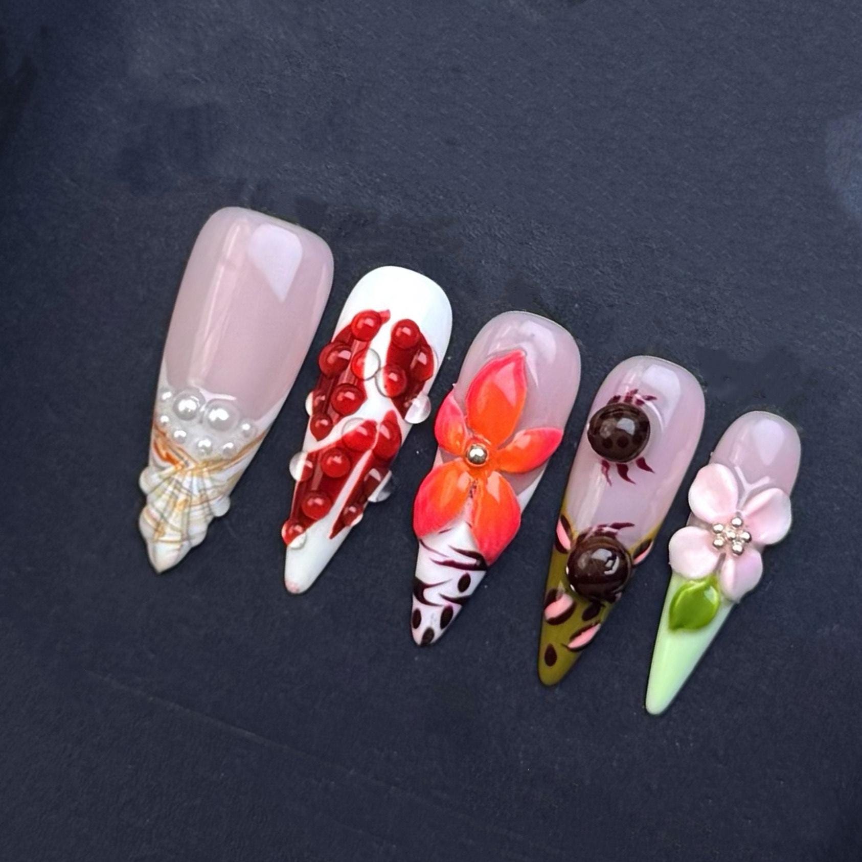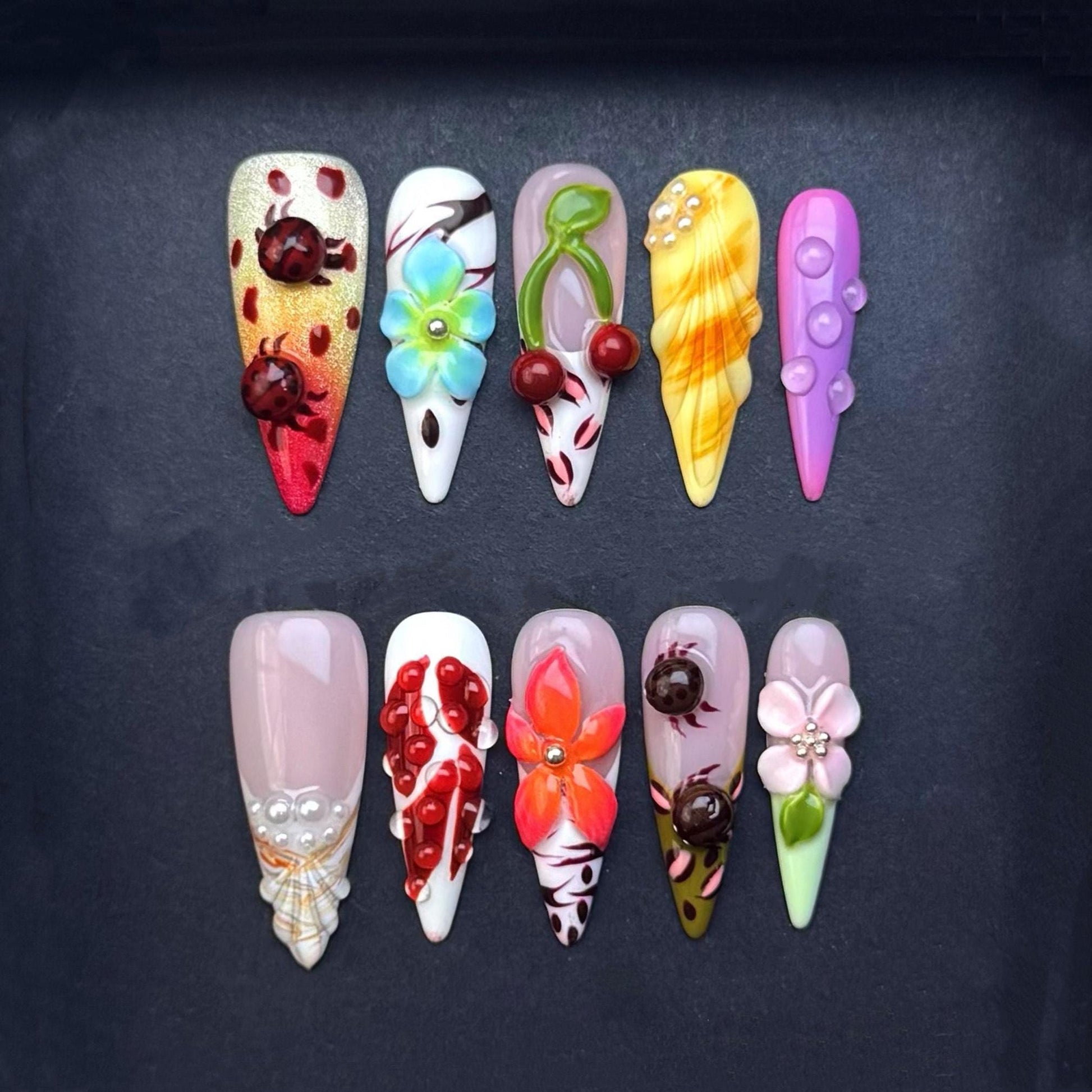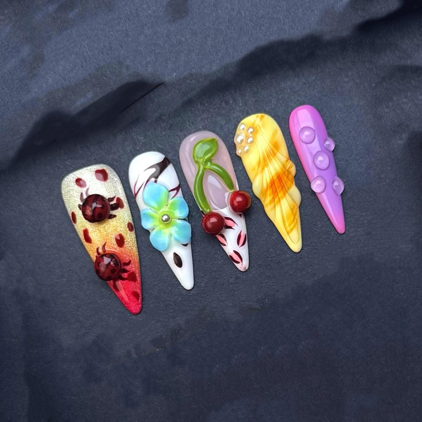 This vibrant press on nail set is a whimsical blend of 3D cherries blooming flowers and adorable ladybugs with bold pops of color and detailed sculpted accents Inspired by a playful summer garden each nail is handmade to bring a fun fruity and floral touch to your look