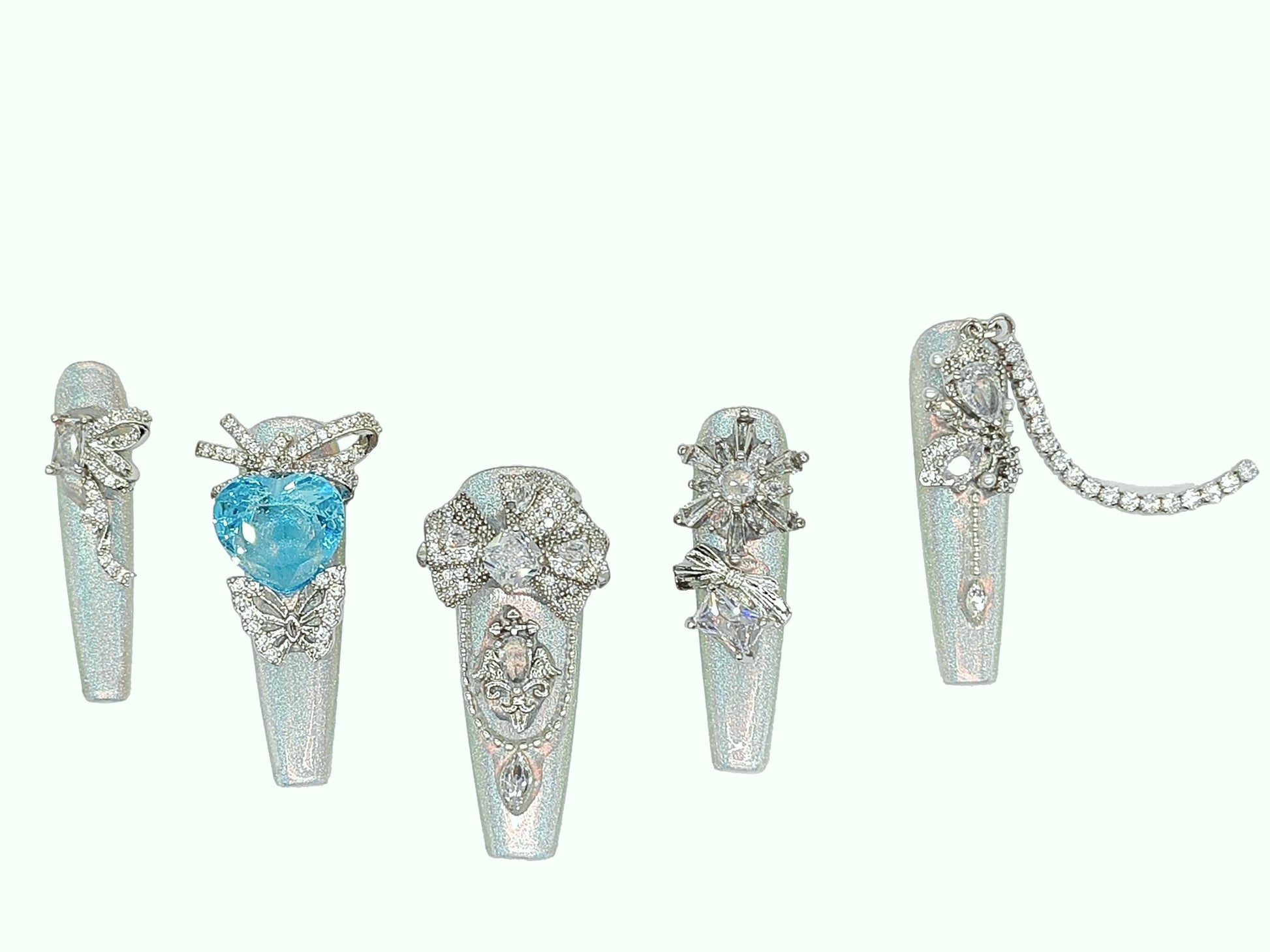 Channel icy elegance with these shimmering silver nails, adorned with brilliant blue gems, intricate 3D accents, and sparkling chains. A perfect blend of winter glam and regal luxury—made to mesmerize.
