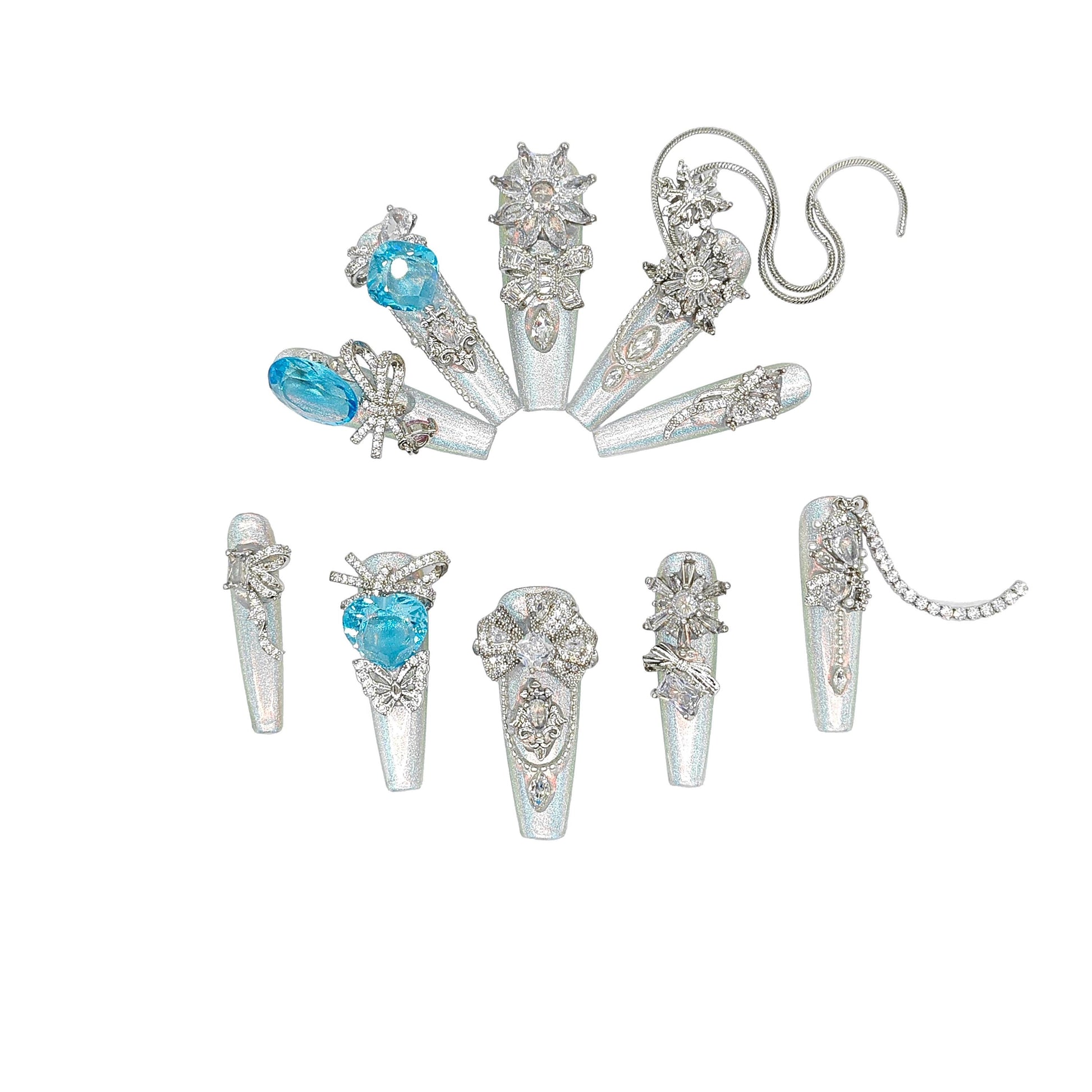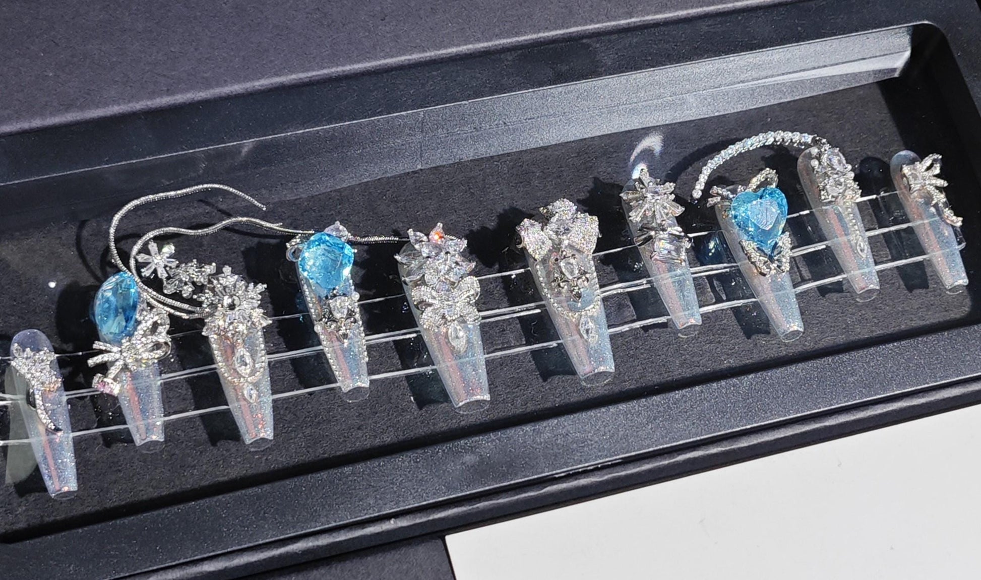 Glacier Queen Press-On Nails | 3D Blue Crystal & Silver Charm Nails | Winter Glam | Reusable Luxury Nail Set