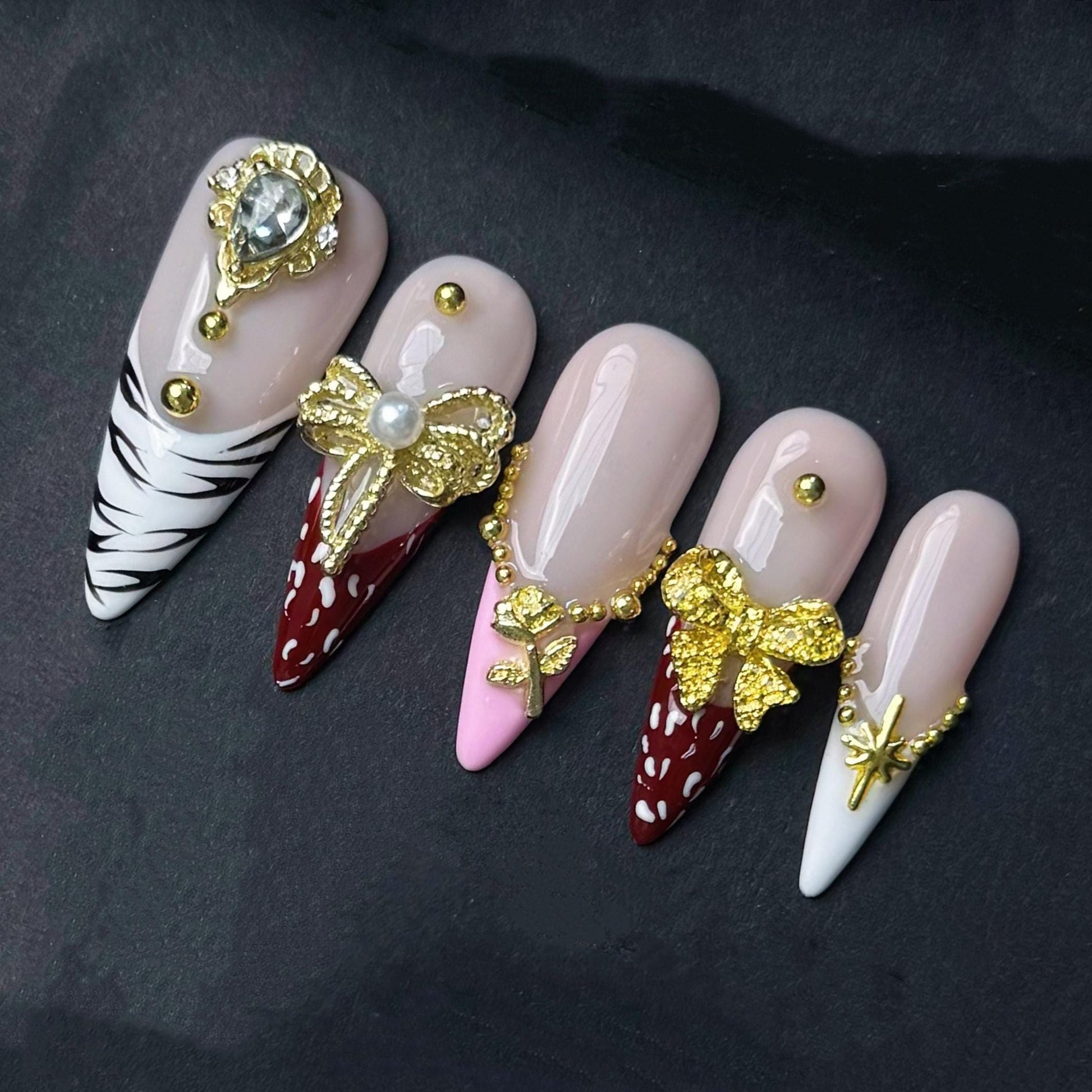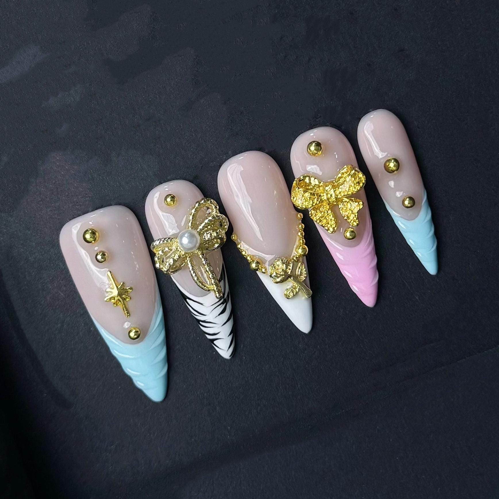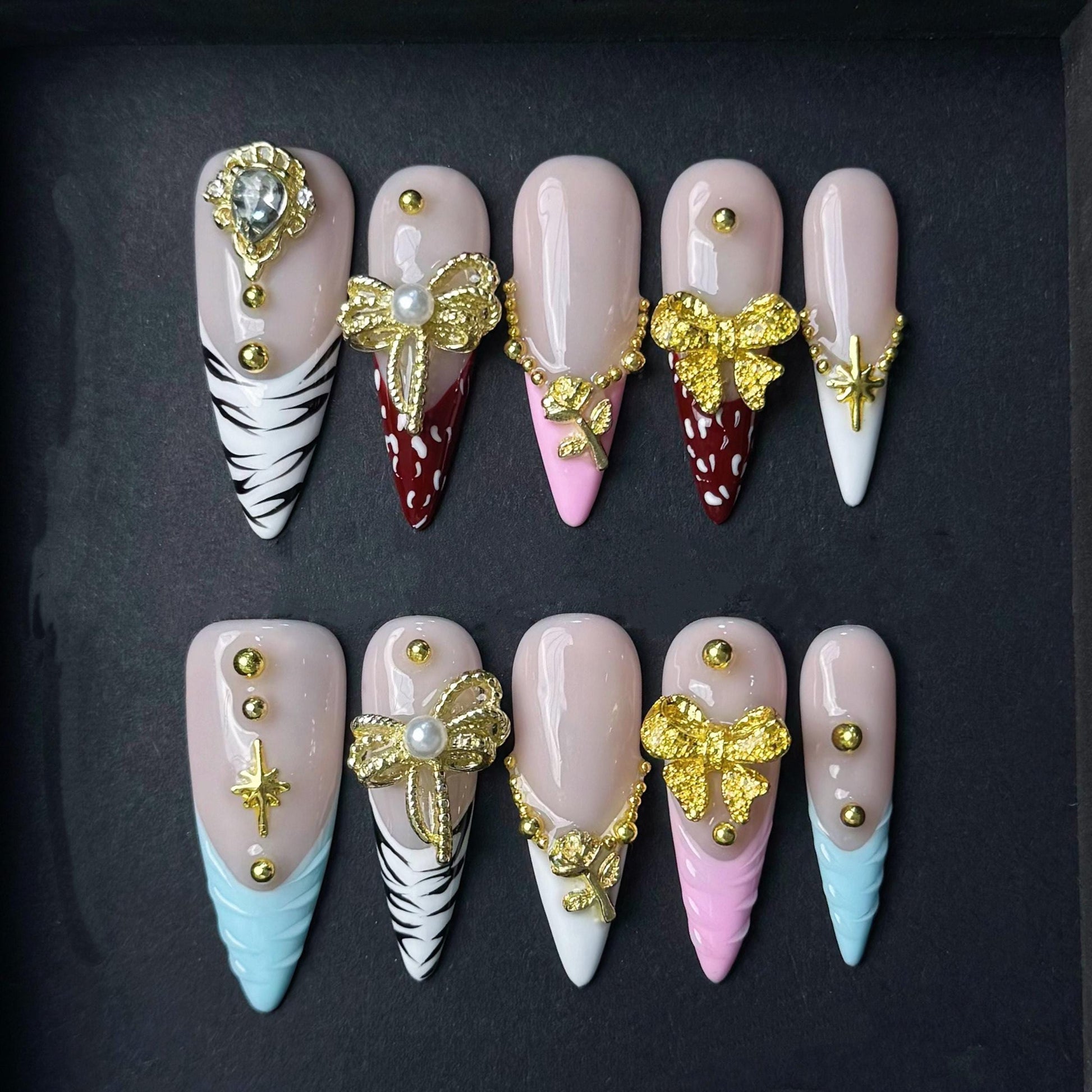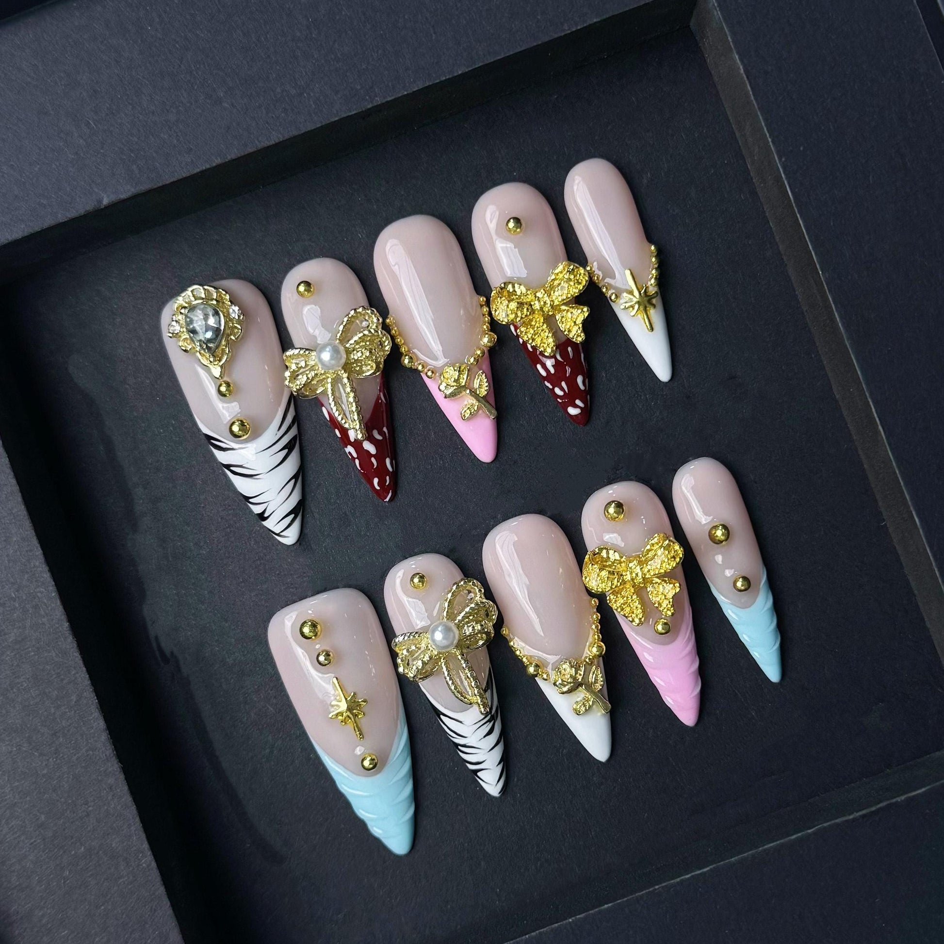 These glam press on nails feature a mix of animal print tips pink and white accents and lavish gold charms including bows pearls and roses Designed for bold elegance this set adds instant luxury and sparkle to any look