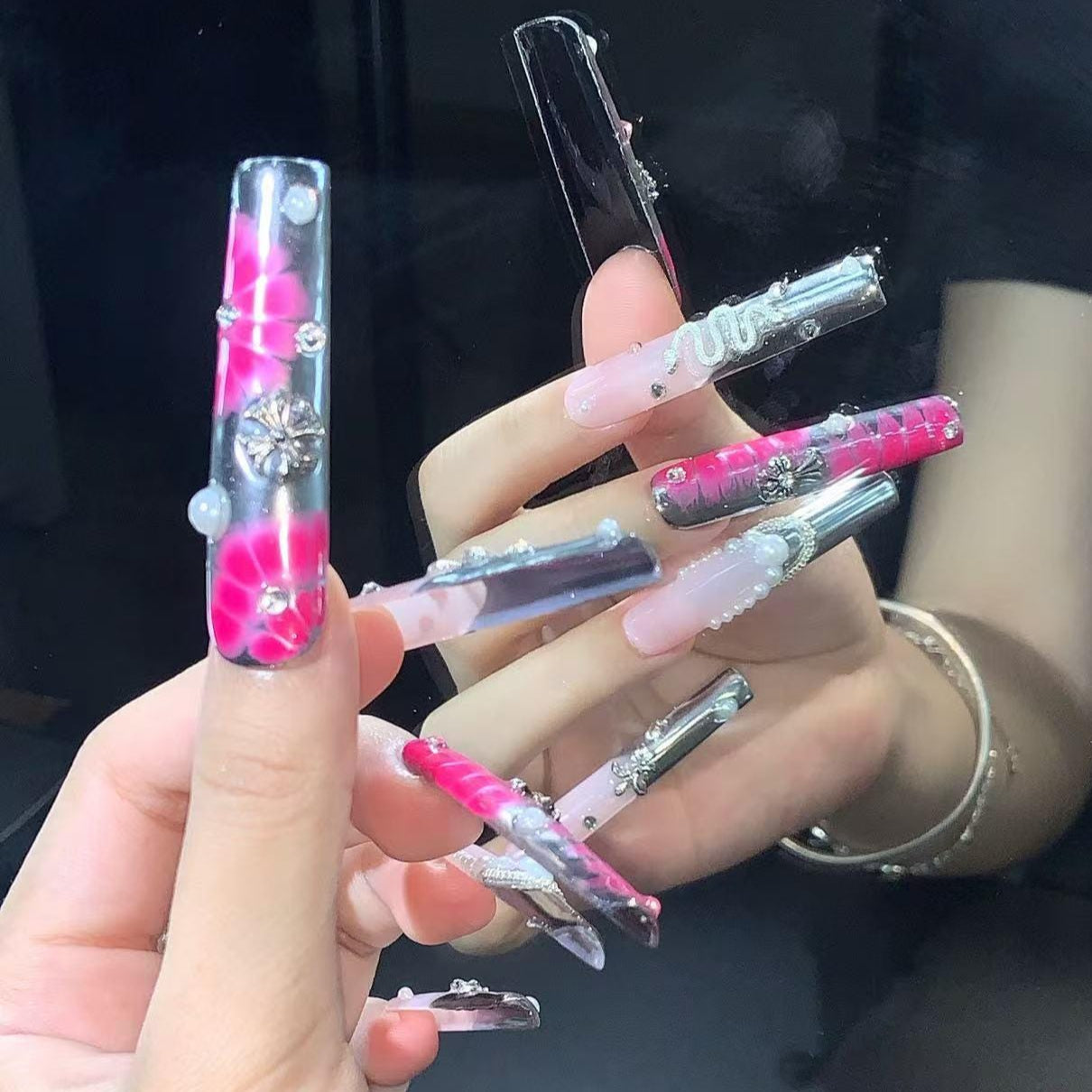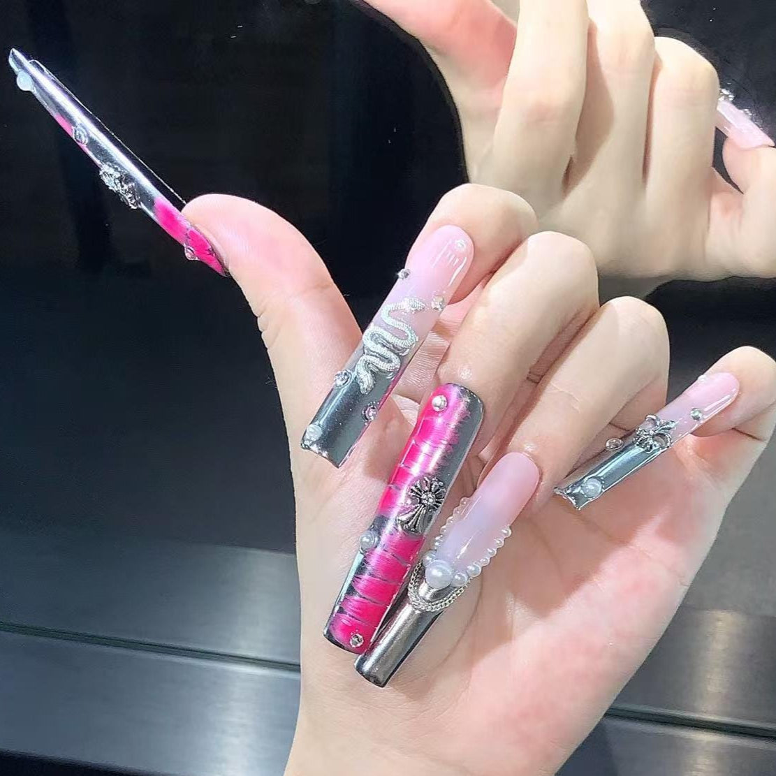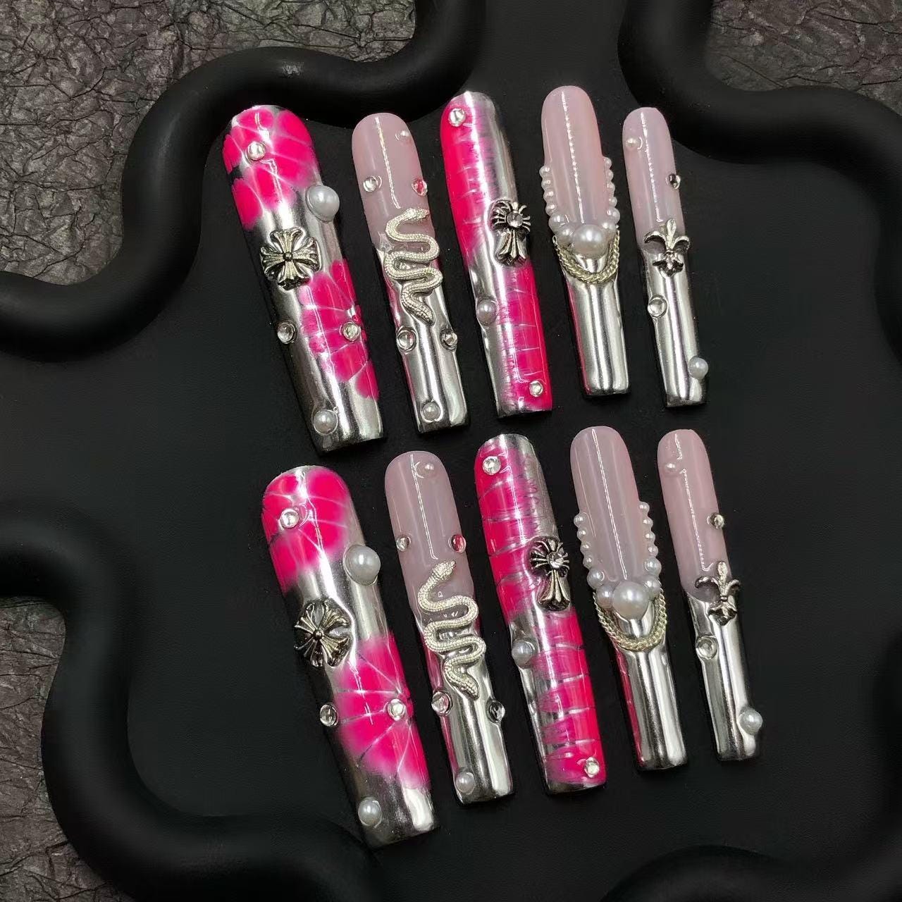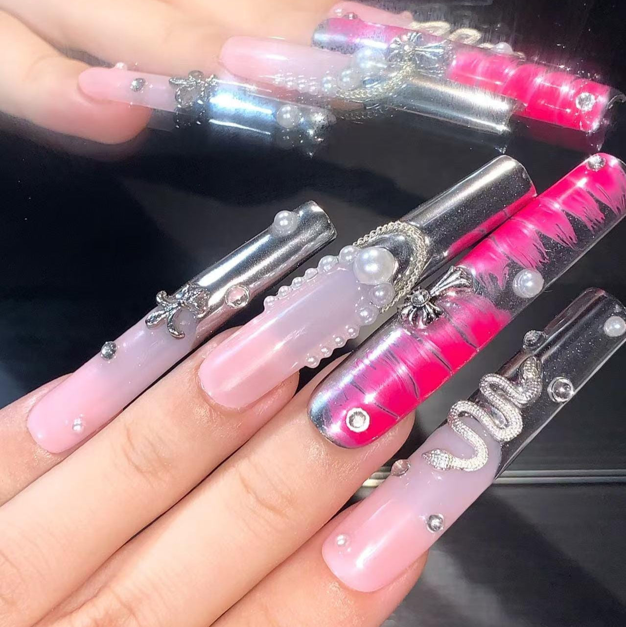 This fierce and edgy press-on nail set blends punk glam with feminine flair. Featuring a mix of pink chrome, jelly pink, and silver metallic finishes, each long coffin nail is decorated with statement accents like a silver snake, pearls, chains, and celestial metal charms. Ideal for bold fashionistas who love mixing sweet with savage.