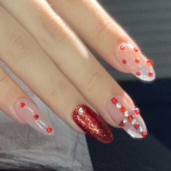 Turn heads with this bold red press-on nail set featuring dazzling rhinestone accents, a glittery red statement nail, and a striking crystal cross design. With a perfect blend of glossy red sparkle and nude base dotted with gems, this set delivers edgy glam with a touch of elegance. Ideal for nights out, special events, or making a bold fashion statement!