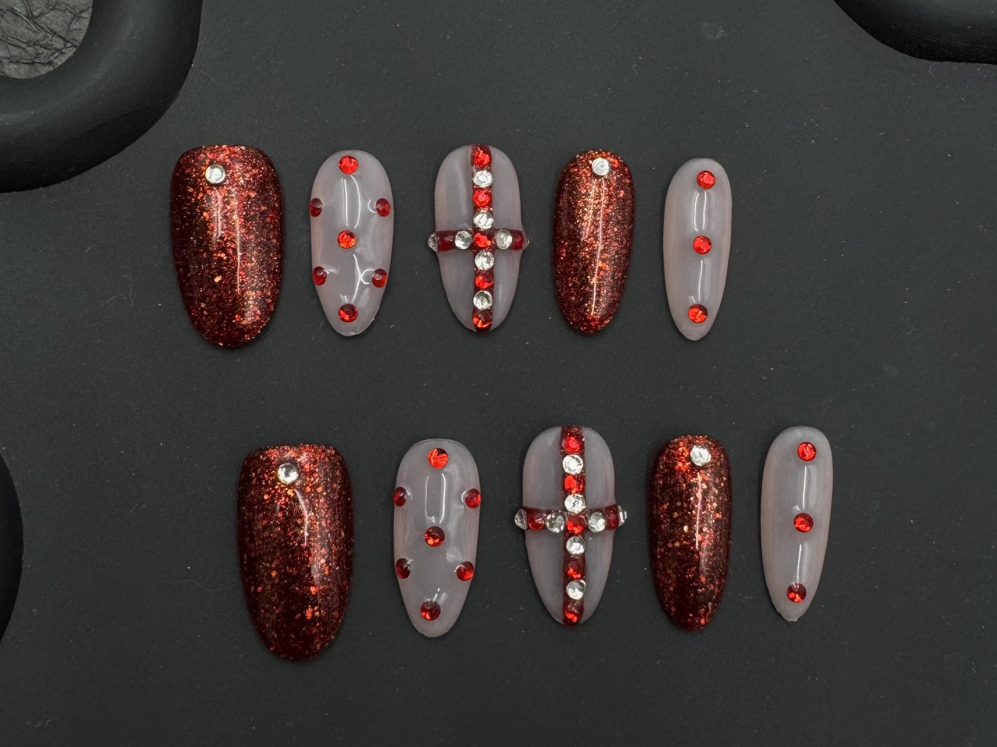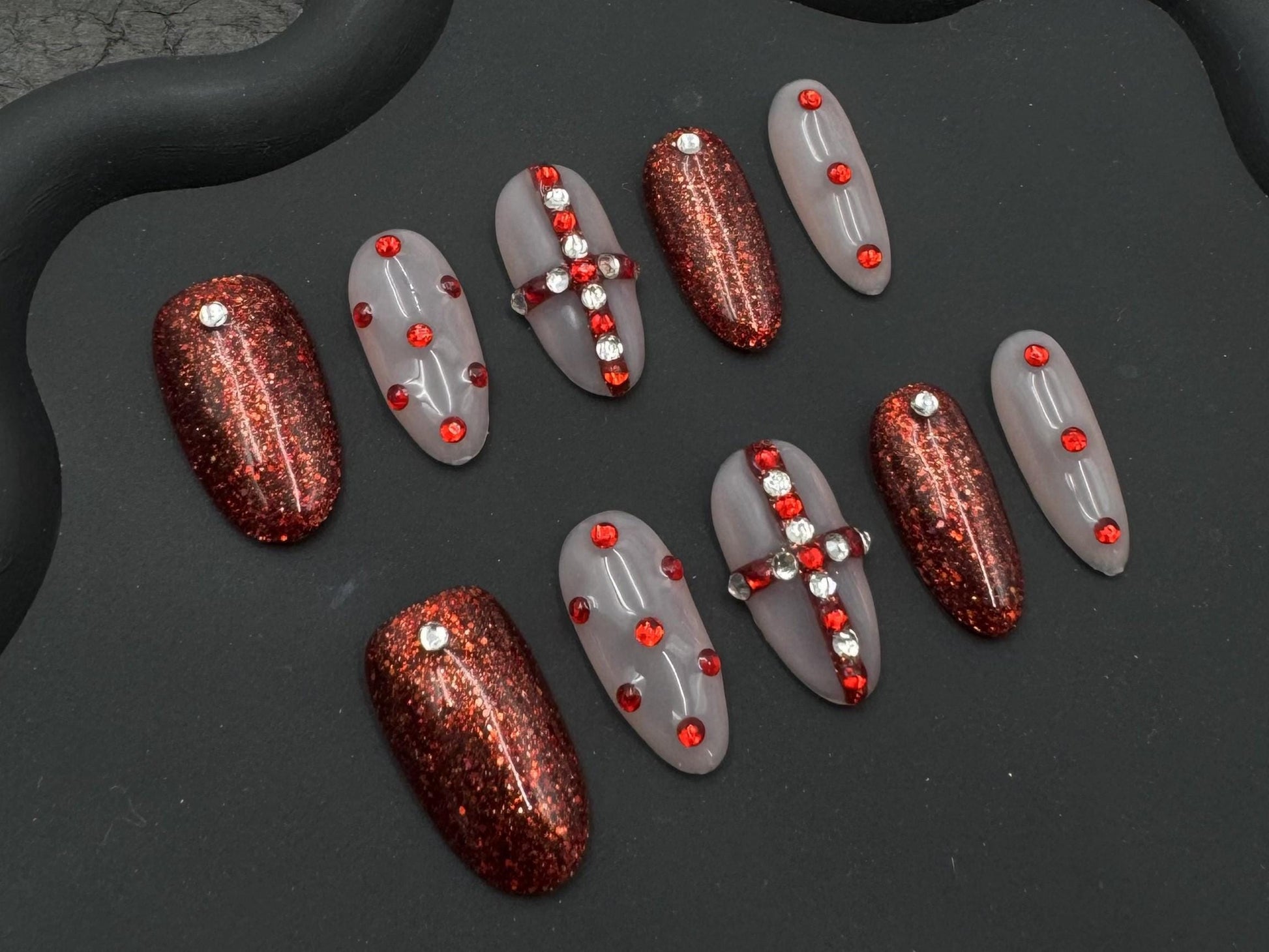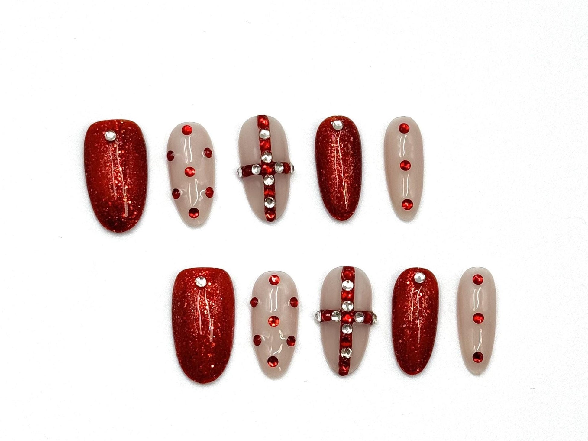 Glam Red Rhinestone Cross Press-On Nails – Glitter & Crystal Accent Set Artificial reusable fake glue on faux manicure nails trendy art