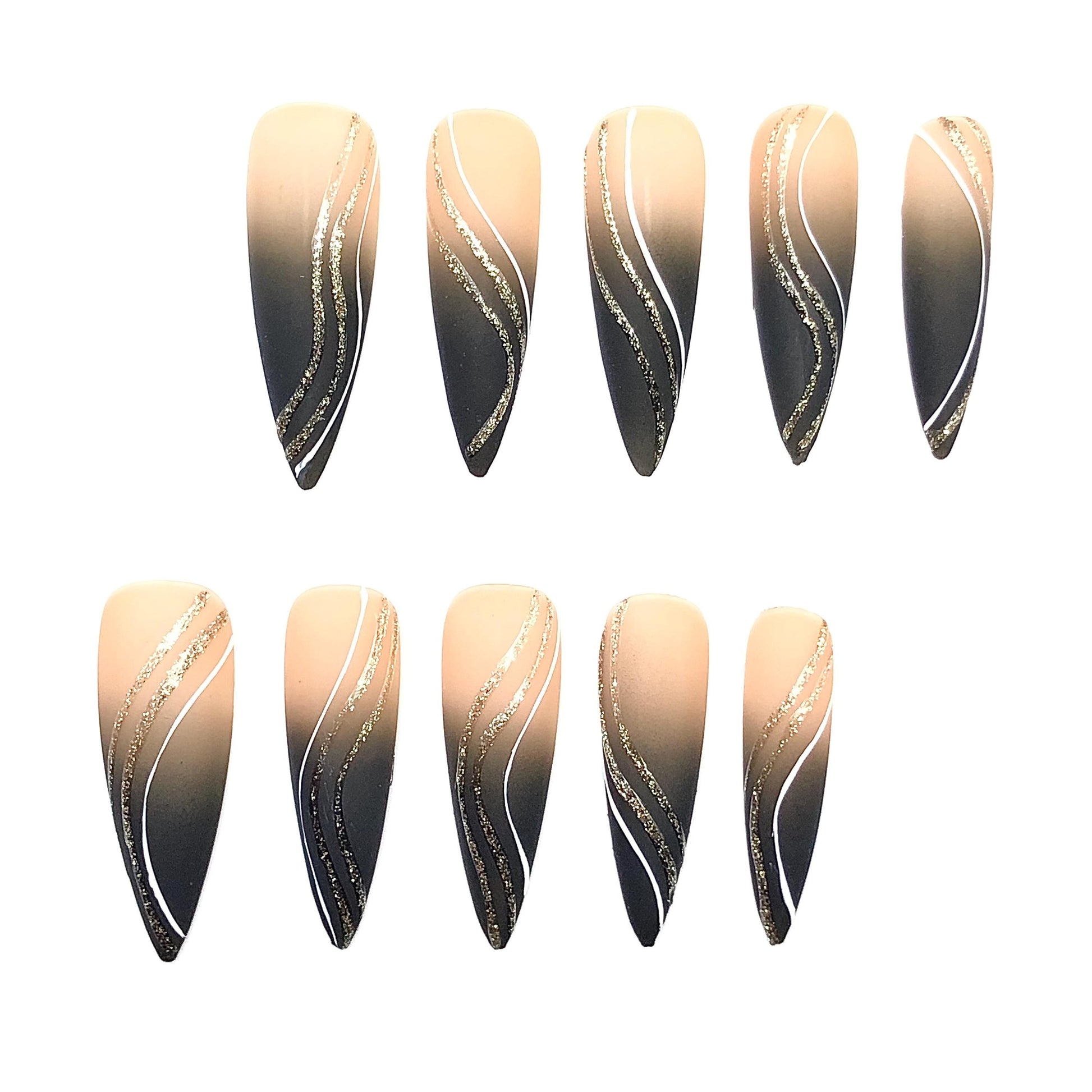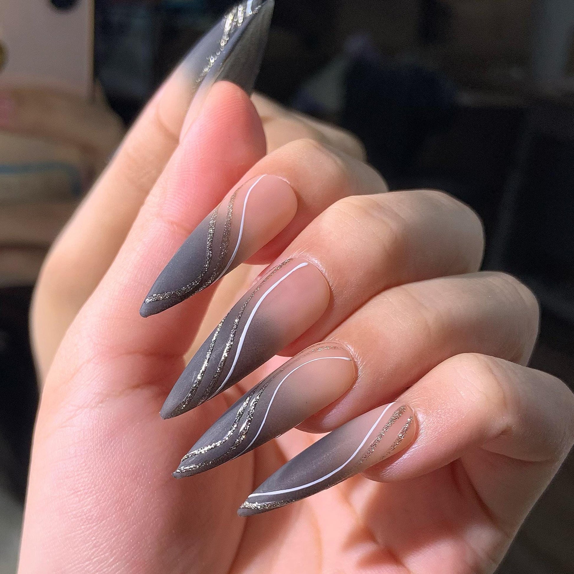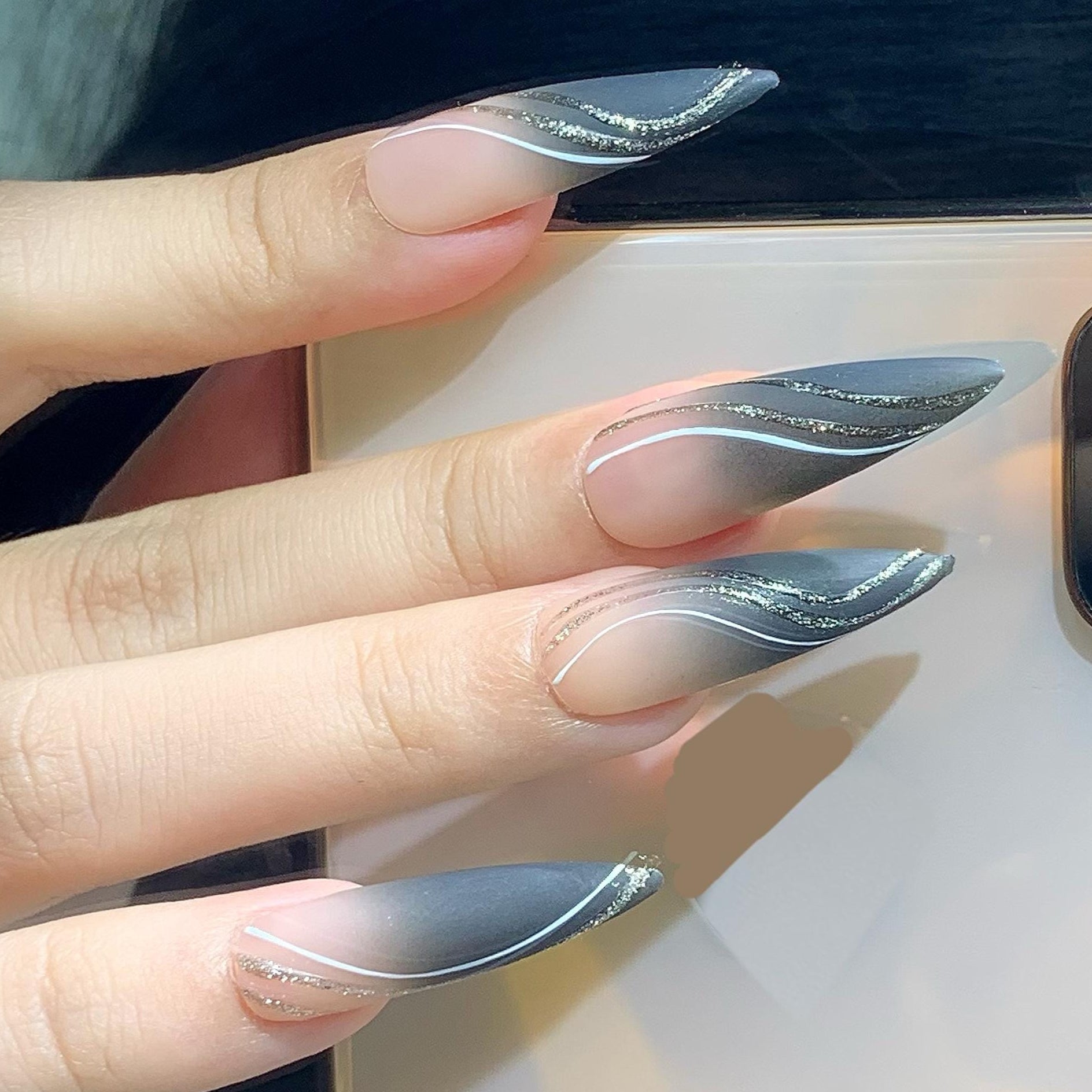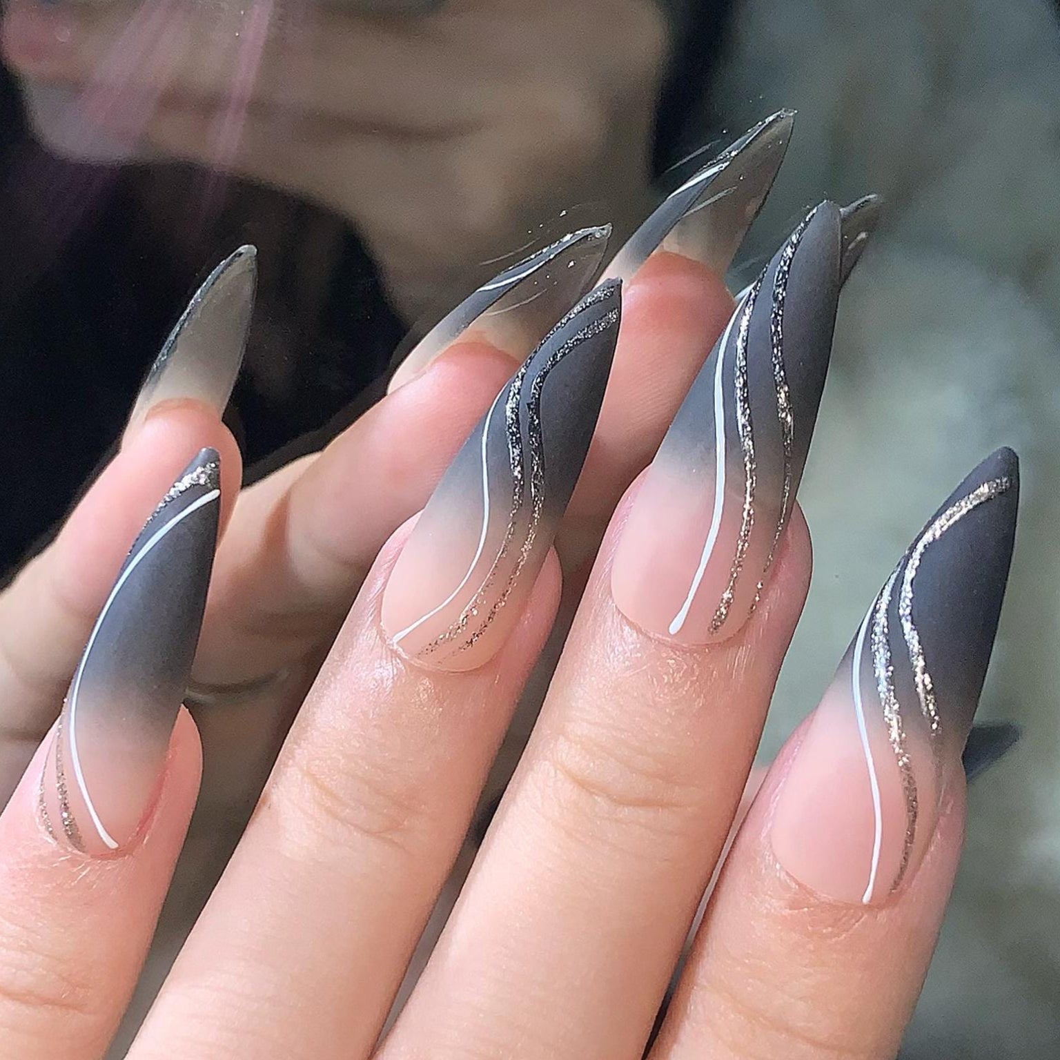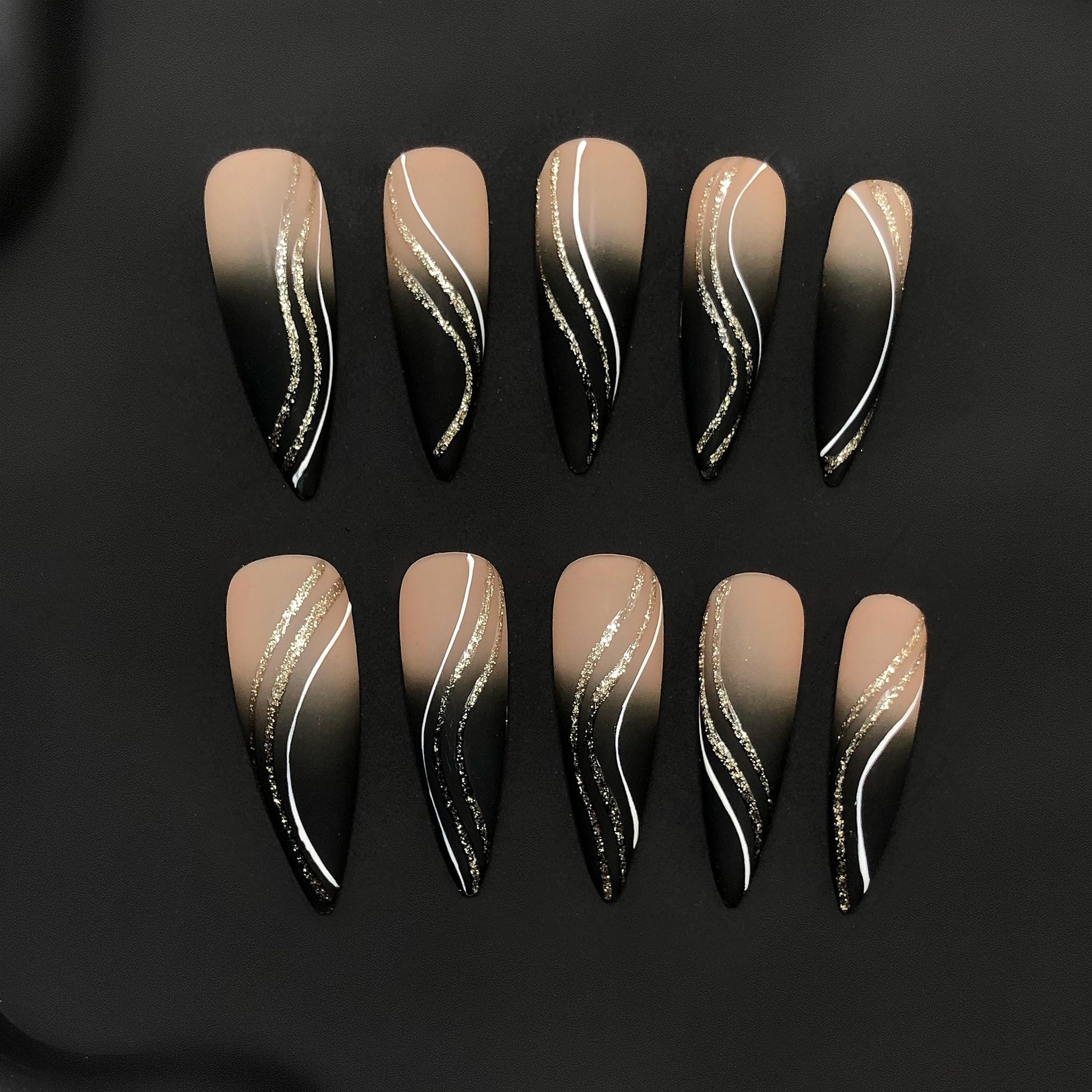 These glamorous long stiletto nails combine sleek black tips with a soft light pink base, creating a bold yet elegant look. Each nail is uniquely hand-painted with sparkling streaks, adding a touch of dazzling shine. The striking contrast and shimmering details make these nails a perfect statement piece for any occasion!