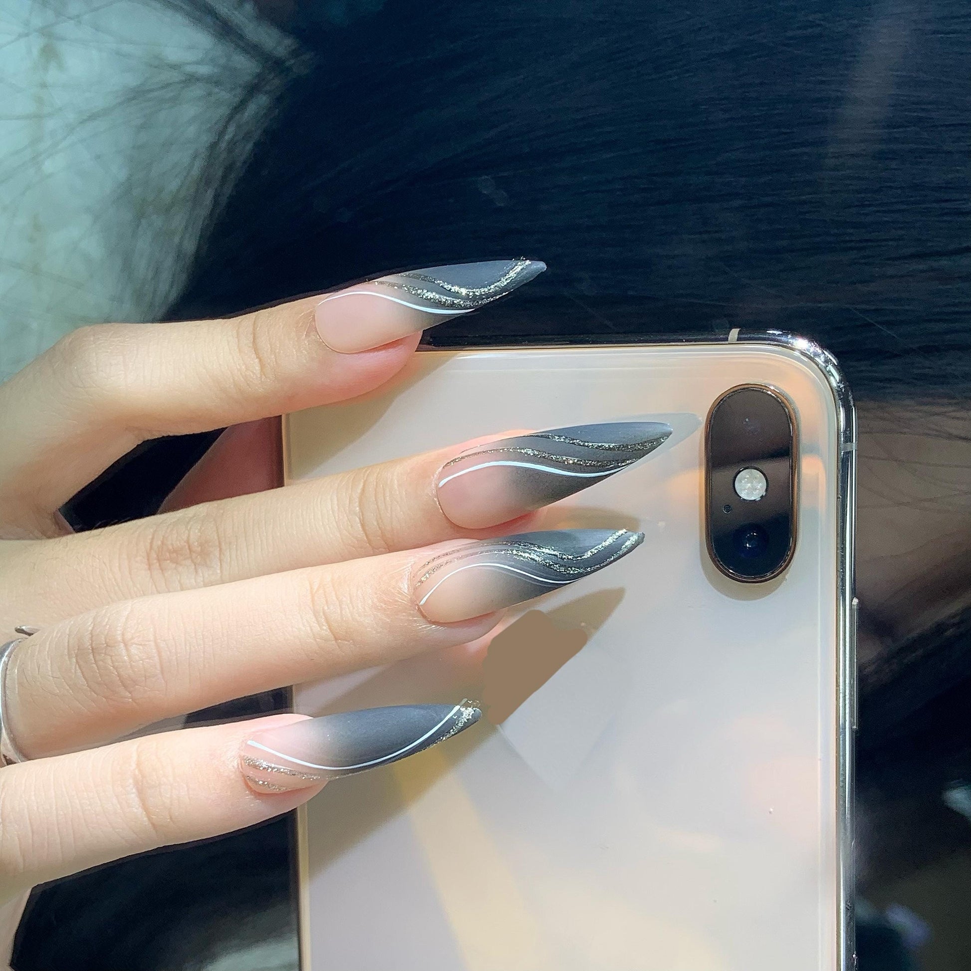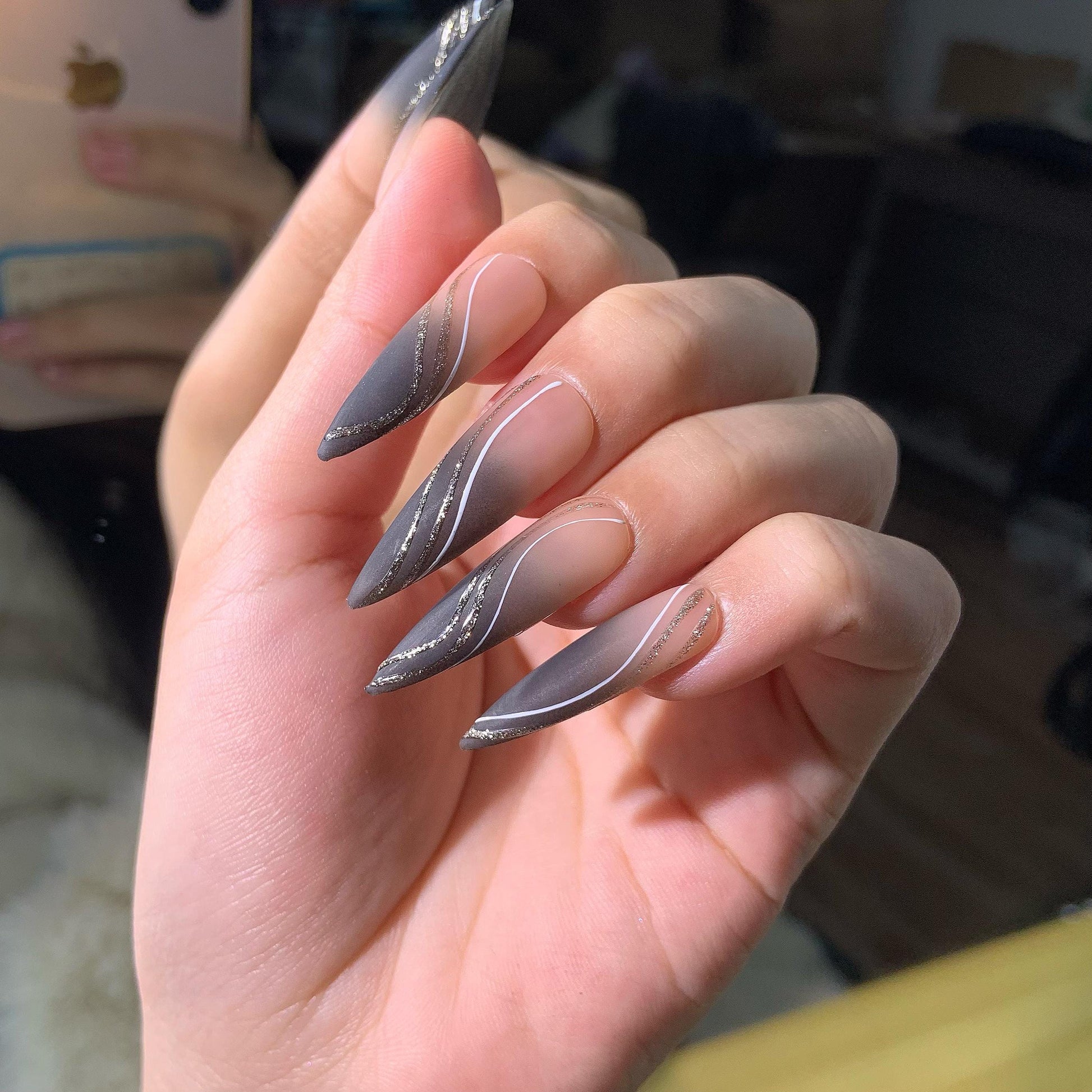 These glamorous long stiletto nails combine sleek black tips with a soft light pink base, creating a bold yet elegant look. Each nail is uniquely hand-painted with sparkling streaks, adding a touch of dazzling shine. The striking contrast and shimmering details make these nails a perfect statement piece for any occasion!