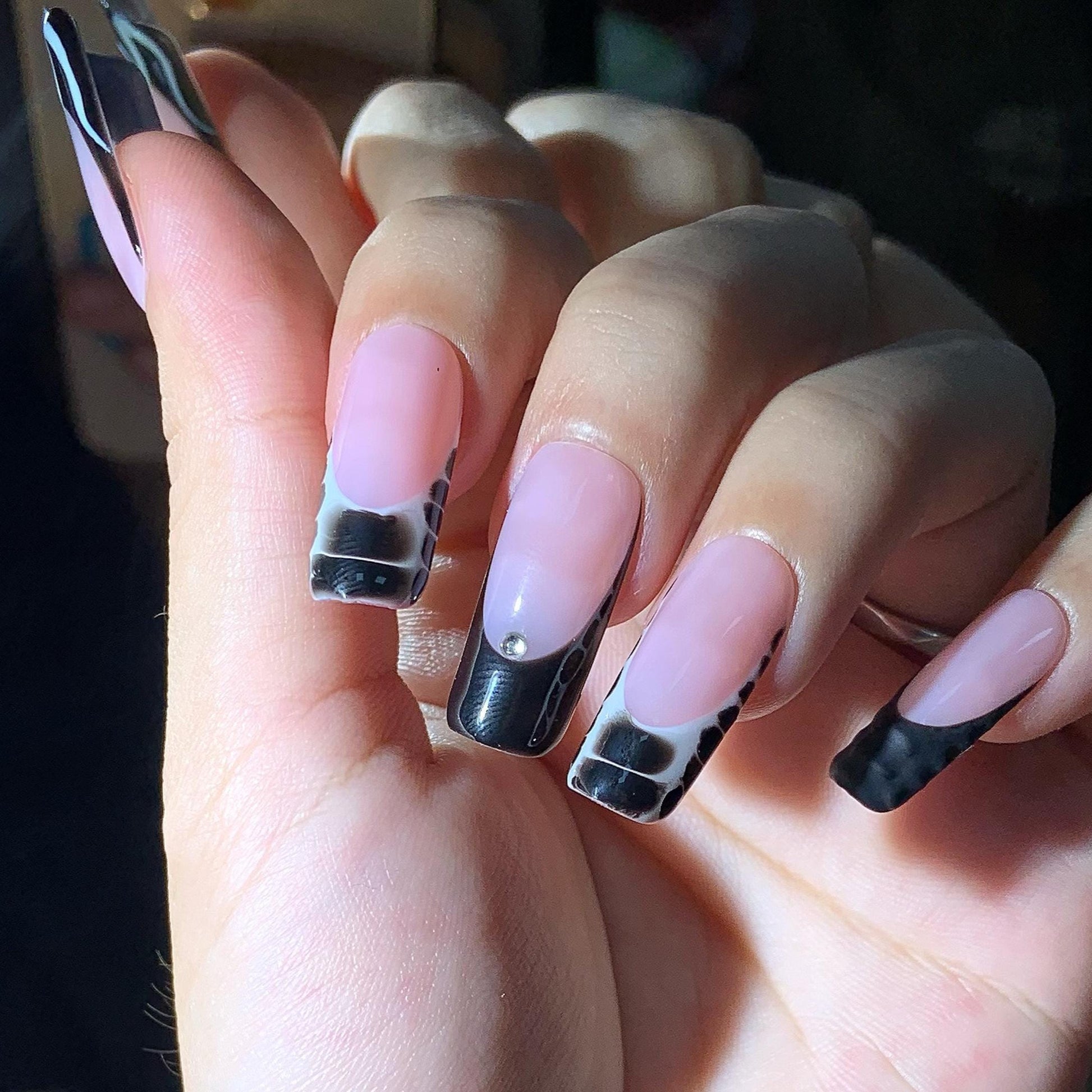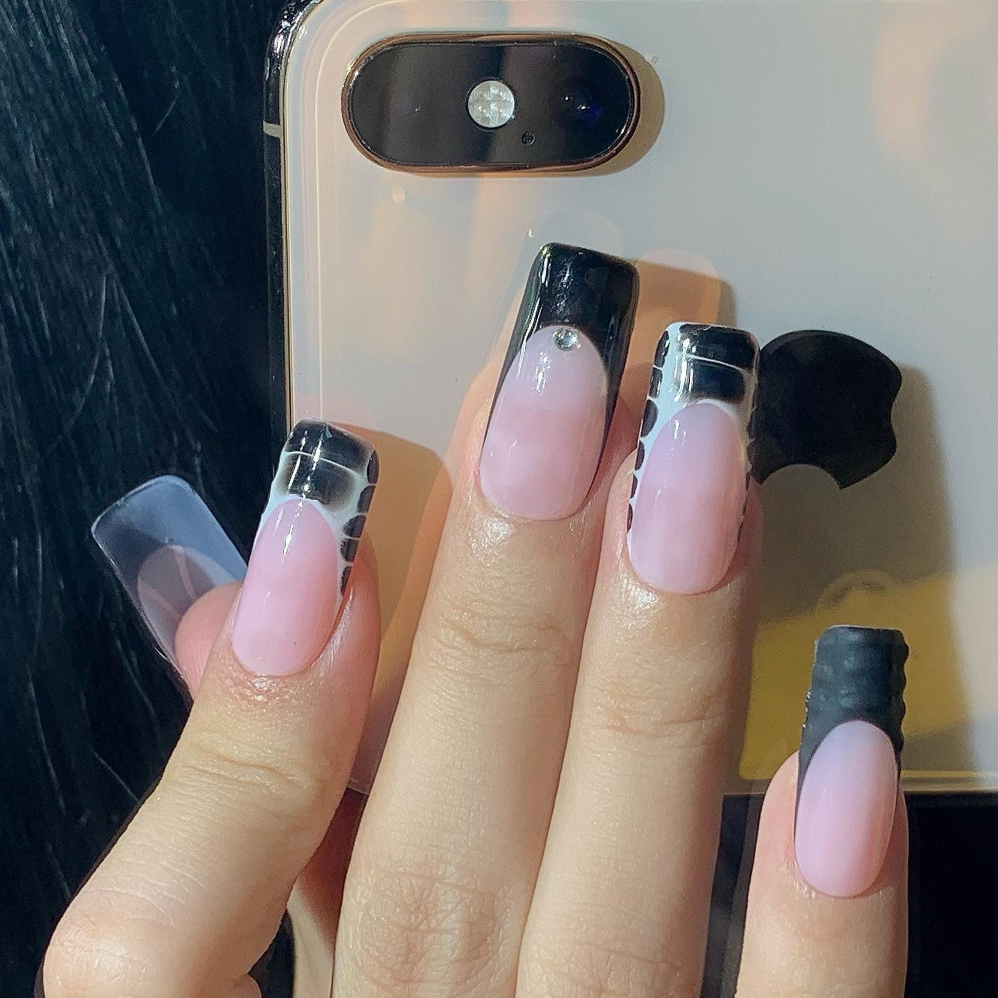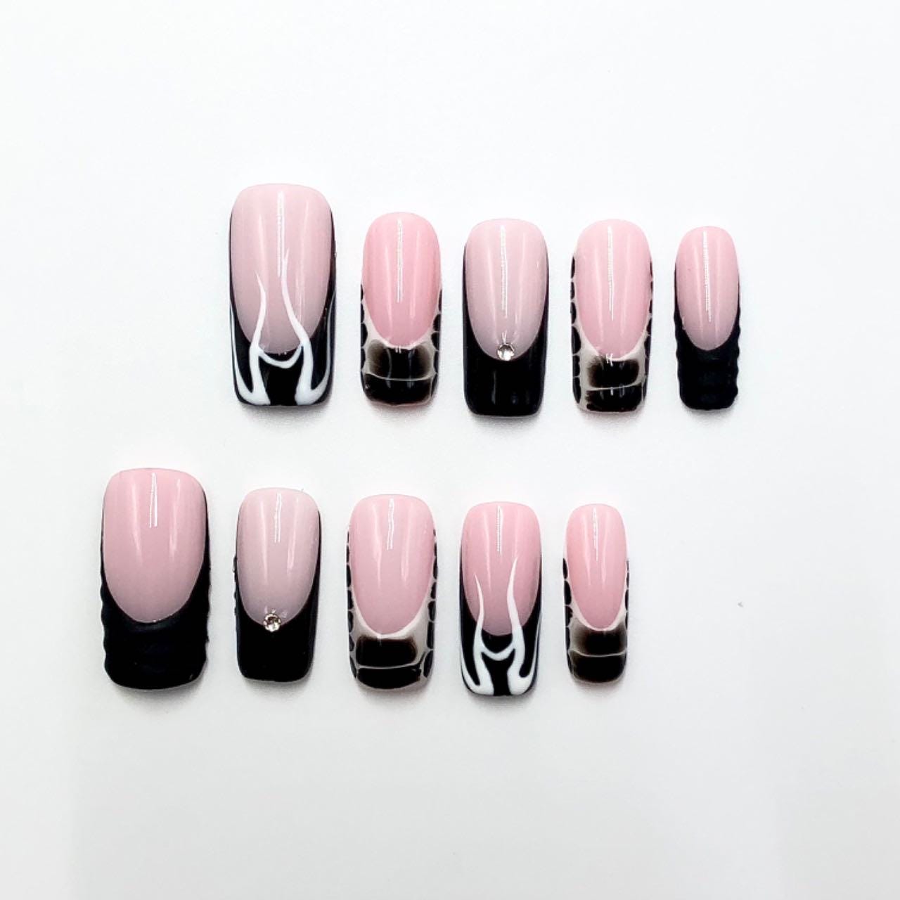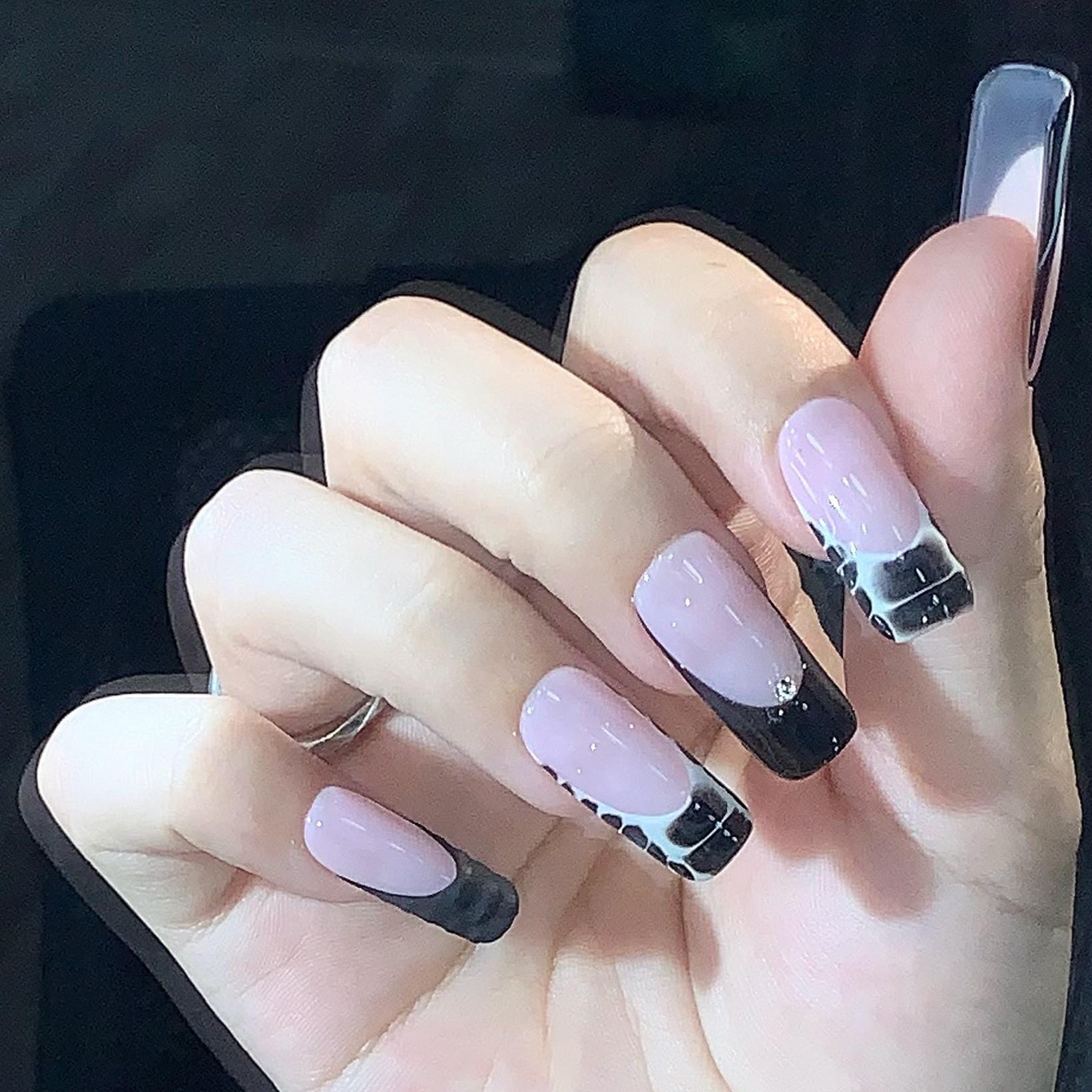Sleek and stylish, this modern press-on nail set features a soft pink base with bold black French tips. Unique grid and texture detailing add a futuristic twist, while a single rhinestone on the middle finger offers a hint of sparkle. The long square shape is perfect for elevating your everyday look with a touch of edgy sophistication.
