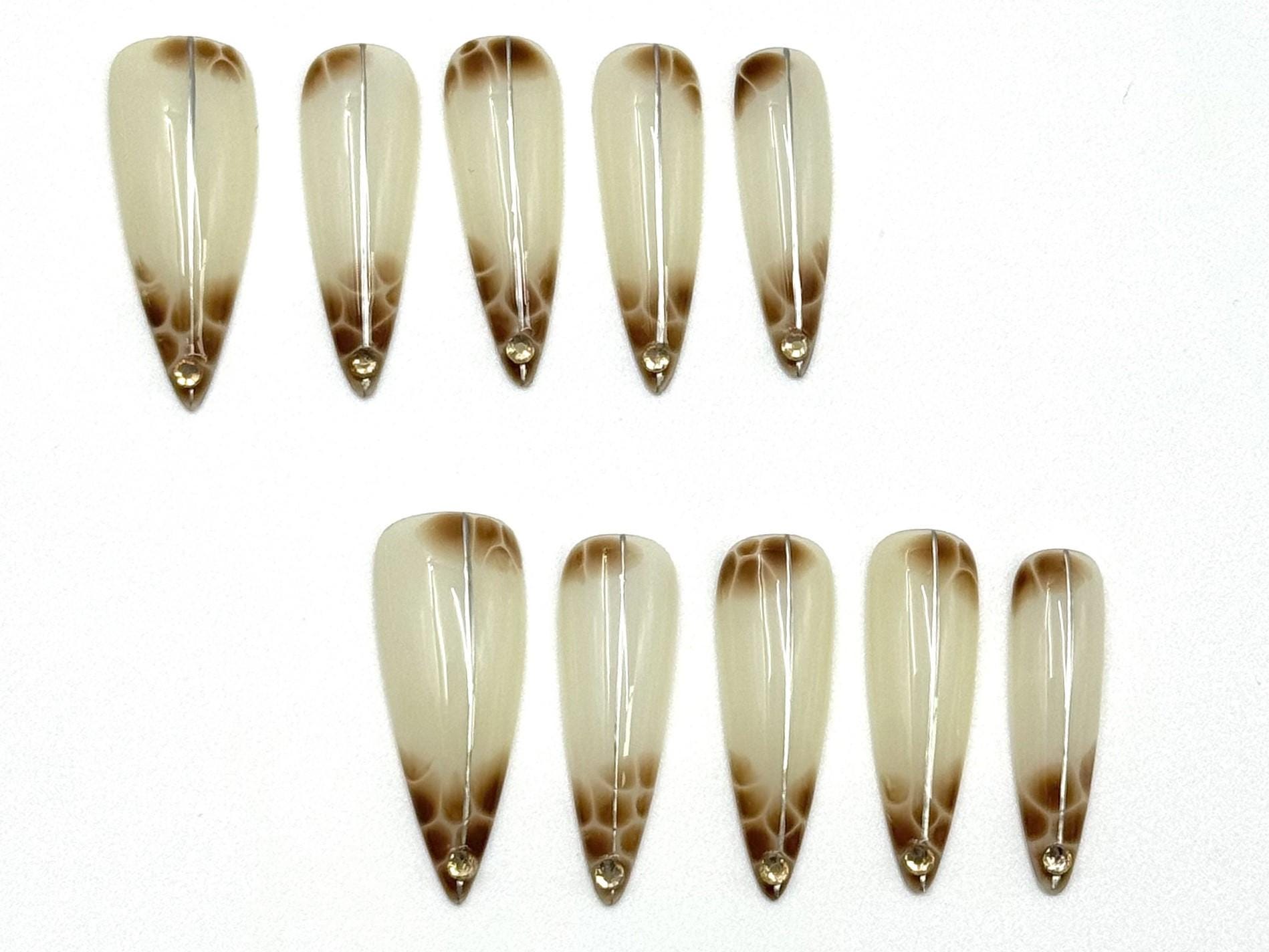 Embrace sleek and subtle wildness with these glossy long stiletto press-on nails. Featuring a soft white-to-caramel gradient with faint giraffe-like spots and crystal rhinestone accents, this set combines elegance with an animal-inspired edge. A chic choice for fashionistas who love natural tones with a twist.