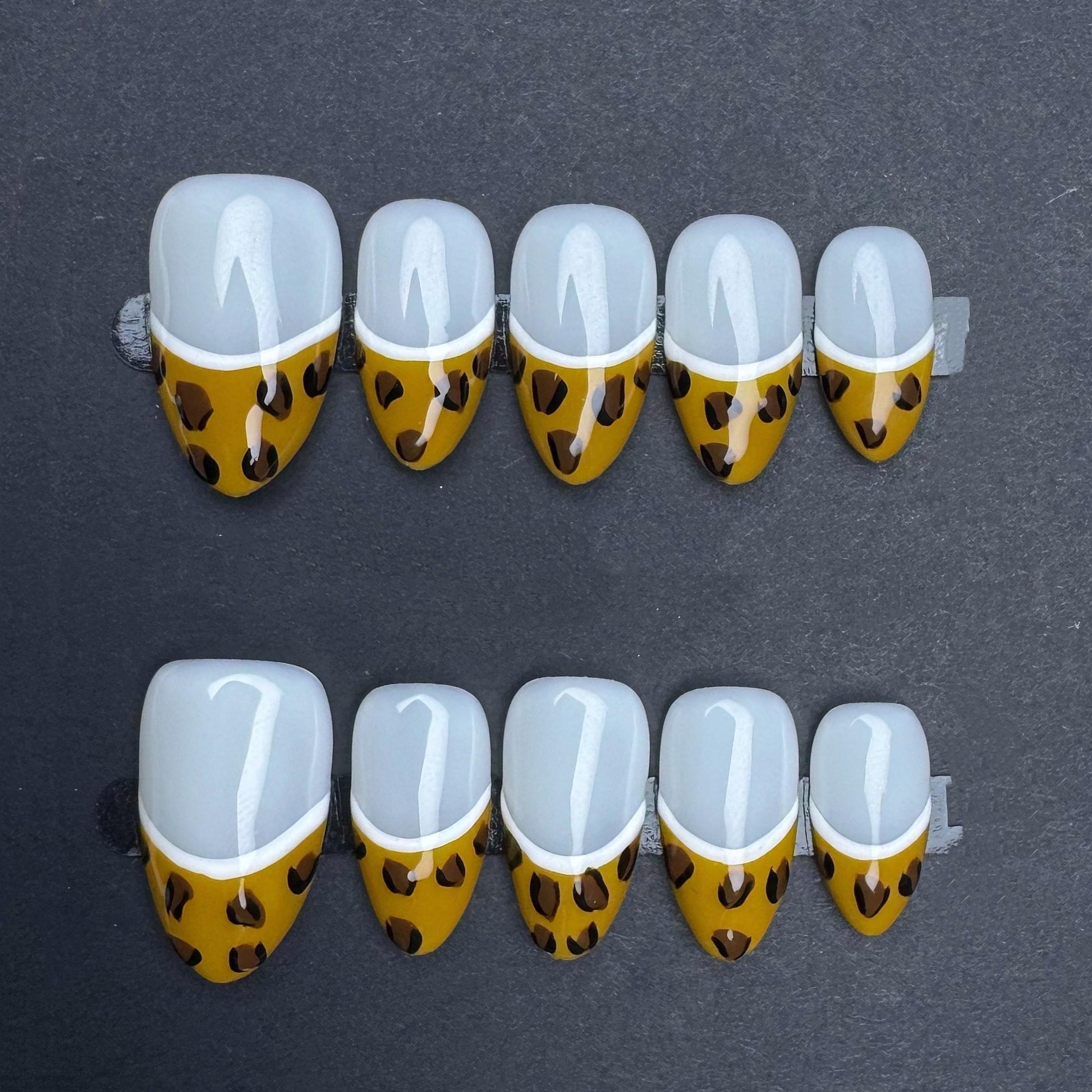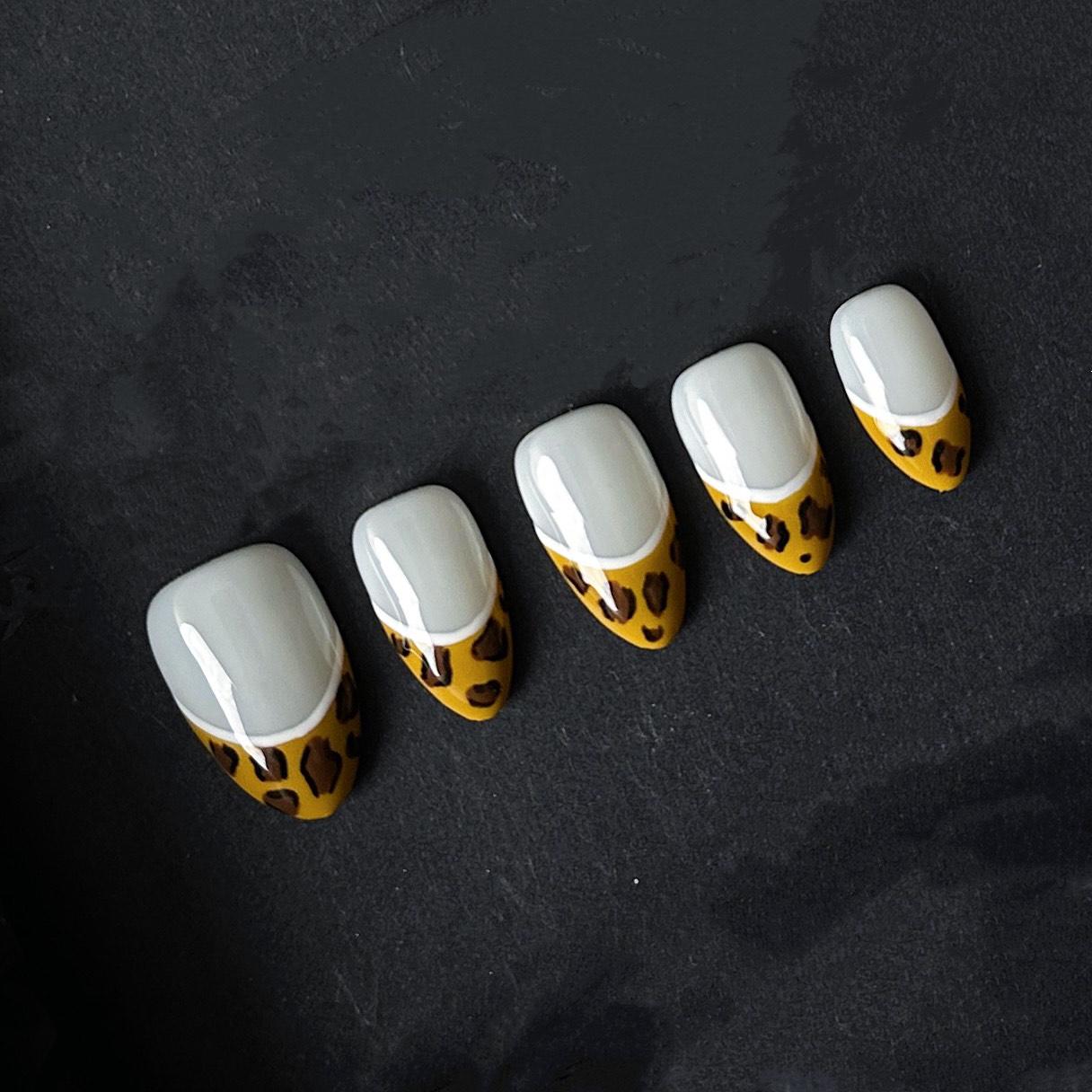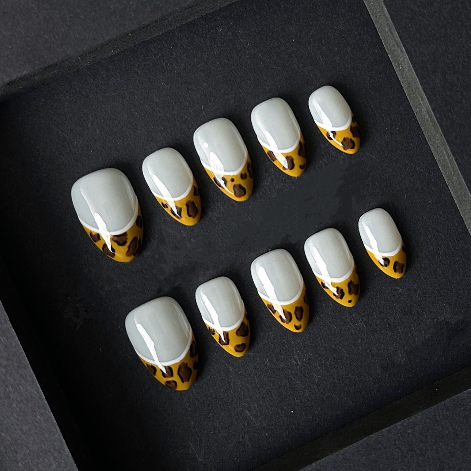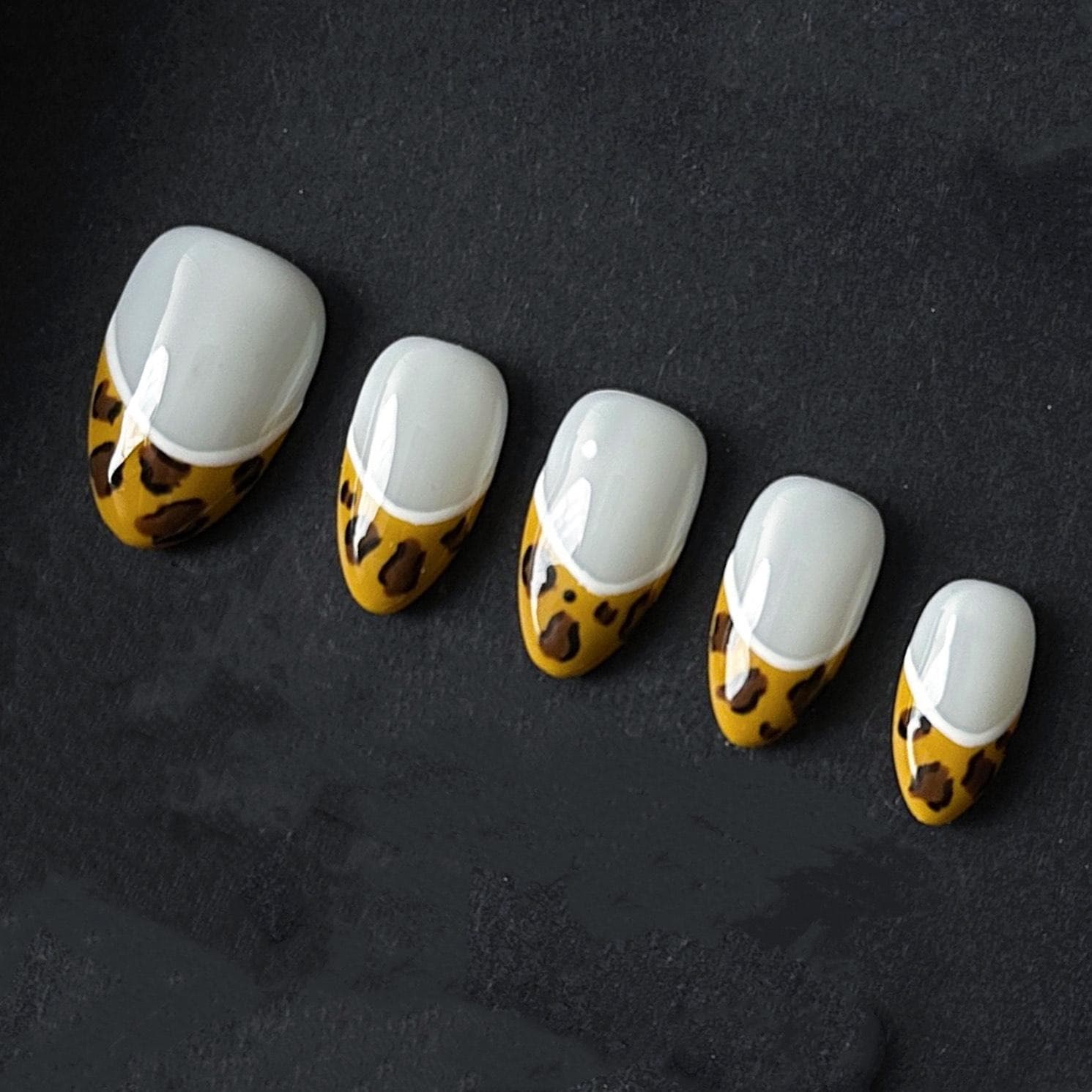 Glossy French Tip Press On Nails with Mustard Leopard Print Accent. Artificial reusable fake glue on faux manicure nails trendy art.