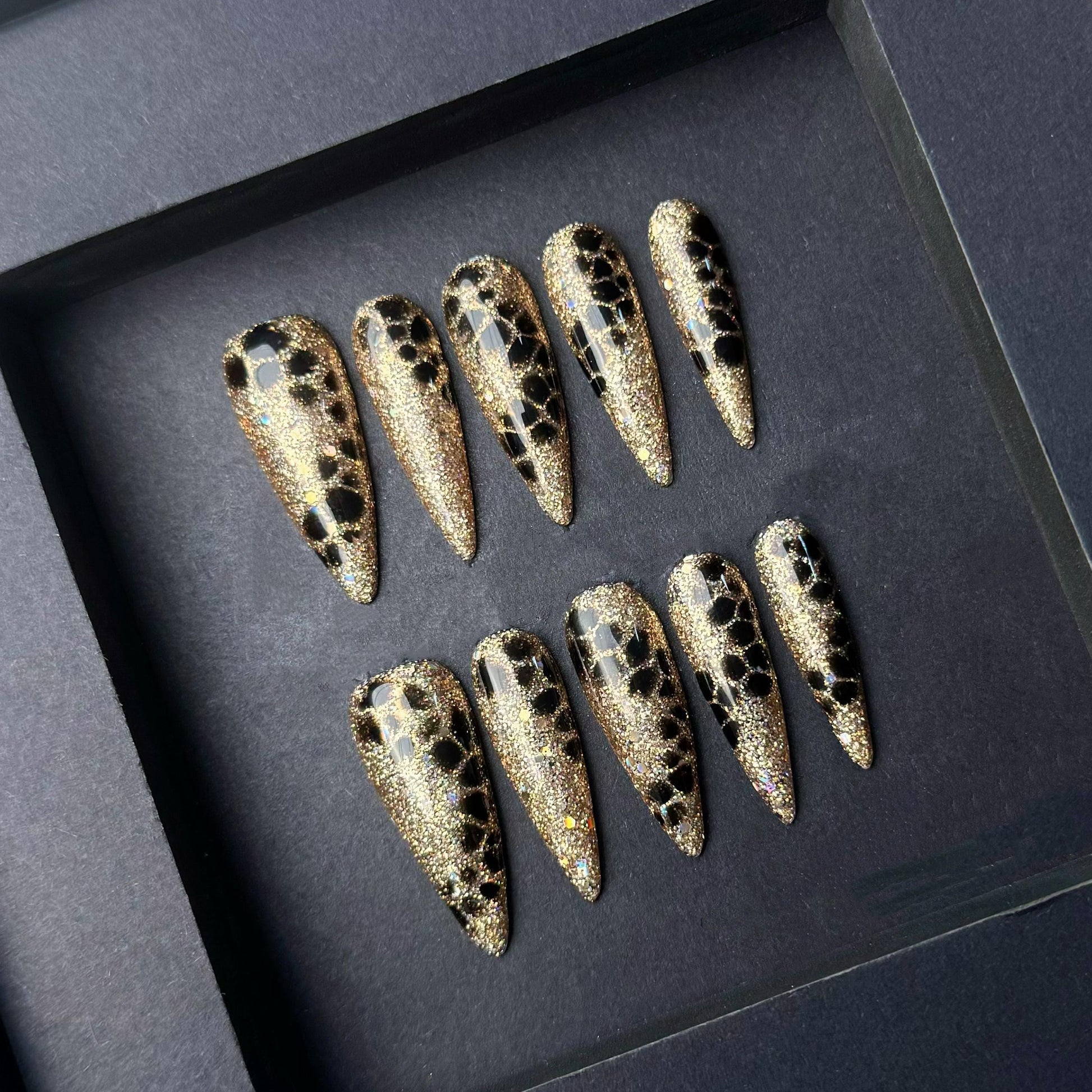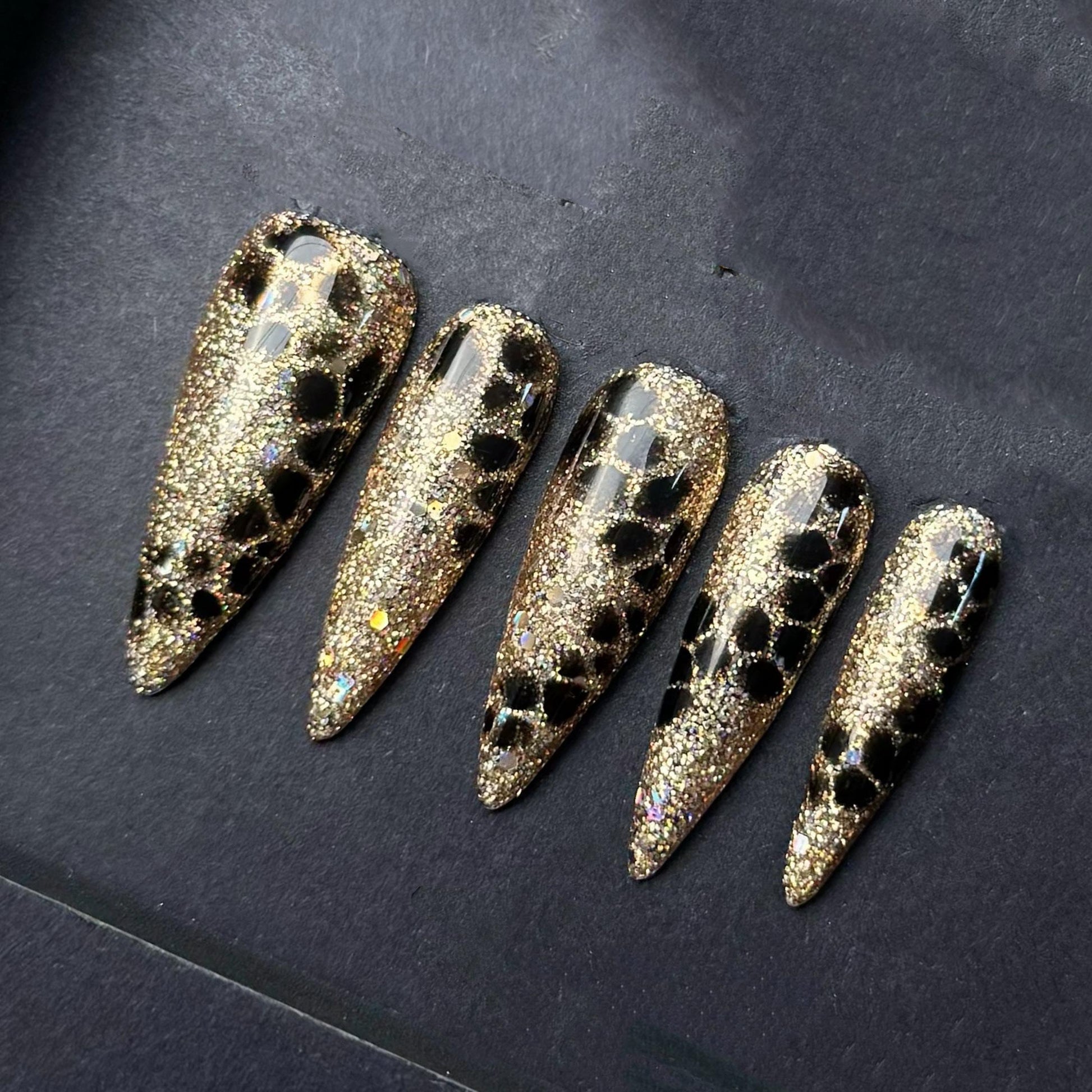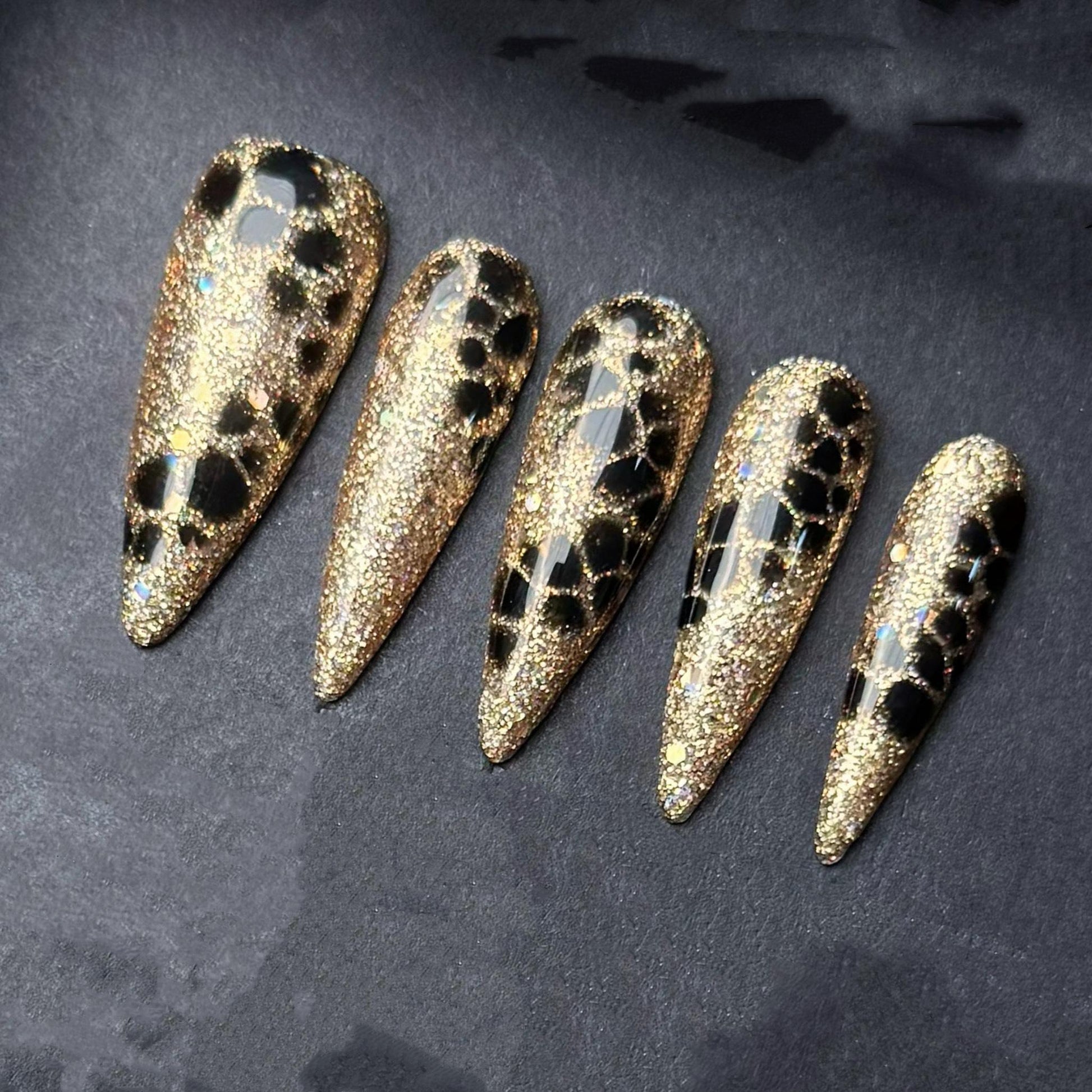 These bold press on nails feature a dazzling gold glitter base with striking black leopard print accents The fierce stiletto shape and high shine finish make this set perfect for glamorous nights and confident statement style