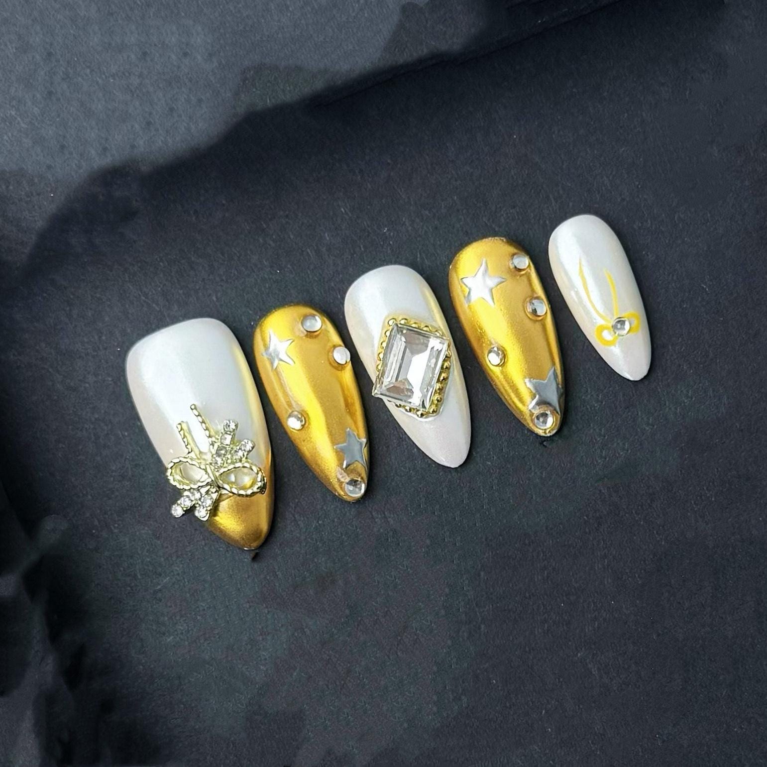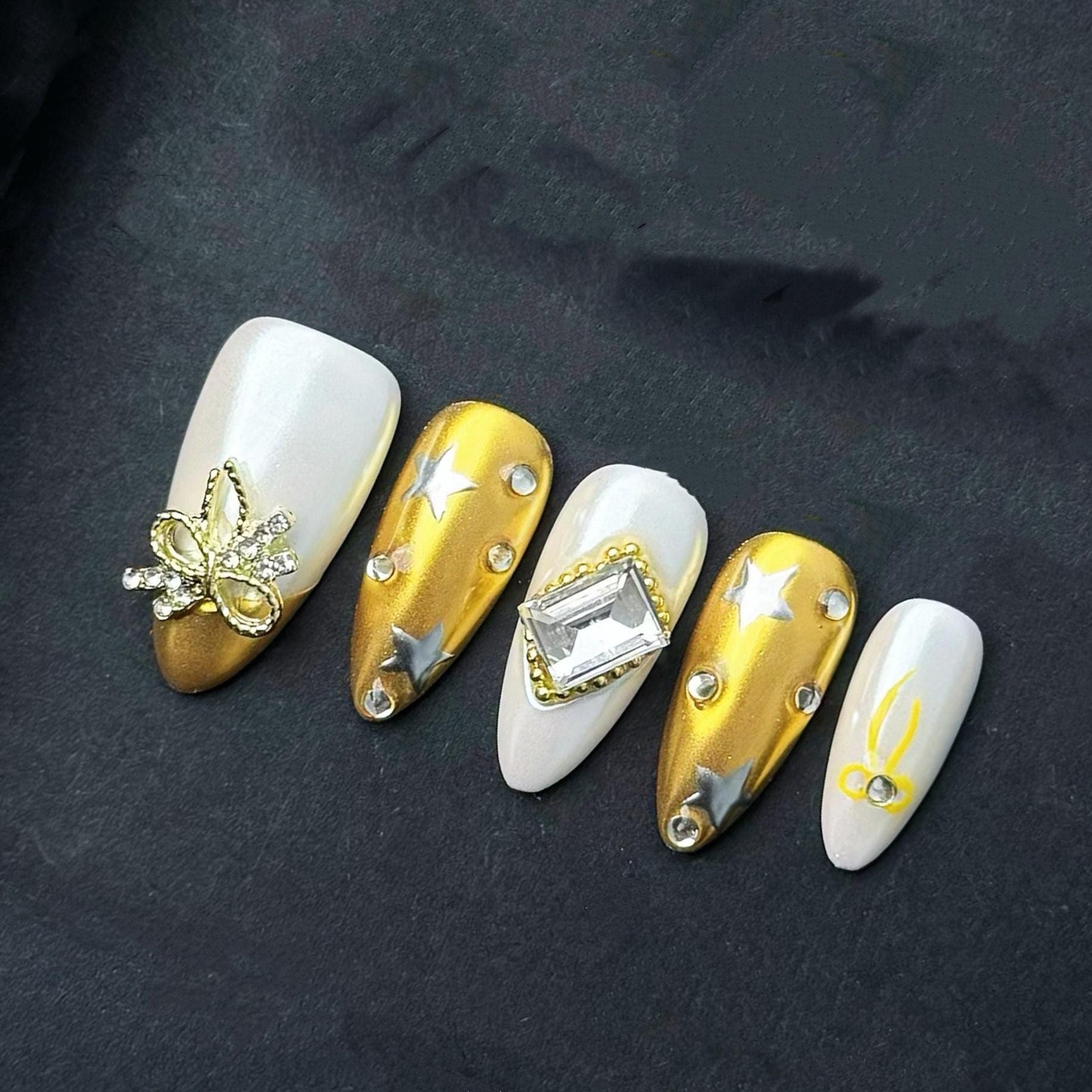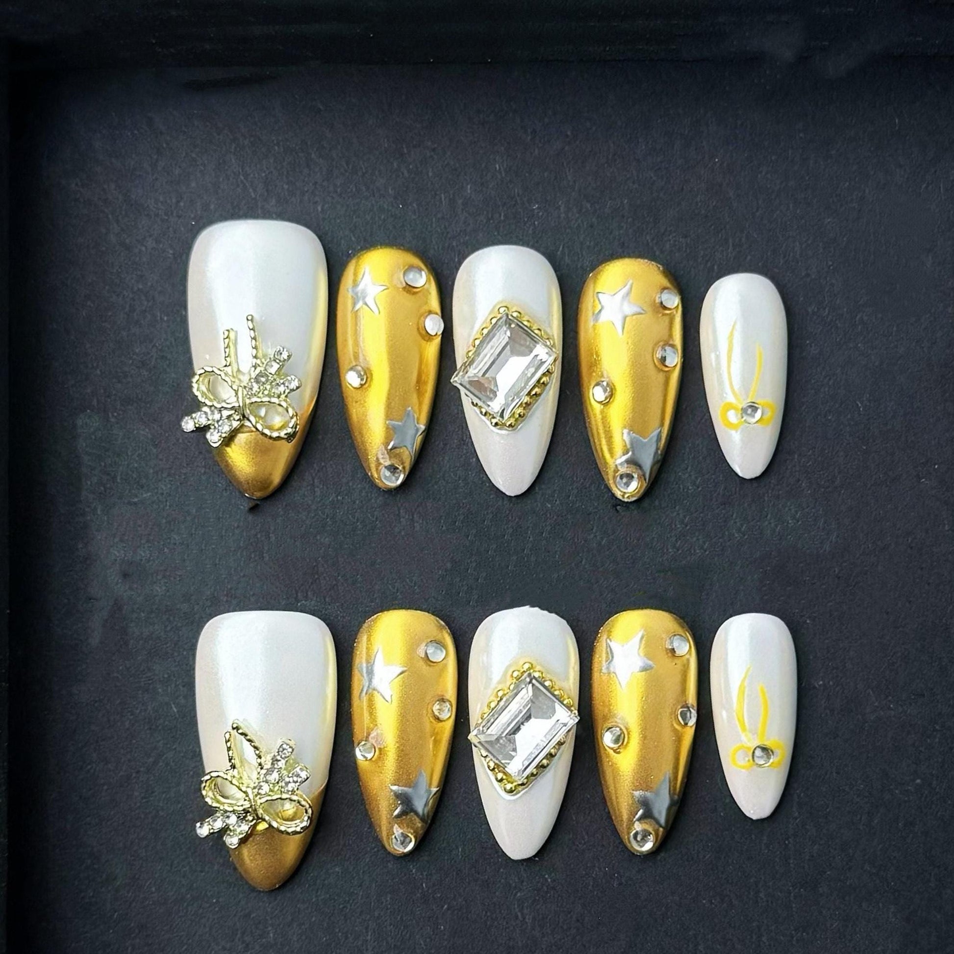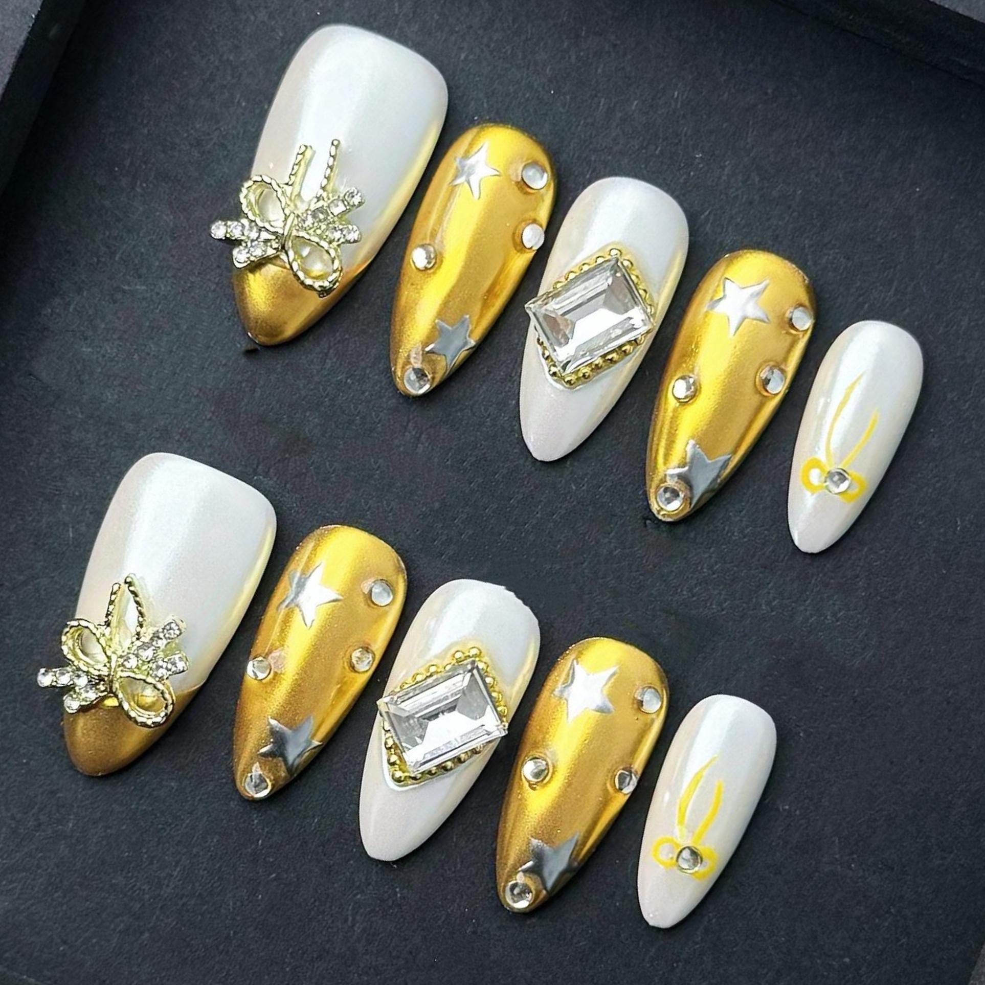 Radiate elegance with these Gold and White Press-On Nails, designed to shine with sophistication. This almond-shaped set features a stunning pearlescent white paired with rich gold chrome accents. Each nail is decorated with silver stars, gem-like studs, large square rhinestones, and charming 3D gold bows. The combination of clean lines, metallic shine, and crystal embellishments makes this set perfect for parties, holiday celebrations, or anytime you want your nails to stand out with a polished glam look. Easy to apply and reusable, this set adds a luxe touch without the salon trip.