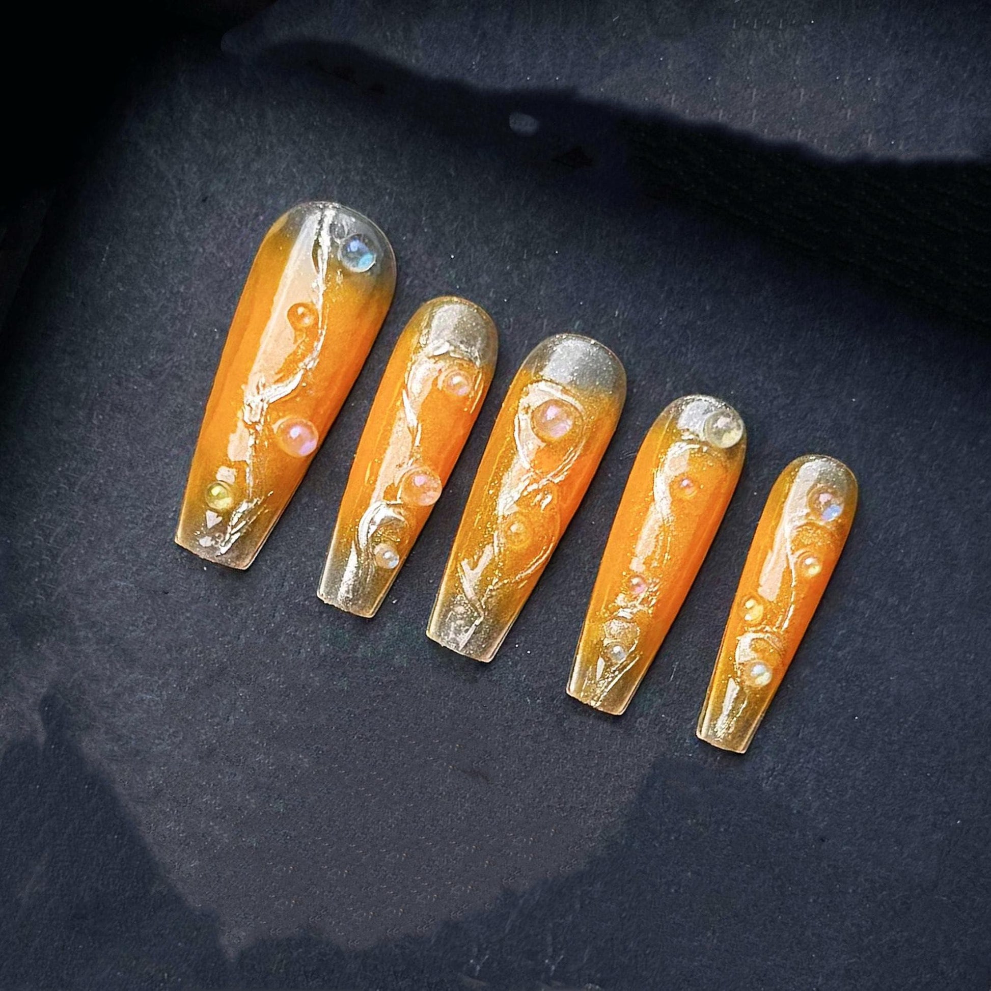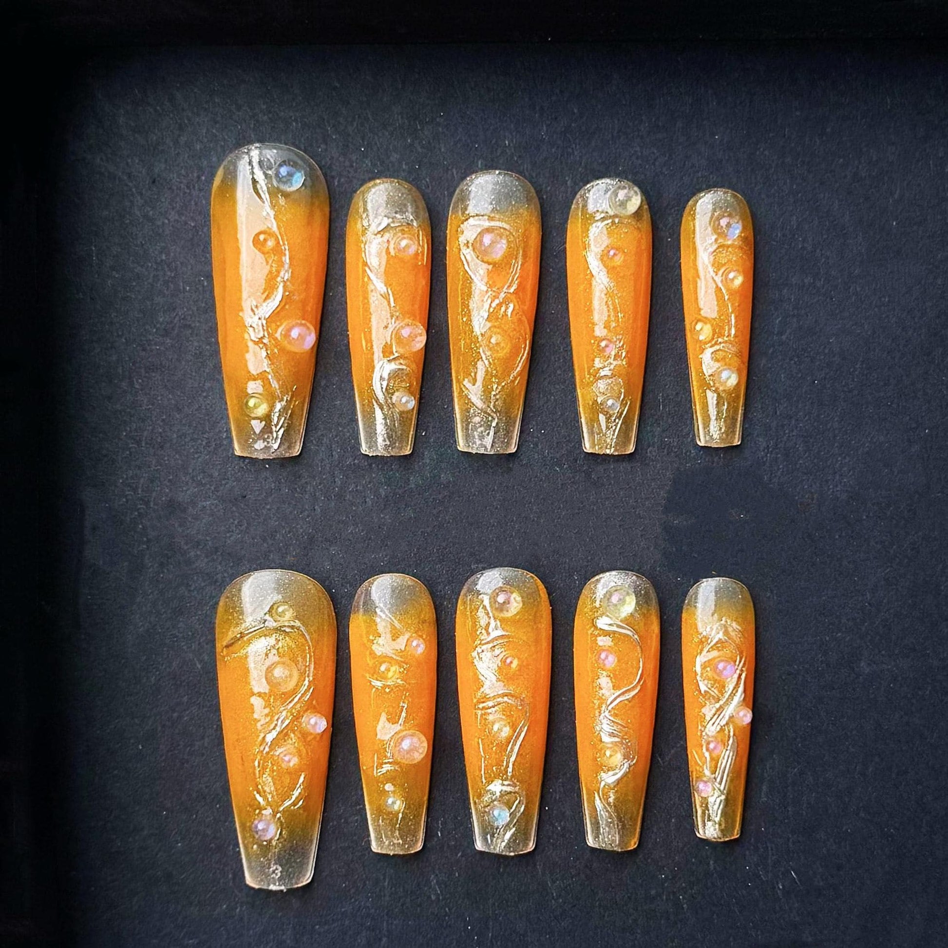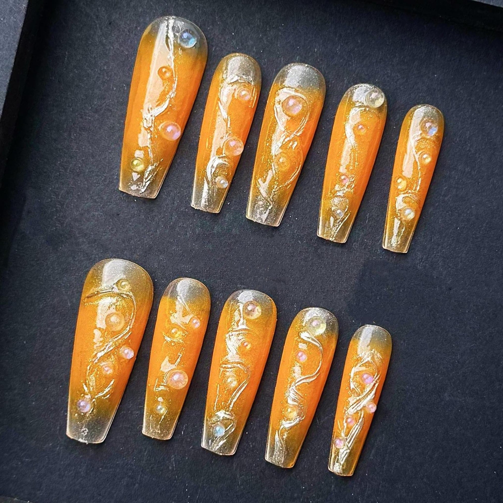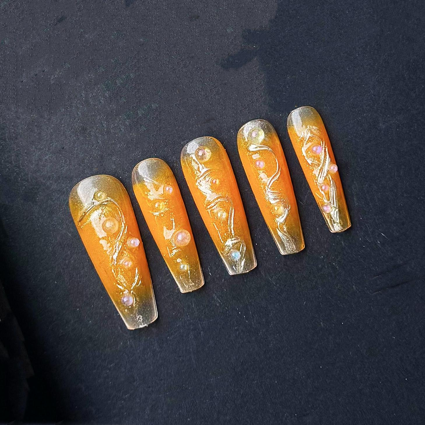 This luxurious press-on nail set features a radiant blend of orange and golden hues that mimic the brilliance of a summer sunrise. Each long, square-shaped nail is adorned with intricate 3D jelly designs and delicately placed iridescent pearls and gems, creating a high-shine finish with dimensional depth. The semi-transparent golden tips fade into a vibrant amber base, giving a luminous, ethereal glow. Ideal for summer vacations, special events, or statement-making everyday glam, these nails are both bold and elegant.