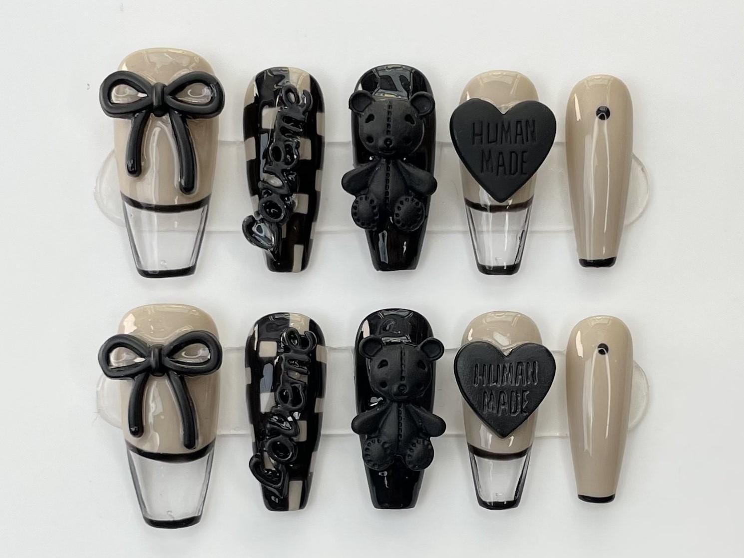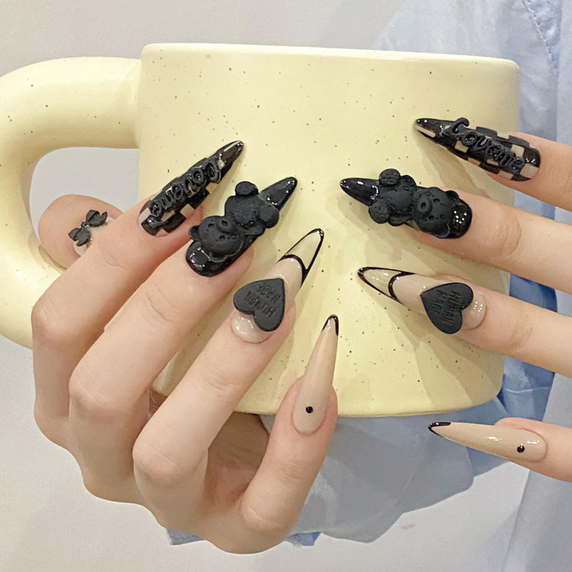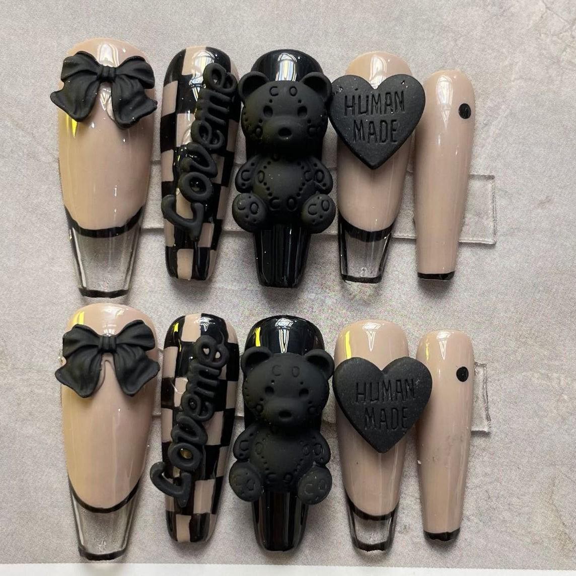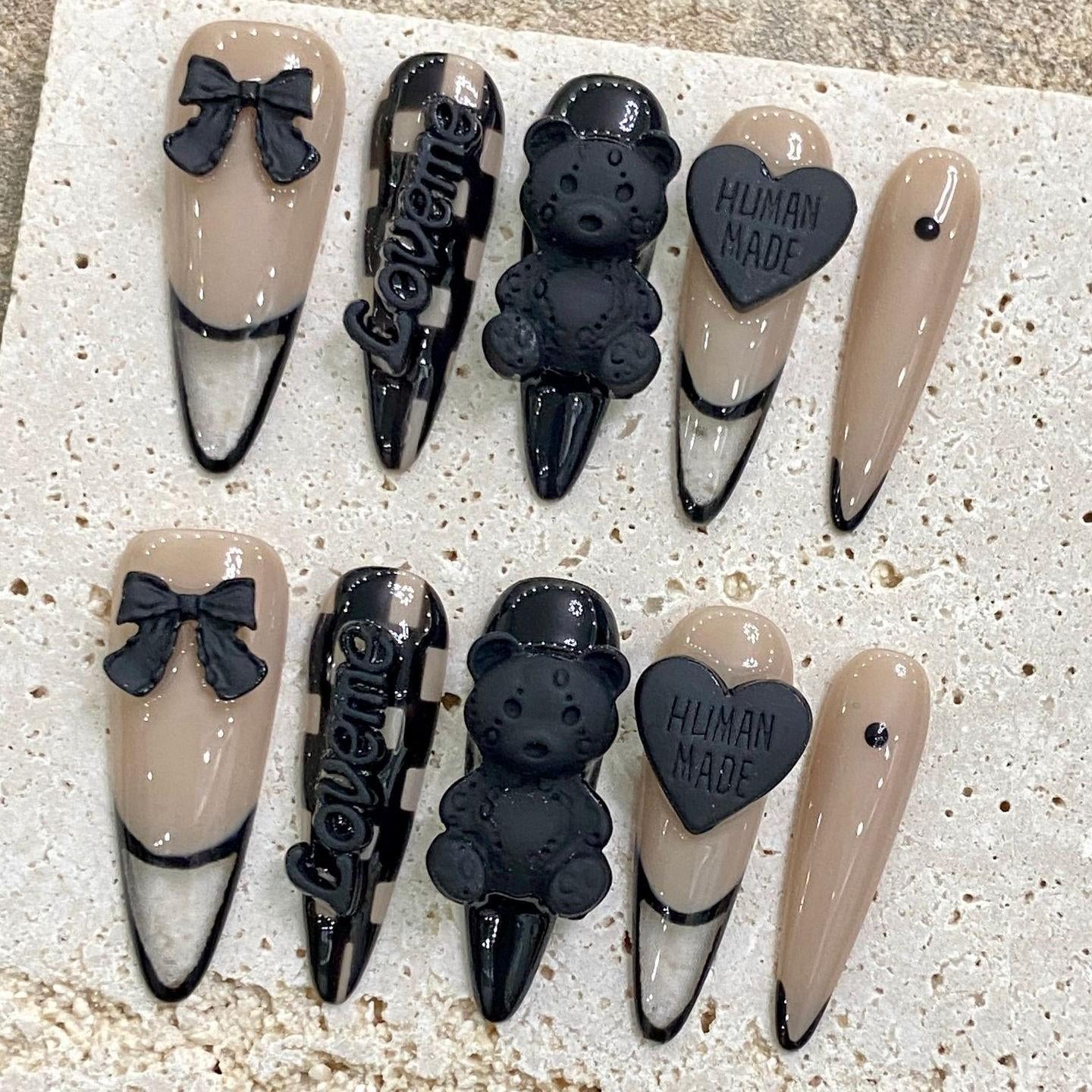 Gothic Bear Love Press-On Nails Matte Black 3D Charm Nude Set glue on artificial faux black teddy bears bows heart charms art long stiletto