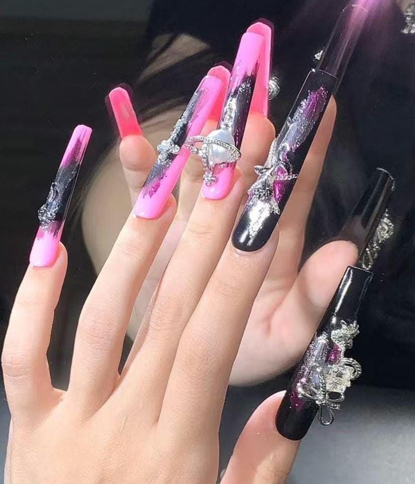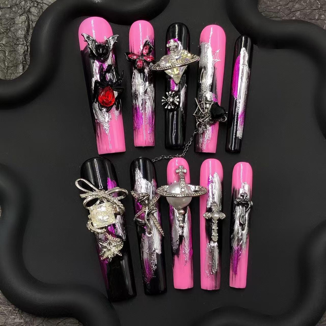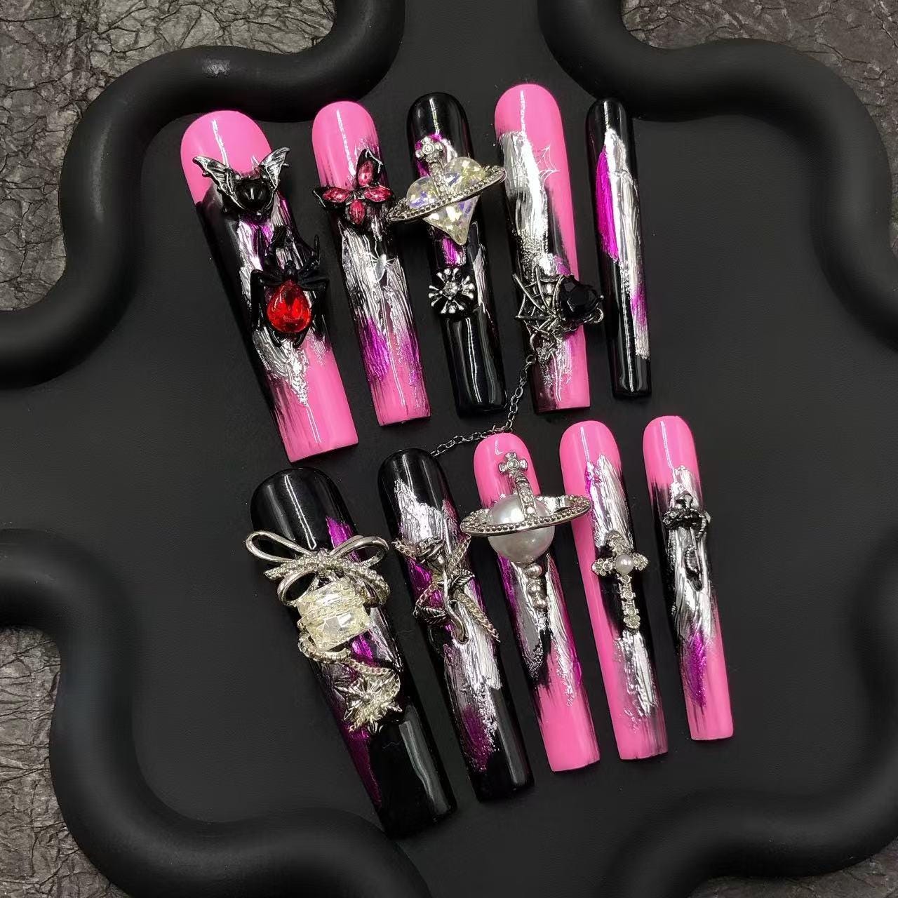 Step into the dark glam zone with these pink and black gothic press-on nails, accented with bold silver strokes and intricate 3D charms—bats, spiders, bows, and celestial orbs. These long coffin nails are a fierce fusion of edgy and feminine, perfect for alt fashion, Halloween vibes, or year-round statement looks.