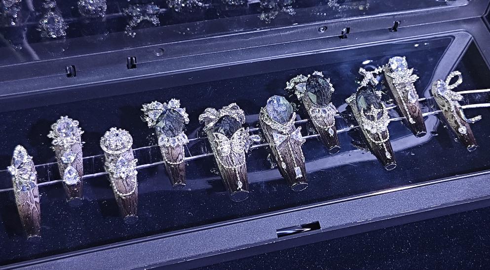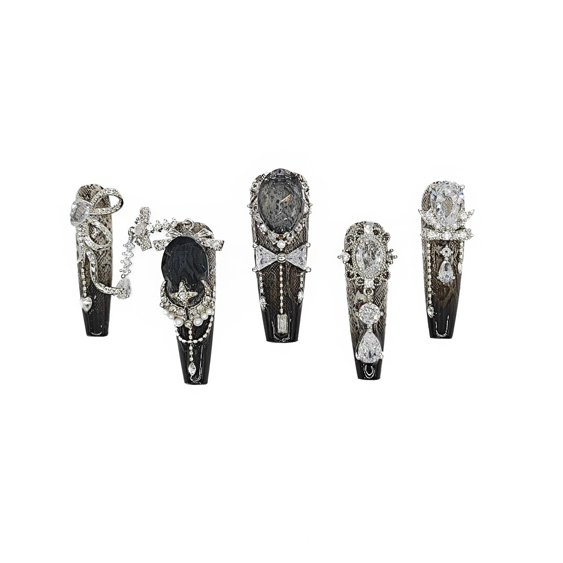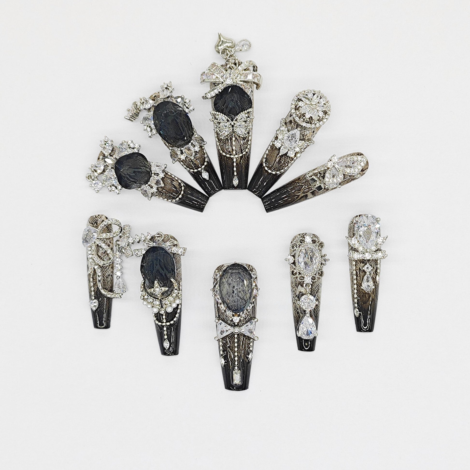 Make a bold statement with these gothic glam press-on nails. Featuring a rich black base with lace-like detailing, oversized 3D rhinestones, and intricate silver embellishments, this luxury coffin nail set is perfect for dark elegance, formal events, or high-fashion looks.
