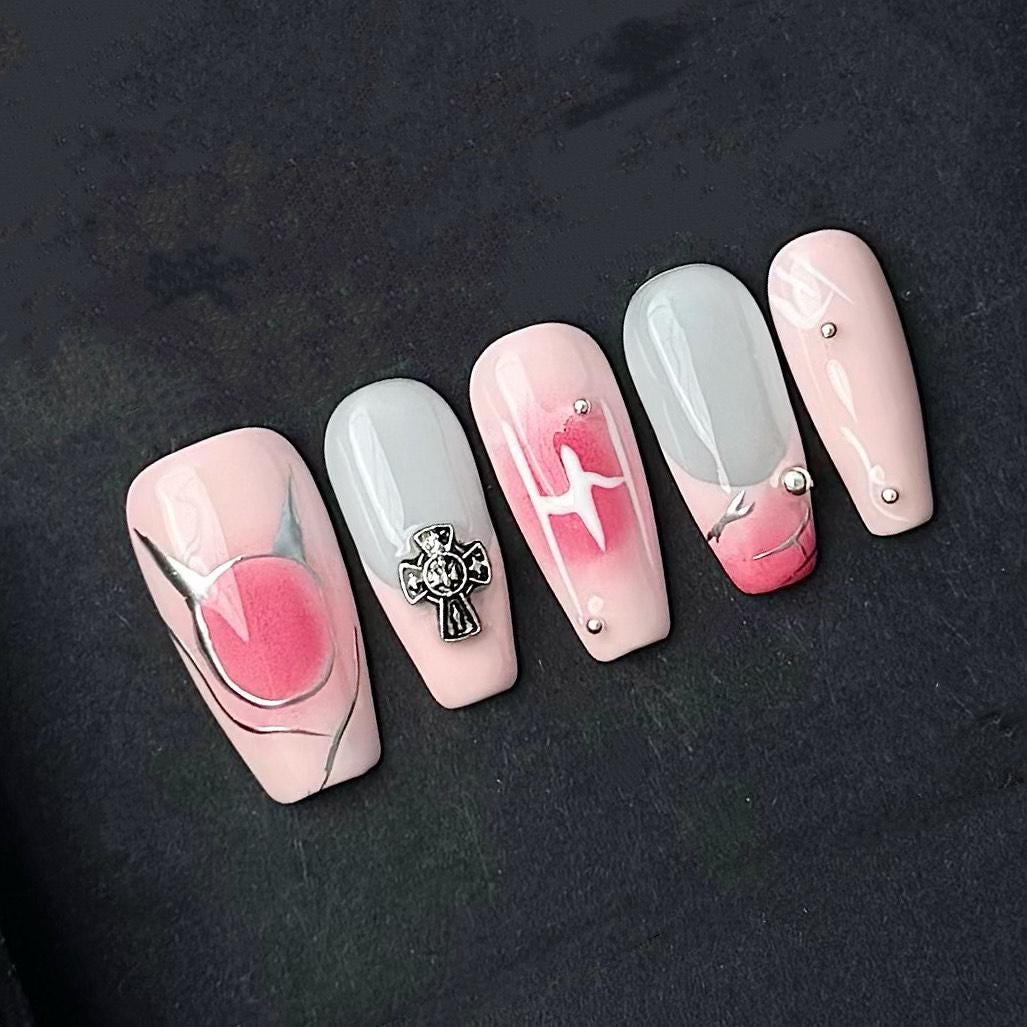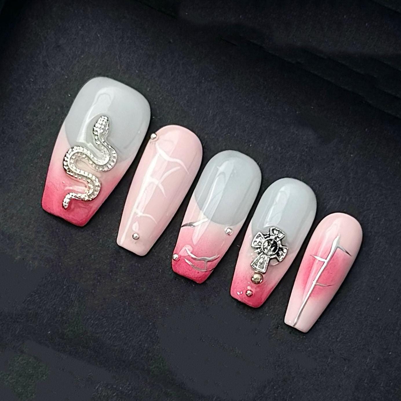 This edgy and elegant press-on nail set features soft pink and grey ombre tones with silver snake and cross charms for a gothic-chic look. Subtle lightning accents and gemstone details add the perfect touch of dark glamour and rebellious style.