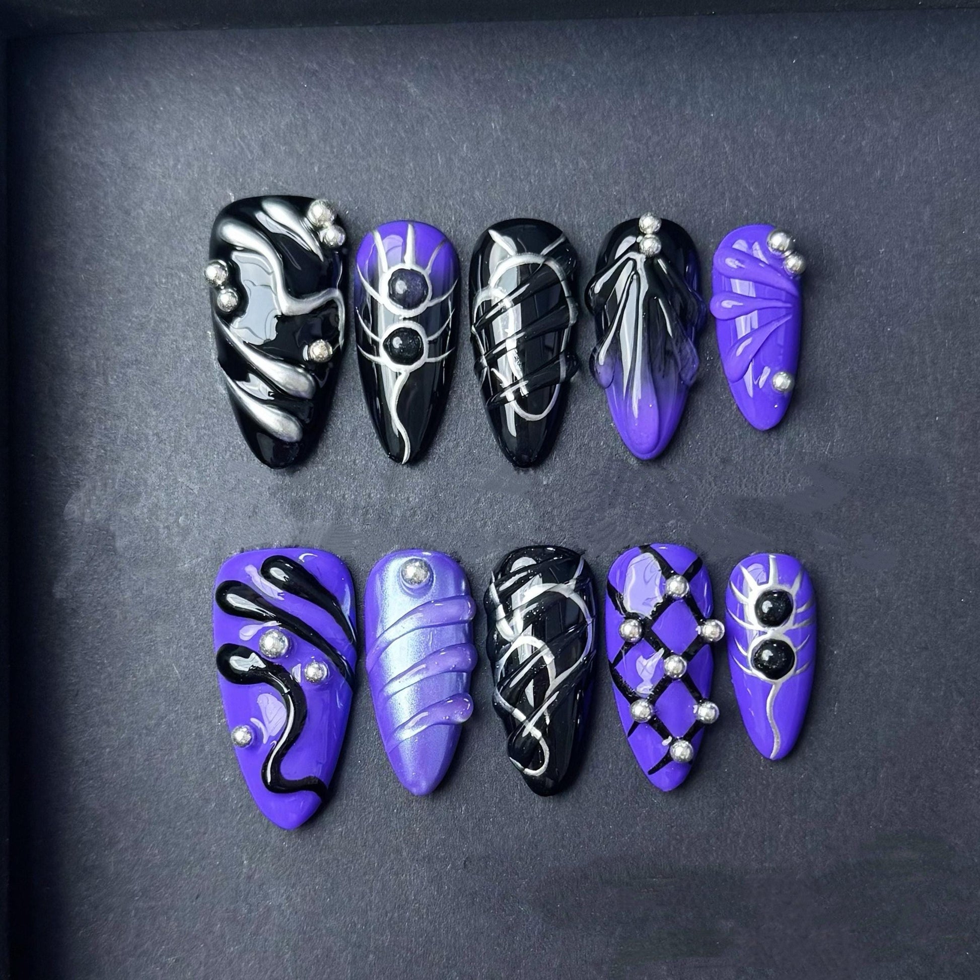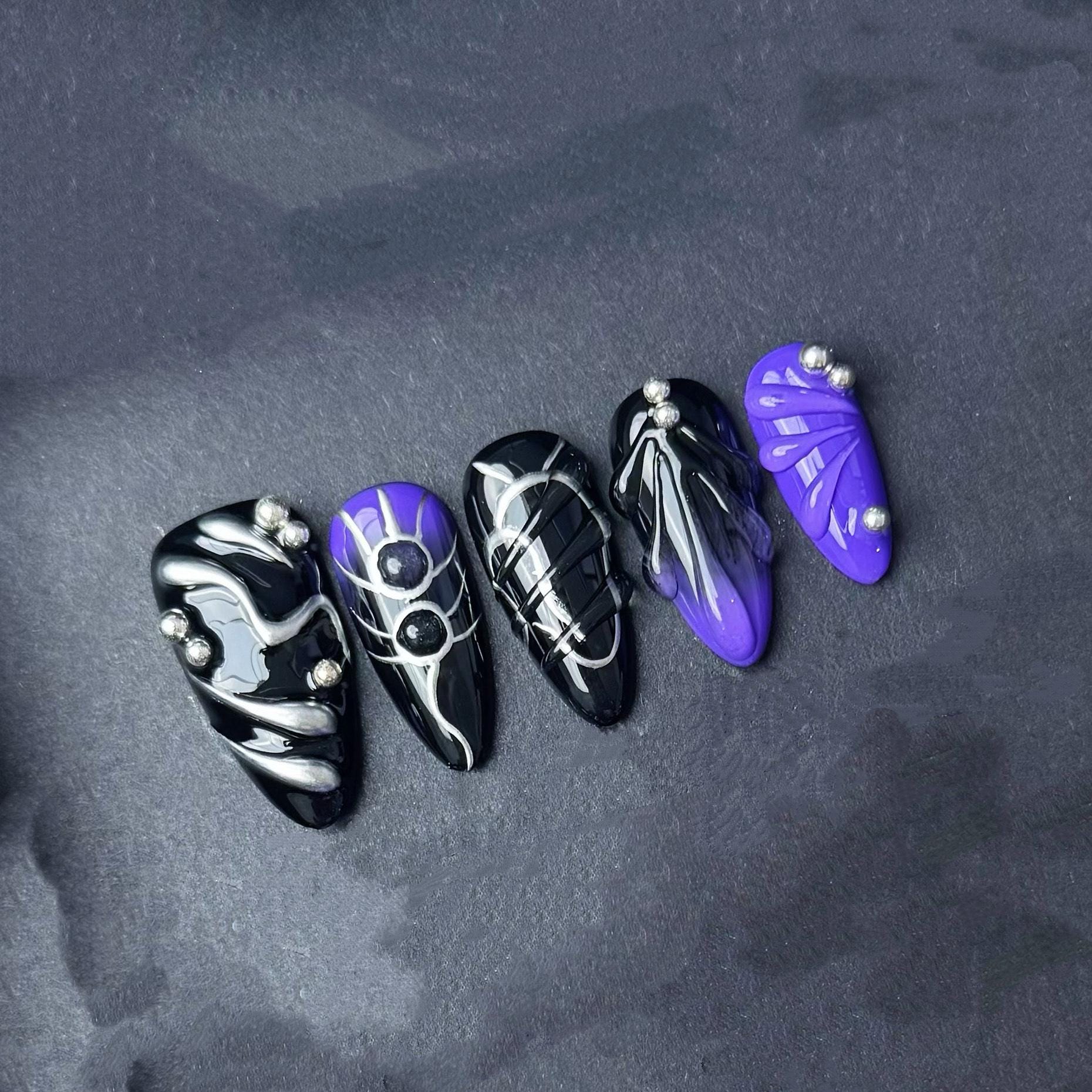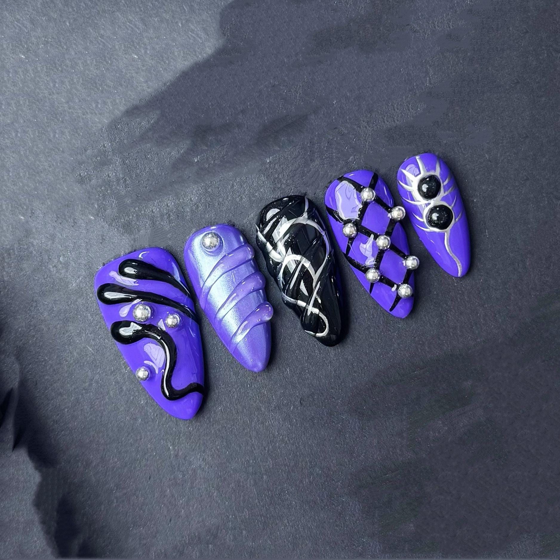 This gothic inspired press on nail set features a dramatic mix of purple and black with bold 3D chrome bead accents and textured abstract designs Each nail is handcrafted with a unique blend of glossy finishes sculpted patterns and high contrast colors Perfect for making a bold style statement these reusable nails bring a fierce edge to your look