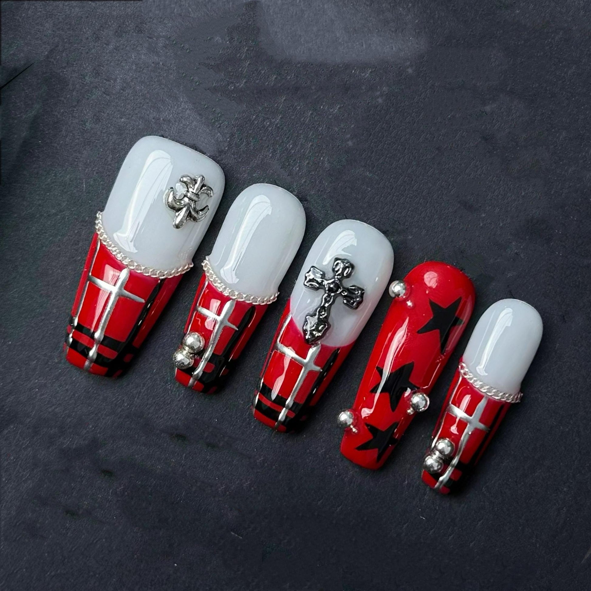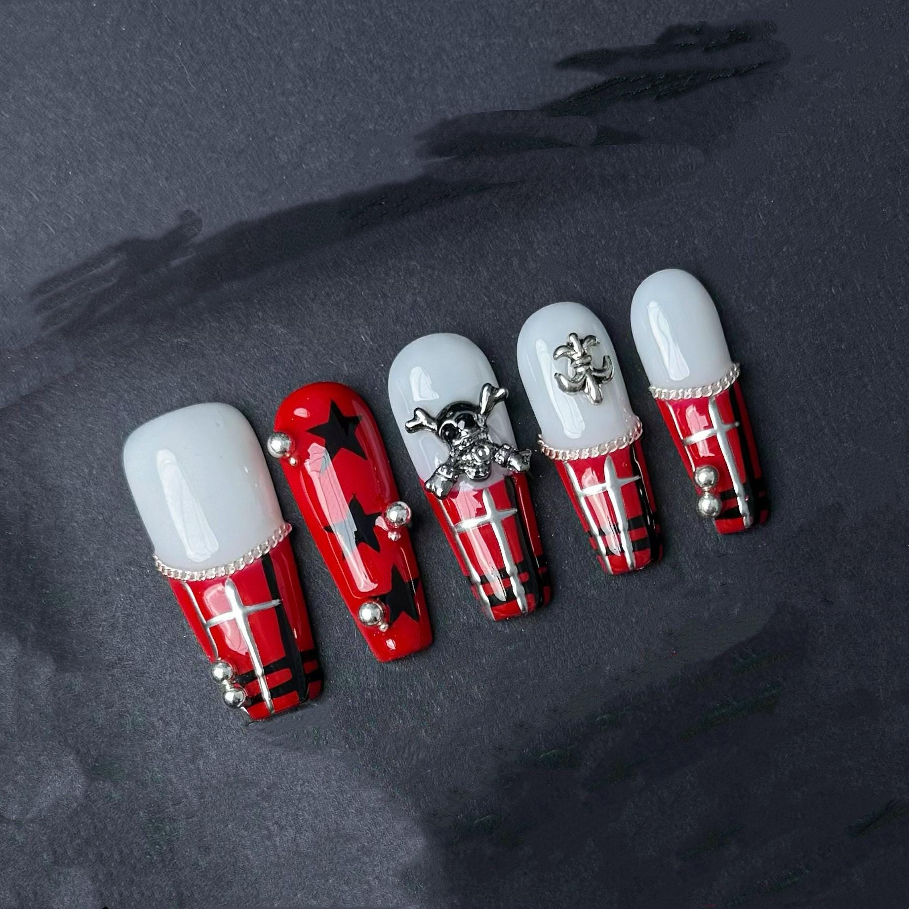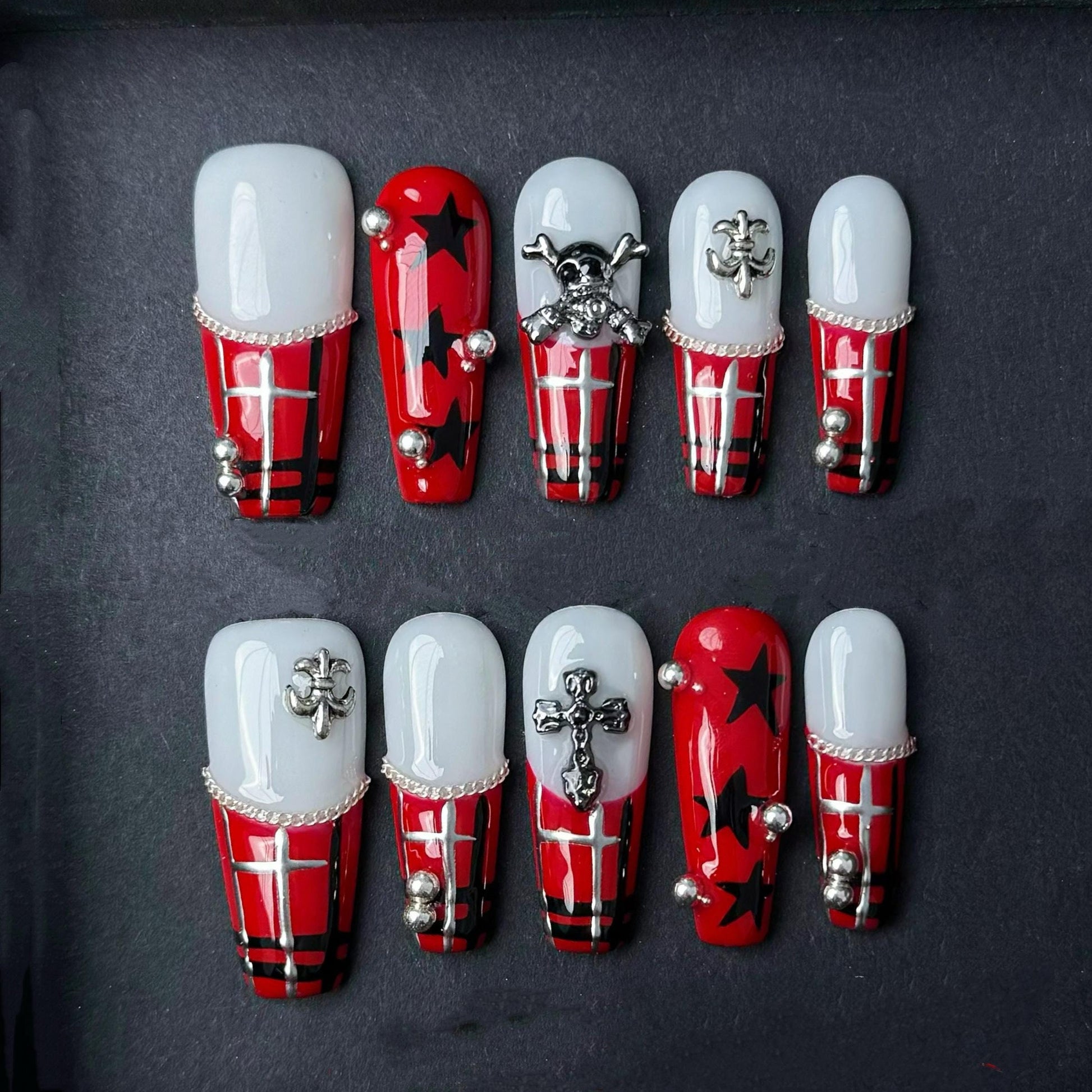 Gothic Red Plaid Press On Nails with Skulls Stars and Cross Charms Manicure press on artificial glue on faux reusable trendy nail