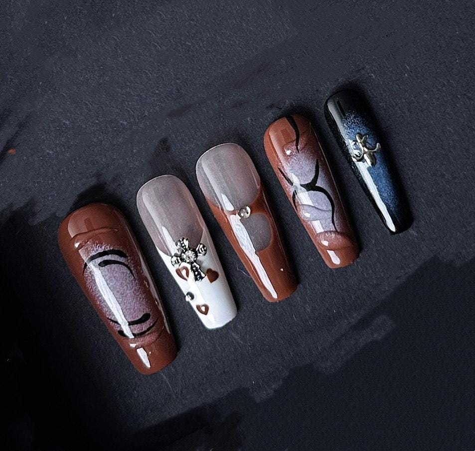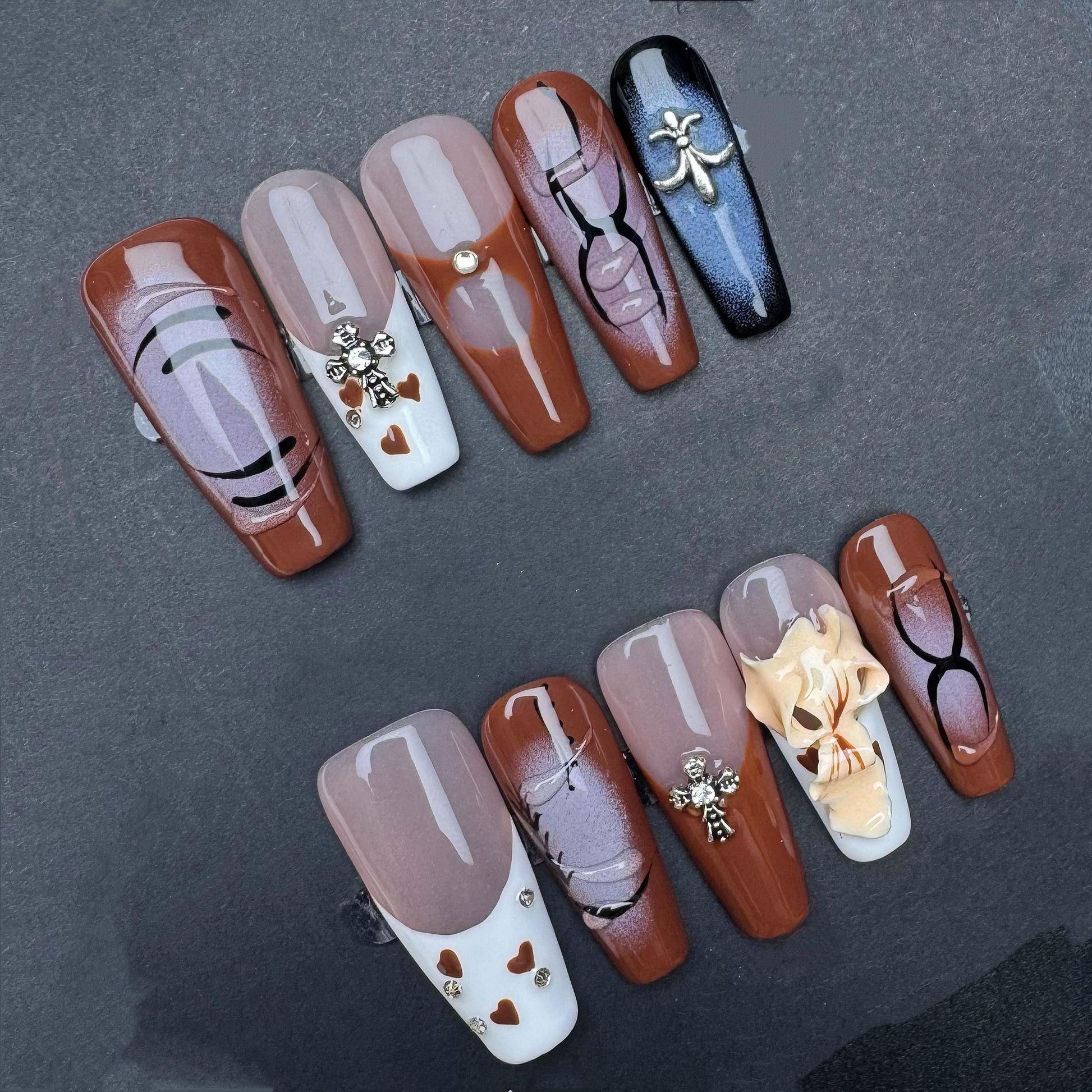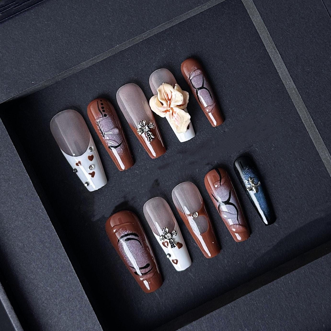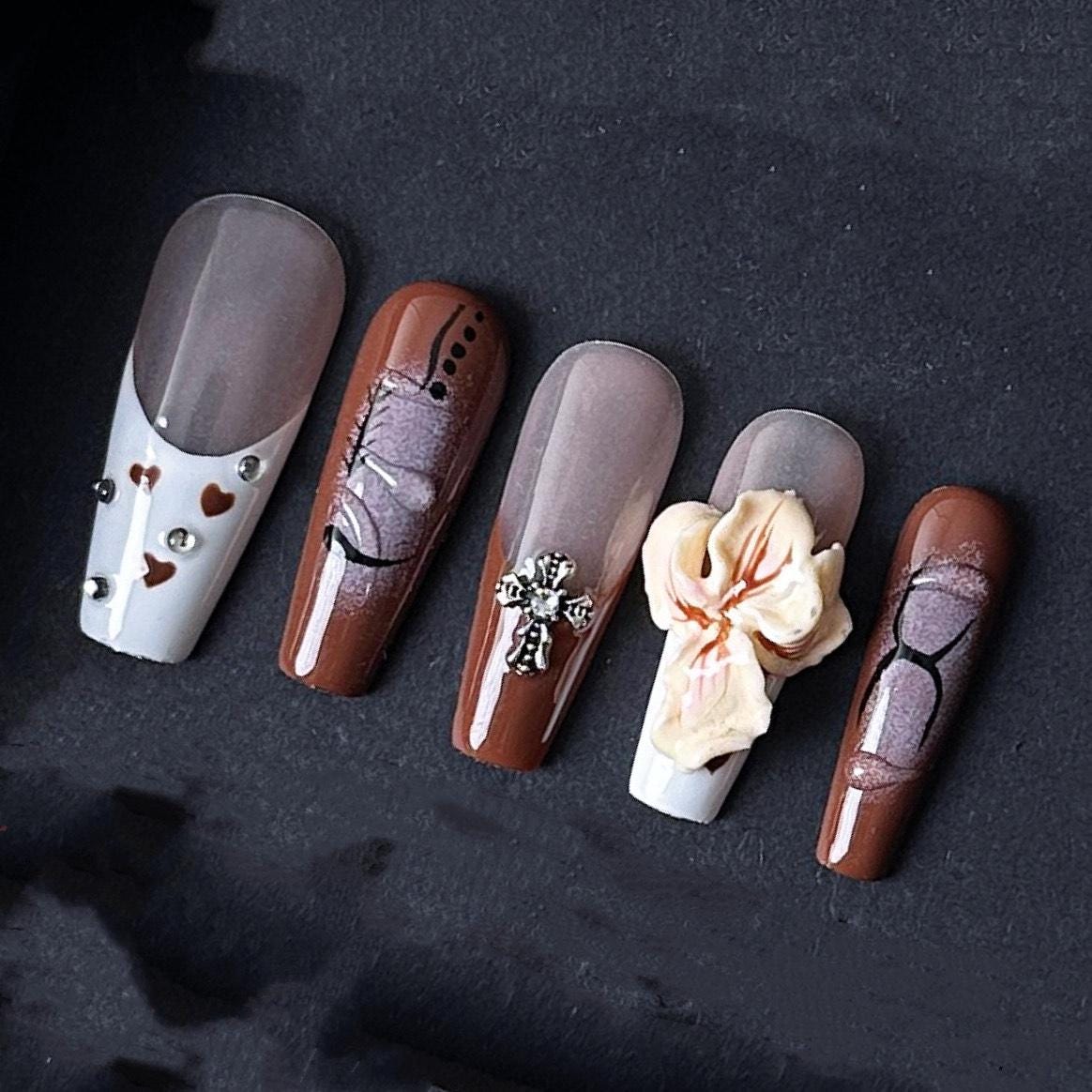 This dramatic press on nail set combines rich browns and muted whites with gothic elements including heart accents silver cross charms abstract art and 3d floral designs perfect for a bold romantic and edgy statement.