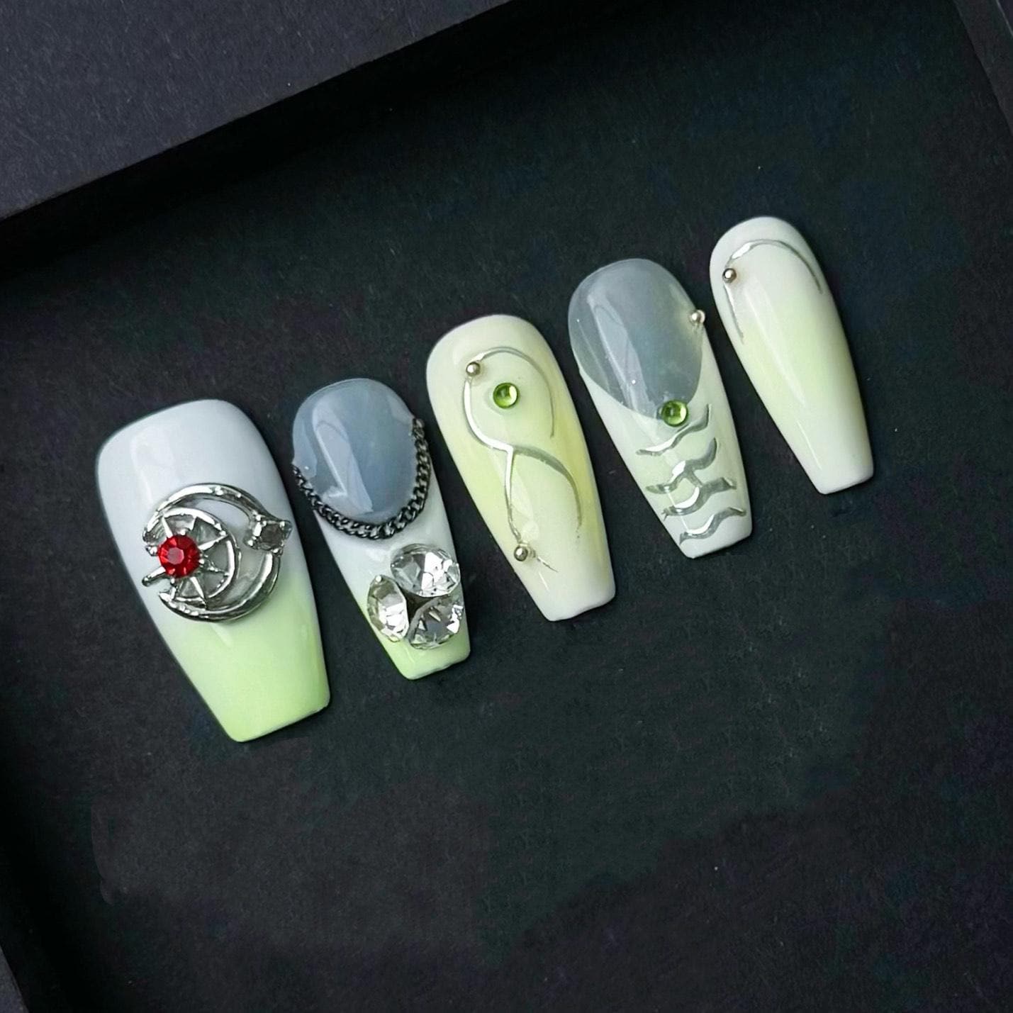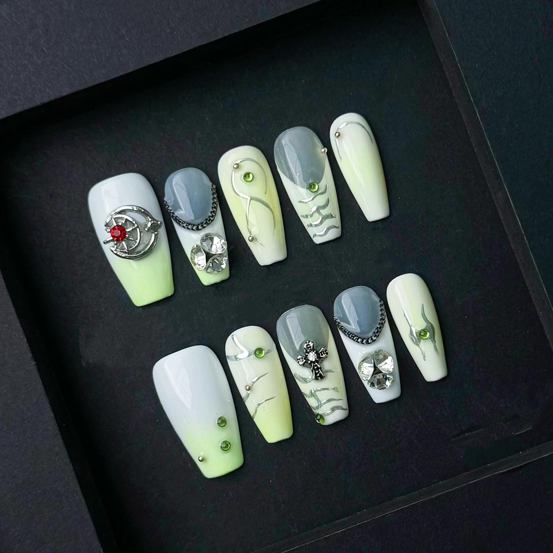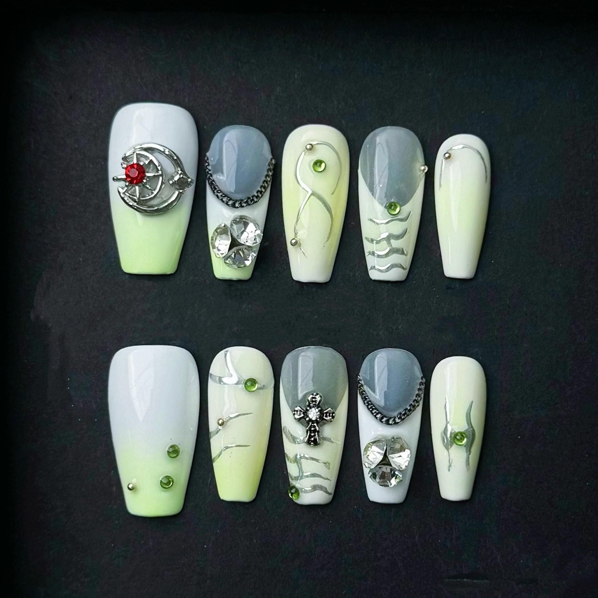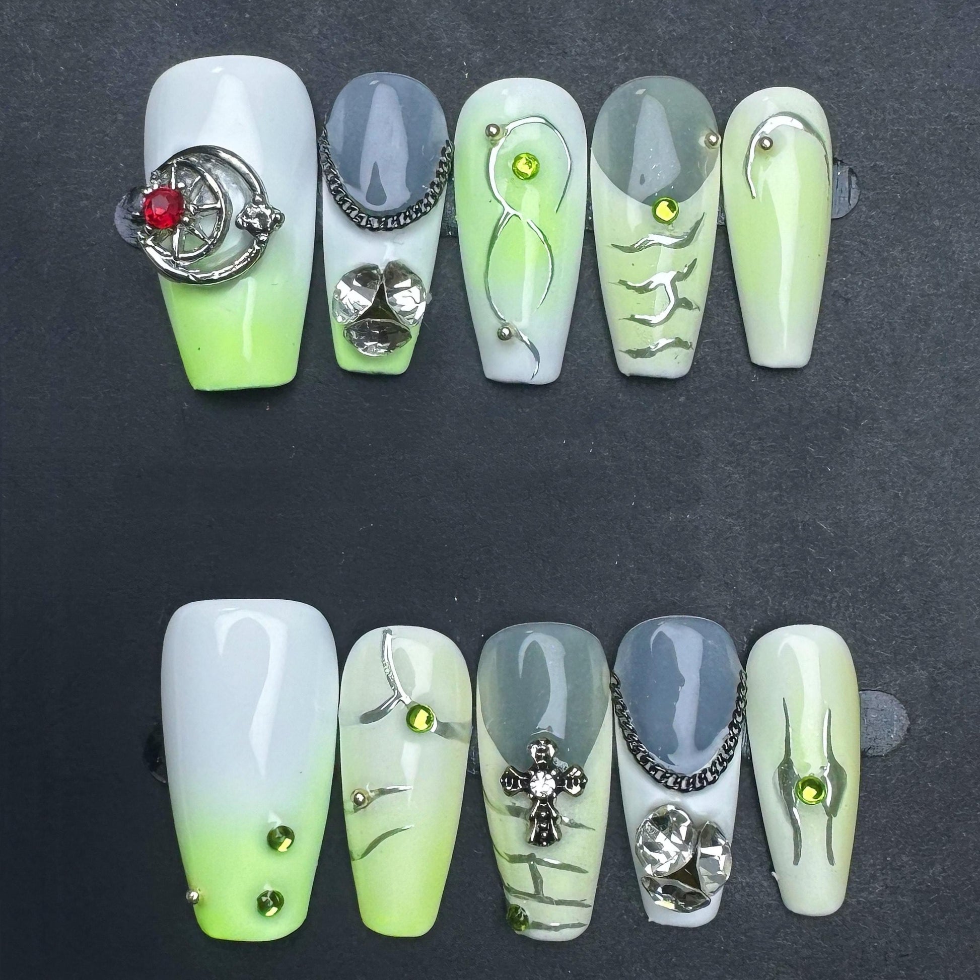 This avant-garde set of press on nails features a moody green-to-white ombré base mixed with glossy gray tips and high-contrast metallic accents. Chrome embellishments, neon green rhinestones, silver chains, and cross charms bring bold detail and texture to the abstract designs. Each nail has a unique arrangement of 3D elements—crystals, studs, and curved silver lines—creating an industrial, cyber-grunge aesthetic. Perfect for alternative fashion lovers or anyone looking to elevate their style with a rebellious edge. Handmade for a high-impact, art-forward finish.