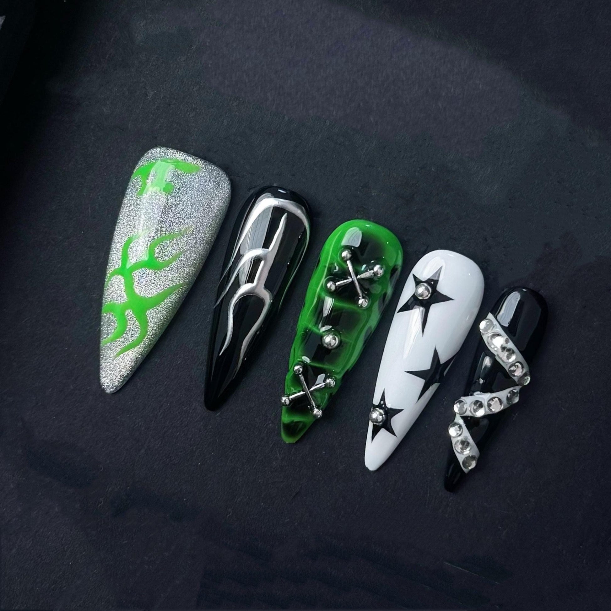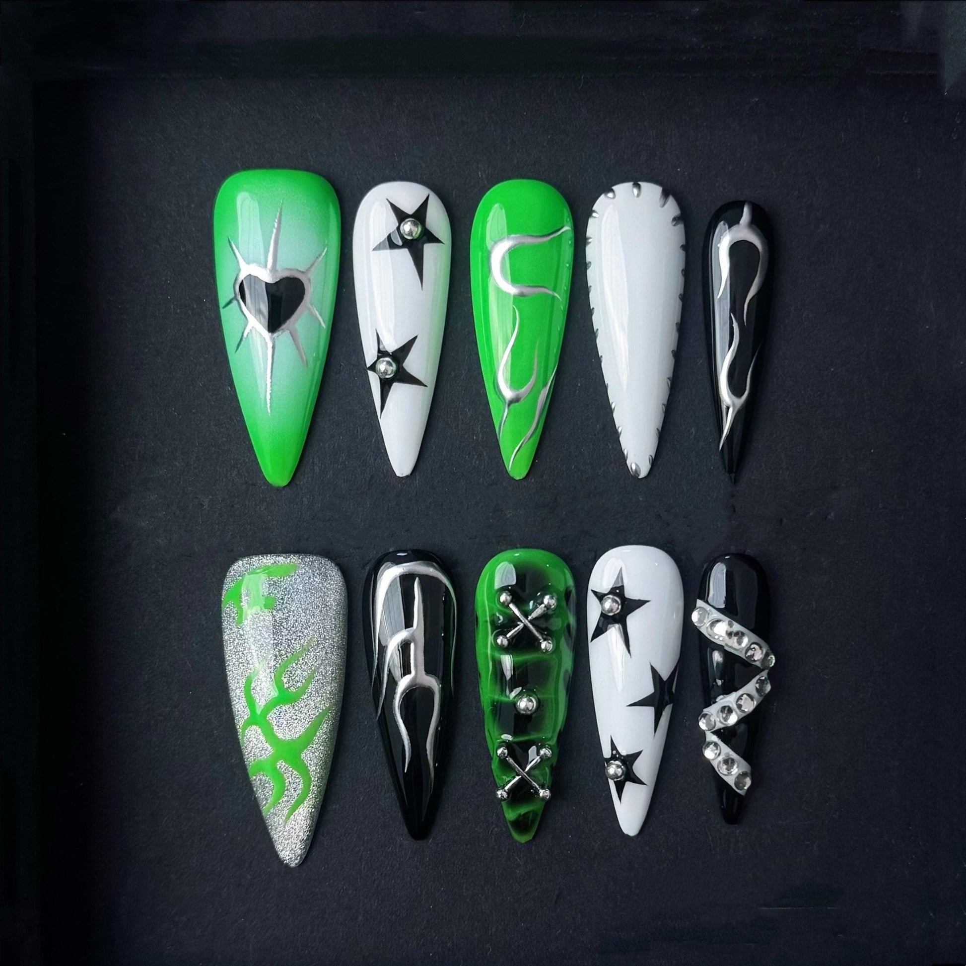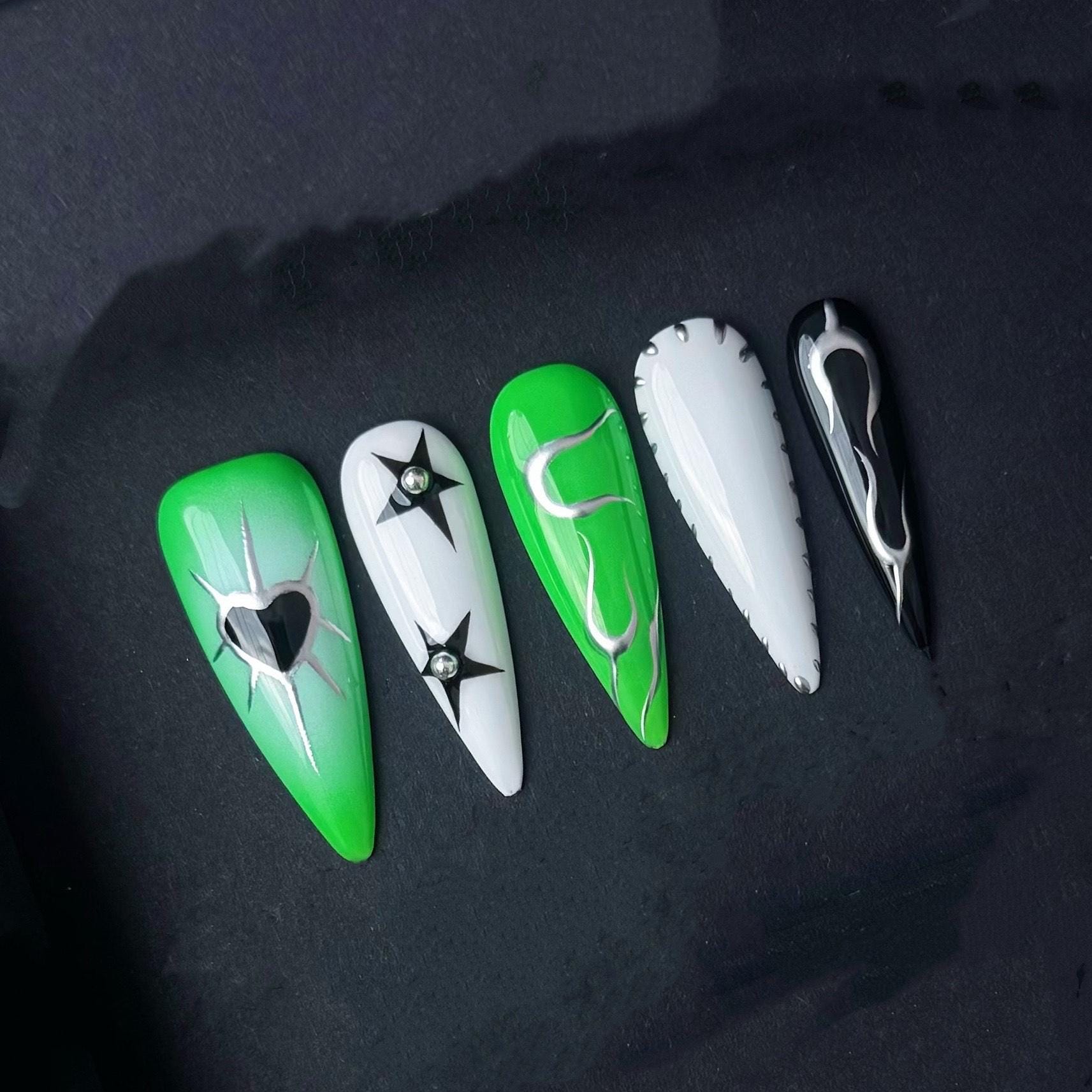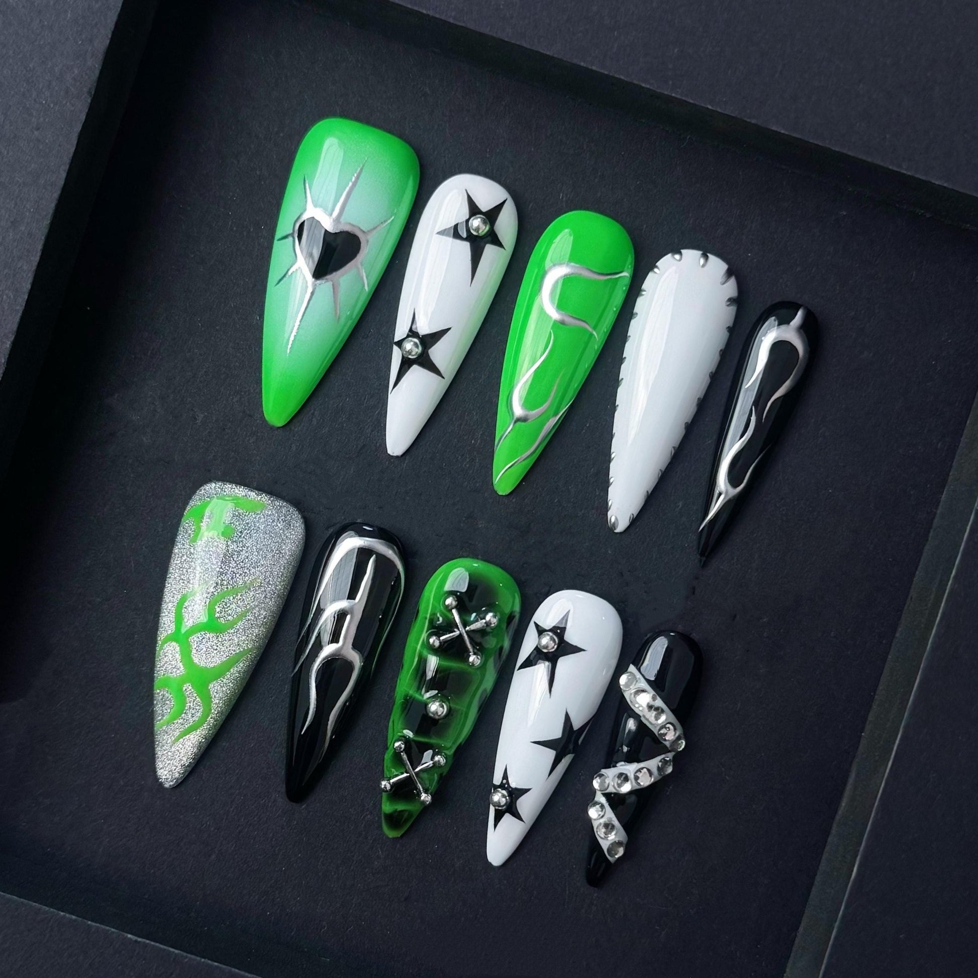 Unleash your cyber edge with this striking green black and white press-on nail set. Featuring a bold mix of chrome flames starbursts tribal-style graphics and metallic 3D accents these nails are the perfect blend of punk futuristic and alternative. The neon green pop against high-gloss black and white bases creates an electrifying look ideal for anyone into cybercore or rave aesthetics.