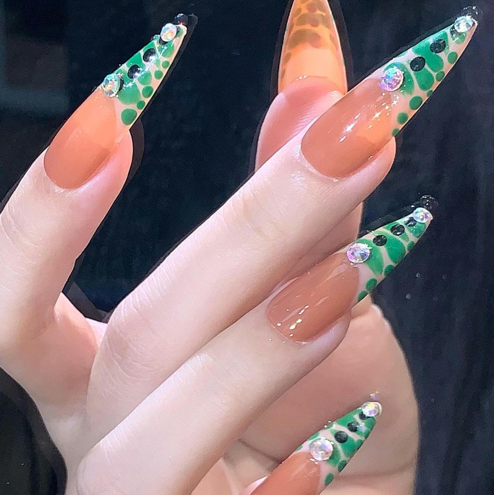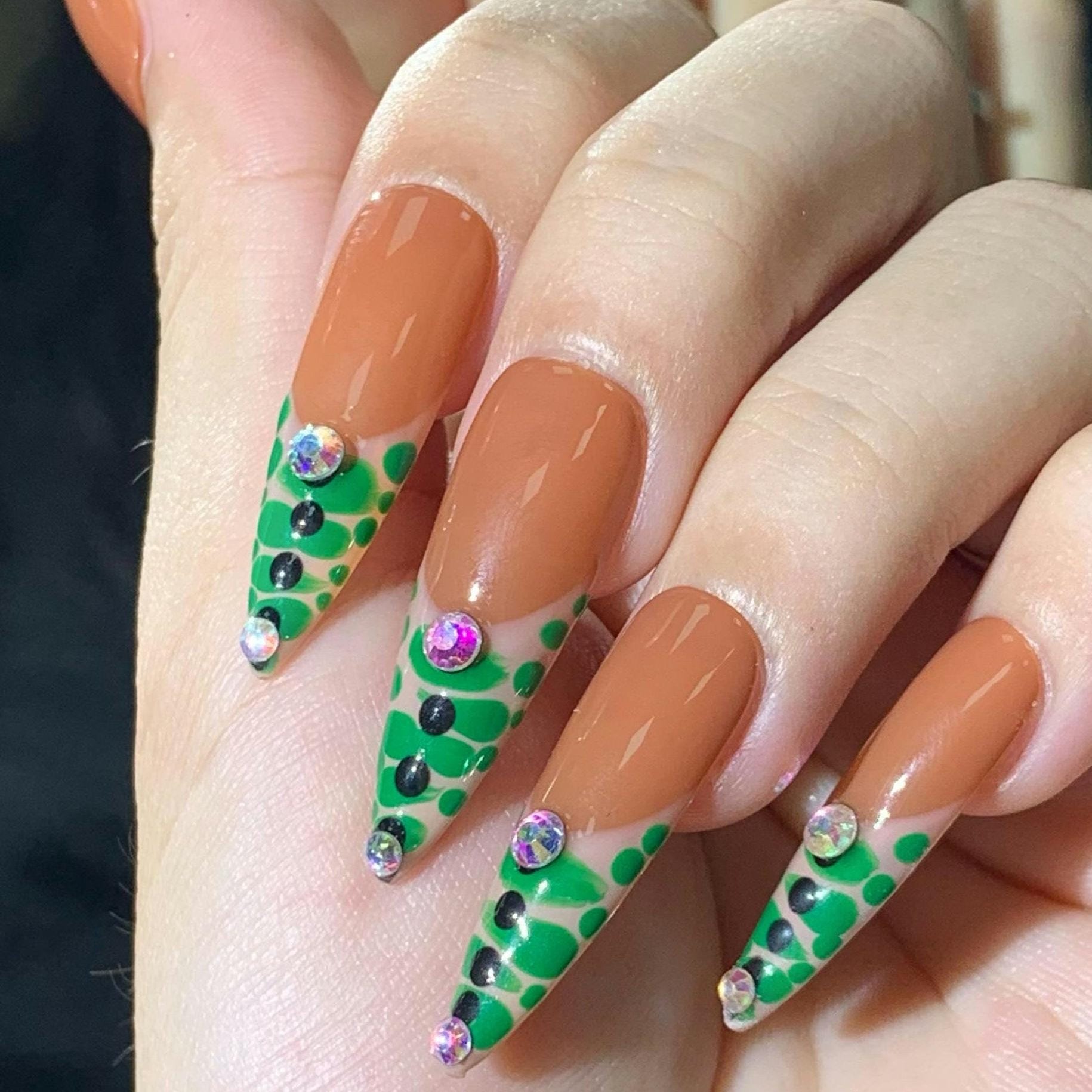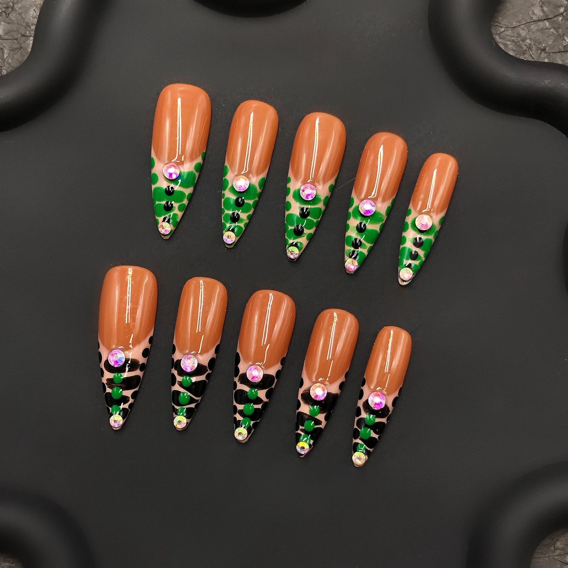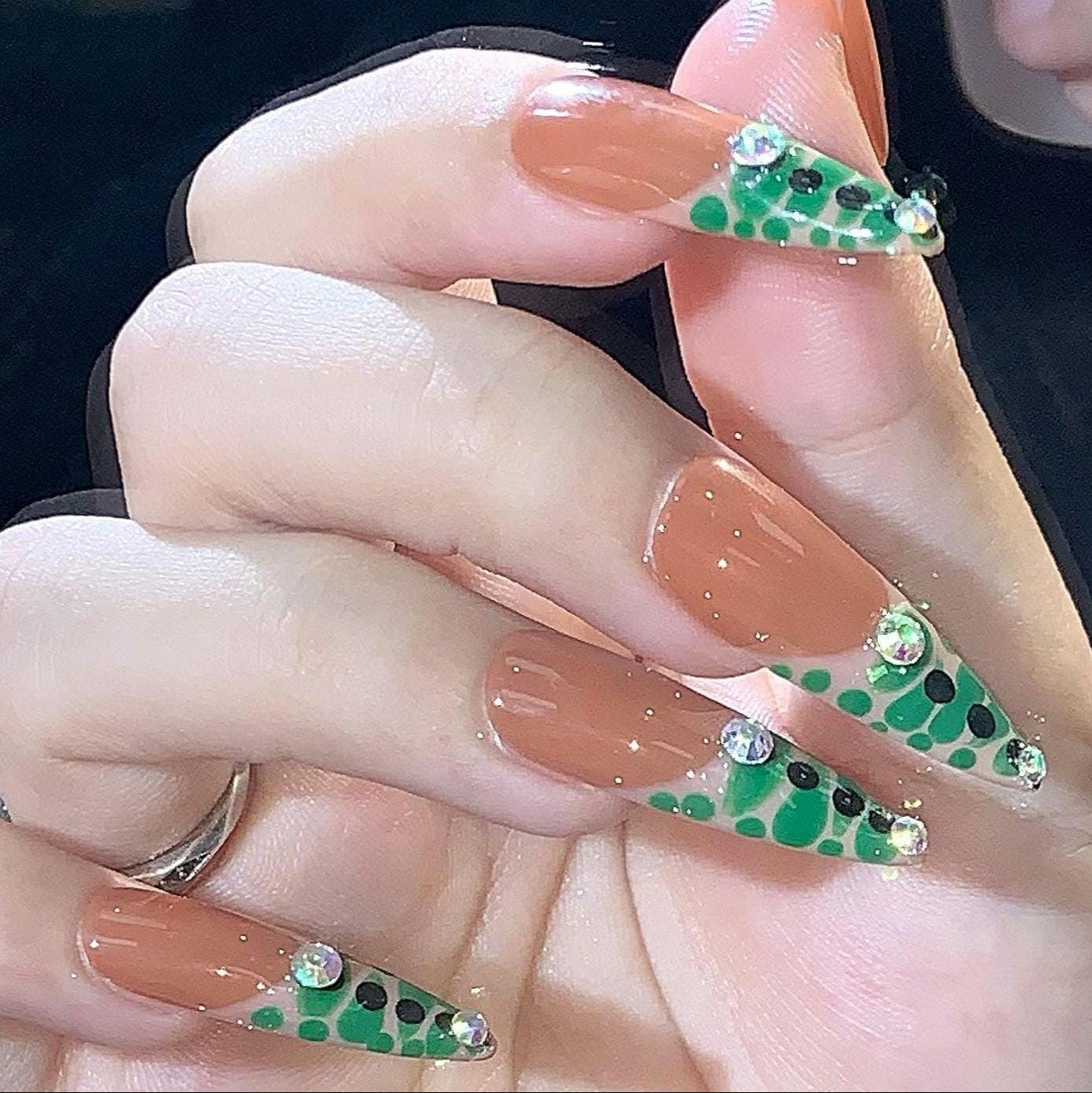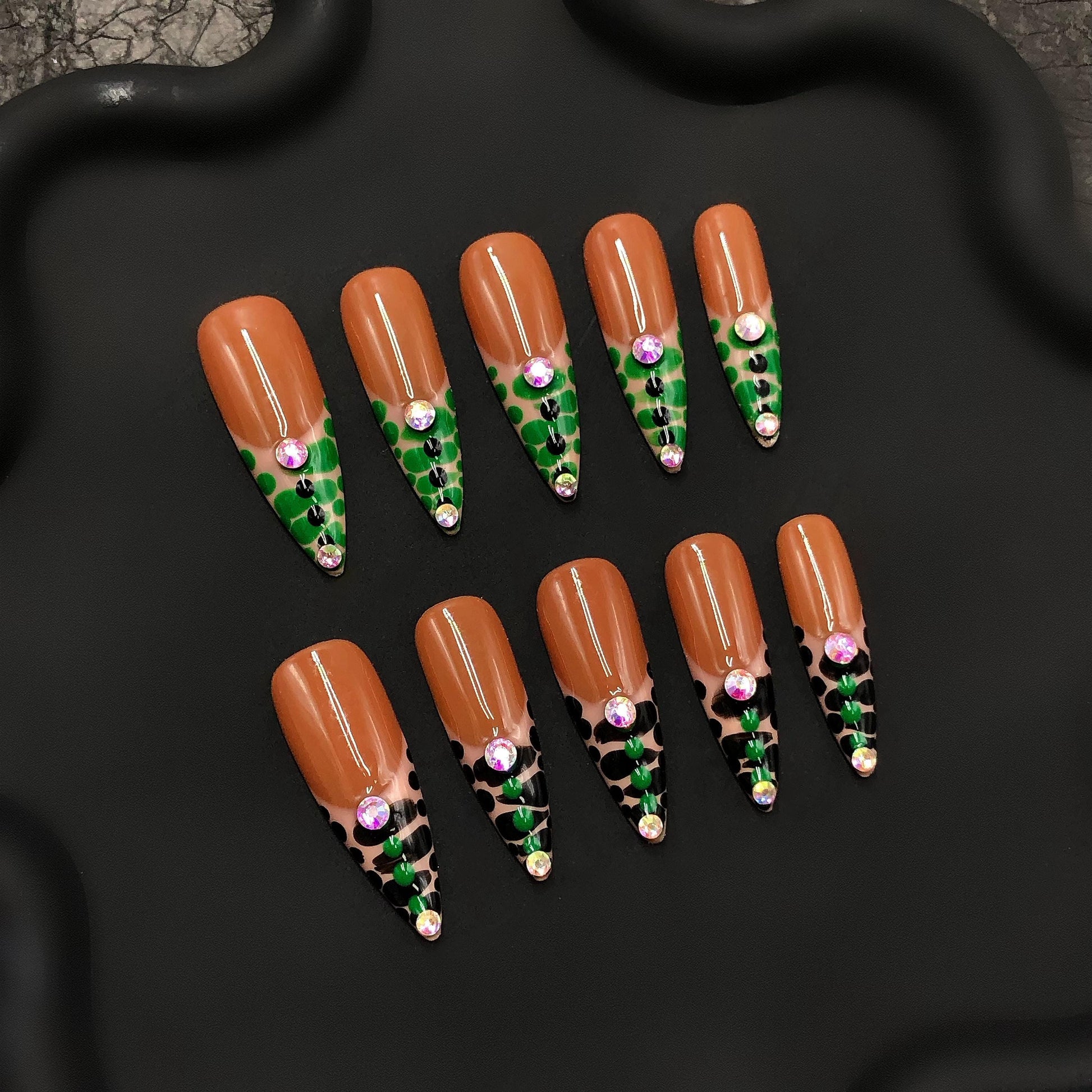 Fierce and fun, these press-on nails feature a bold green crocodile print over a rich brown base, finished with sparkling rhinestone accents. The medium stiletto shape adds drama, making them perfect for statement looks, themed events, or stylish everyday wear.