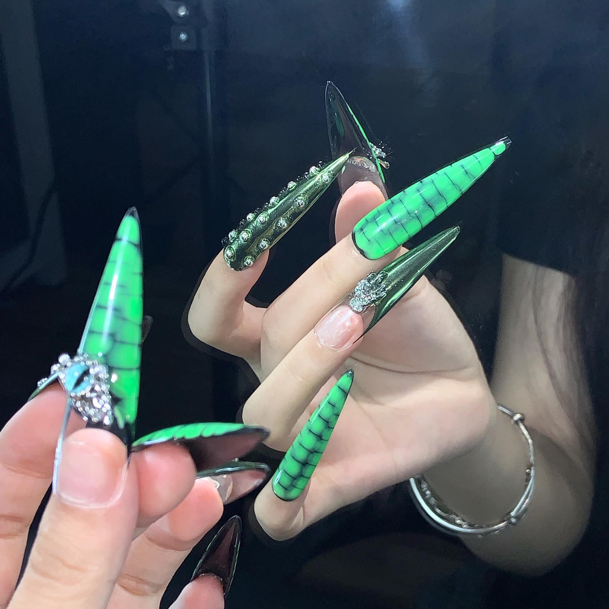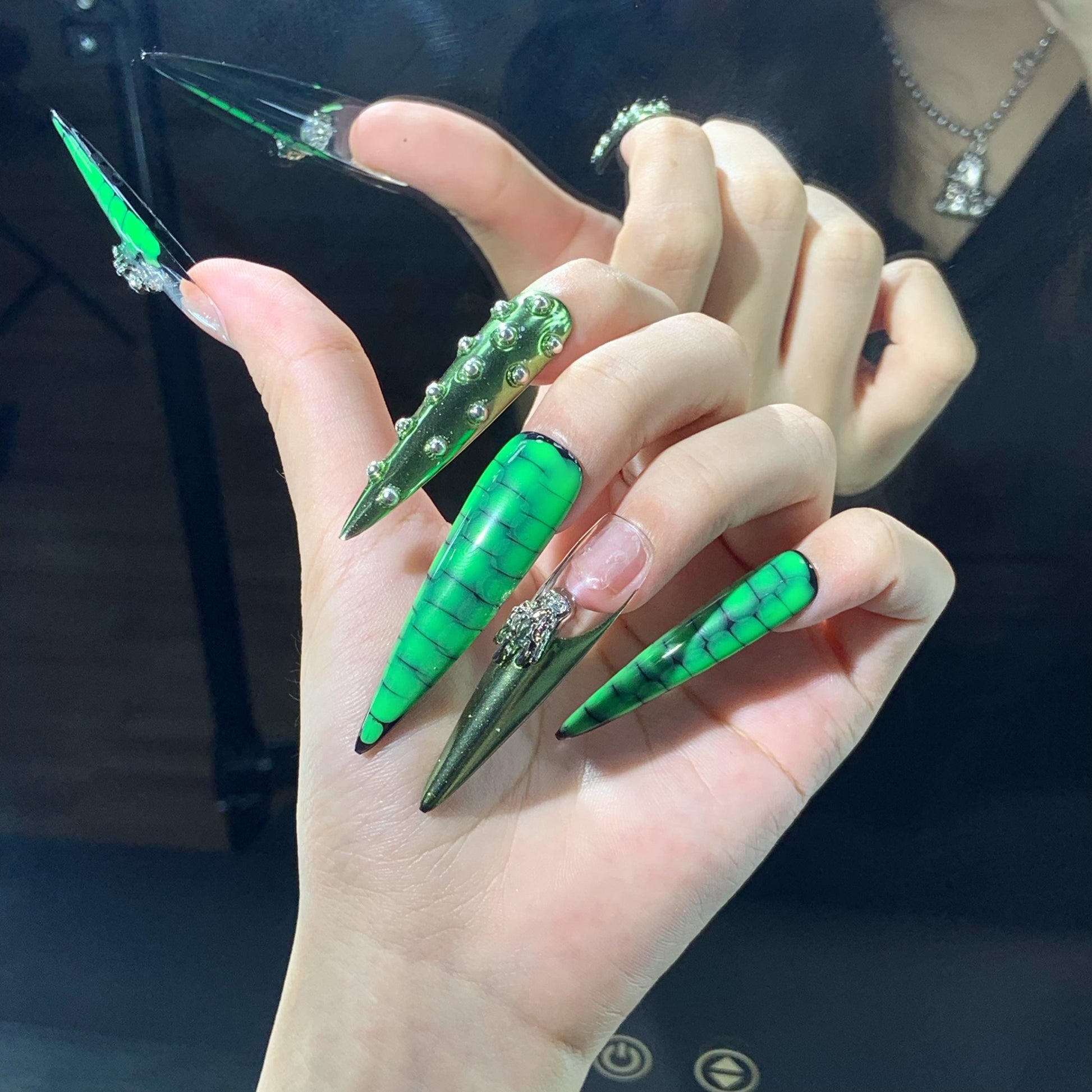 Bold and edgy set of long stiletto press-on nails with a neon green and black crocodile scale pattern. Several nails feature striking 3D embellishments including a metallic claw holding a green monster eye, chrome silver studs, and gothic-style silver charms. The mix of textures and elements—glossy chrome, matte reptile print, and intricate metal details—creates a fierce, fantasy-inspired look perfect for Halloween, cosplay, or anyone who loves a daring and dramatic manicure.