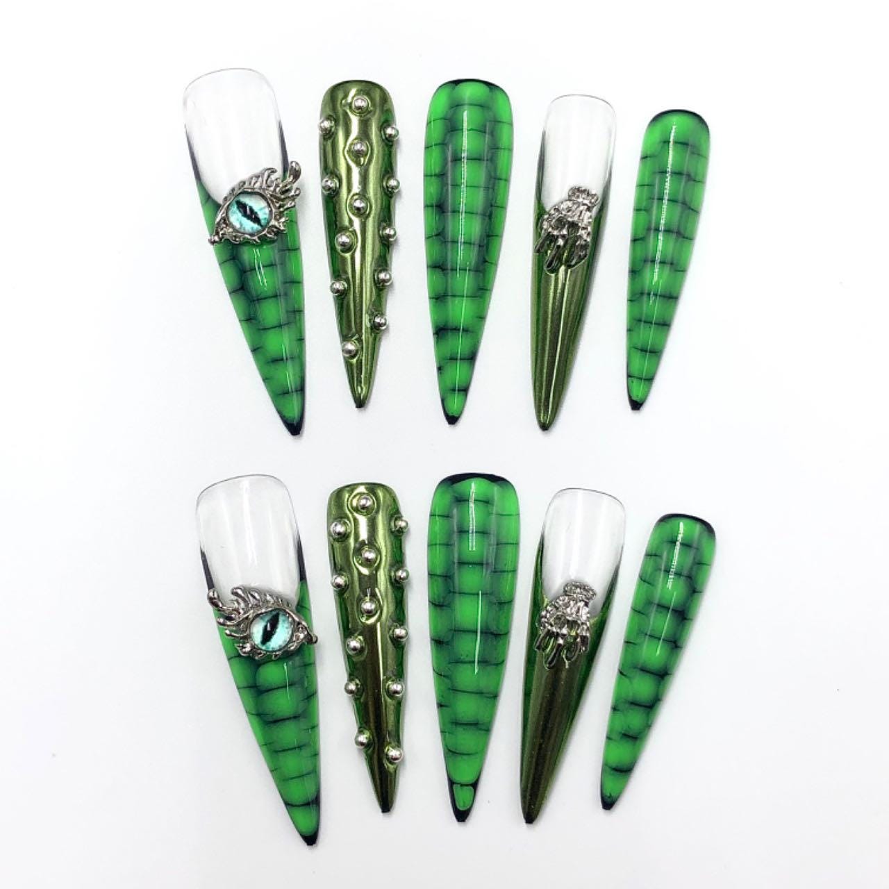Green reptile nails crocodile print 3D art long stiletto press-on nails, goth Halloween monster eye metallic spooky nails, claw fantasy art.