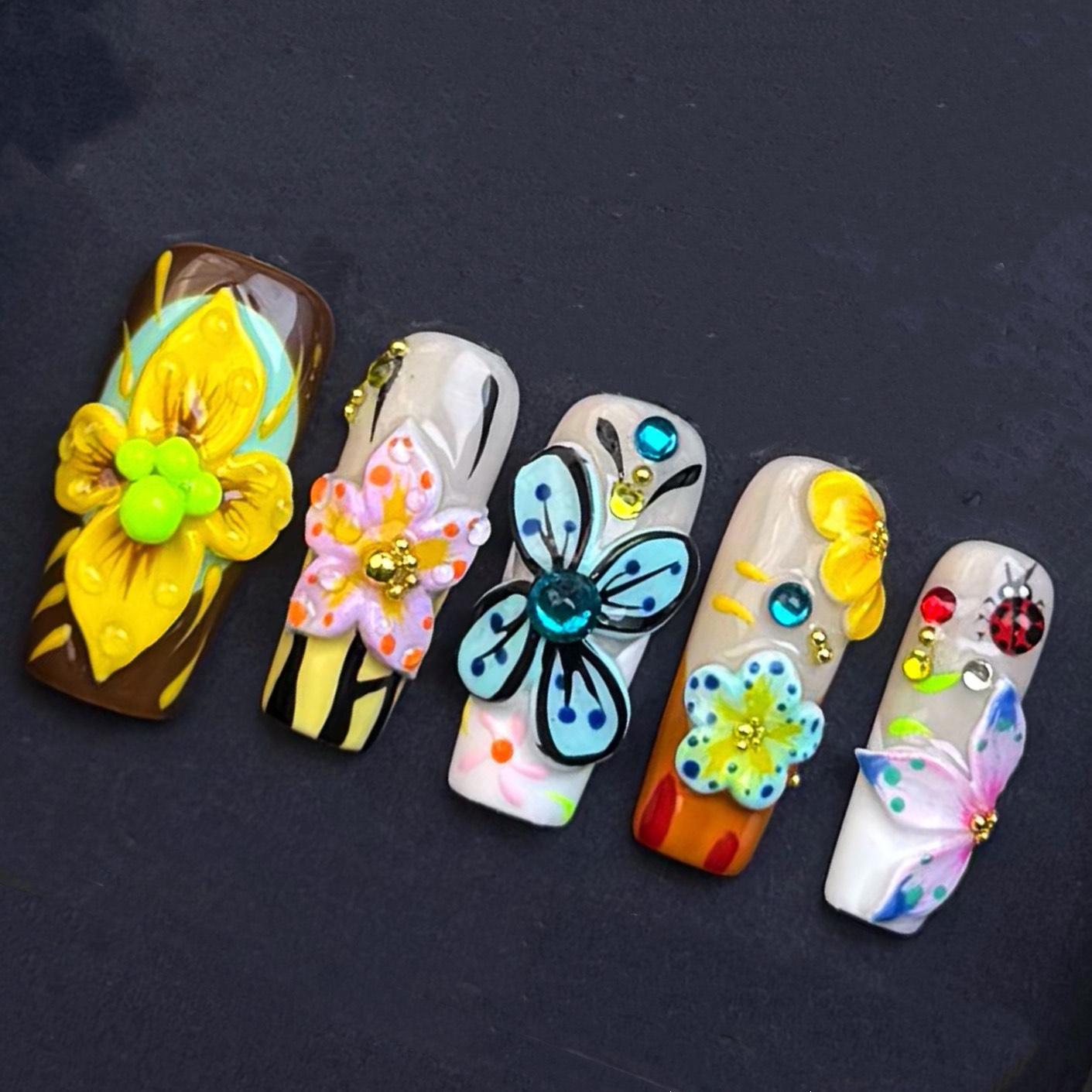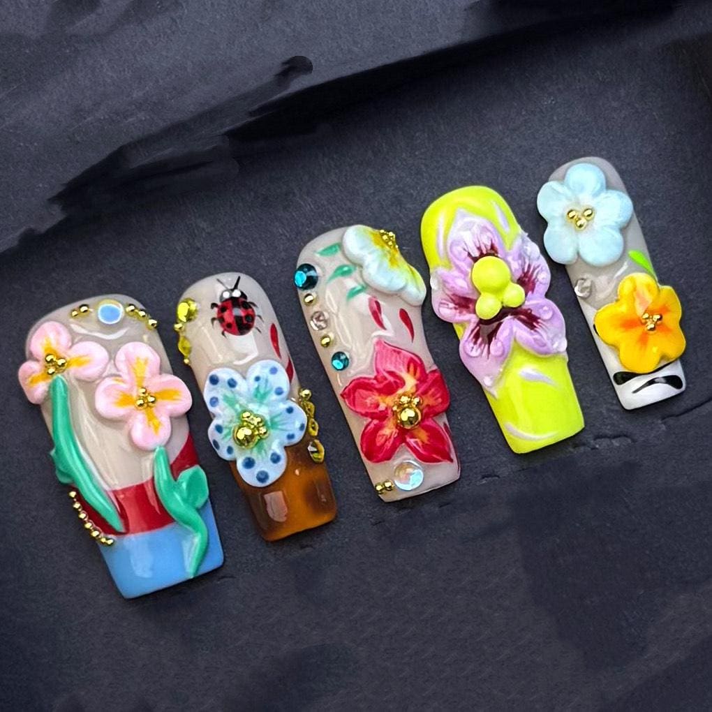 Celebrate spring with these vibrant handmade 3D flower garden press on nails Each nail features detailed floral designs colorful rhinestones and charming ladybugs for a lively nature inspired look Perfect for springtime events garden parties or anyone who loves bold artistic nail art Every set is crafted with high quality materials for a stunning long lasting finish