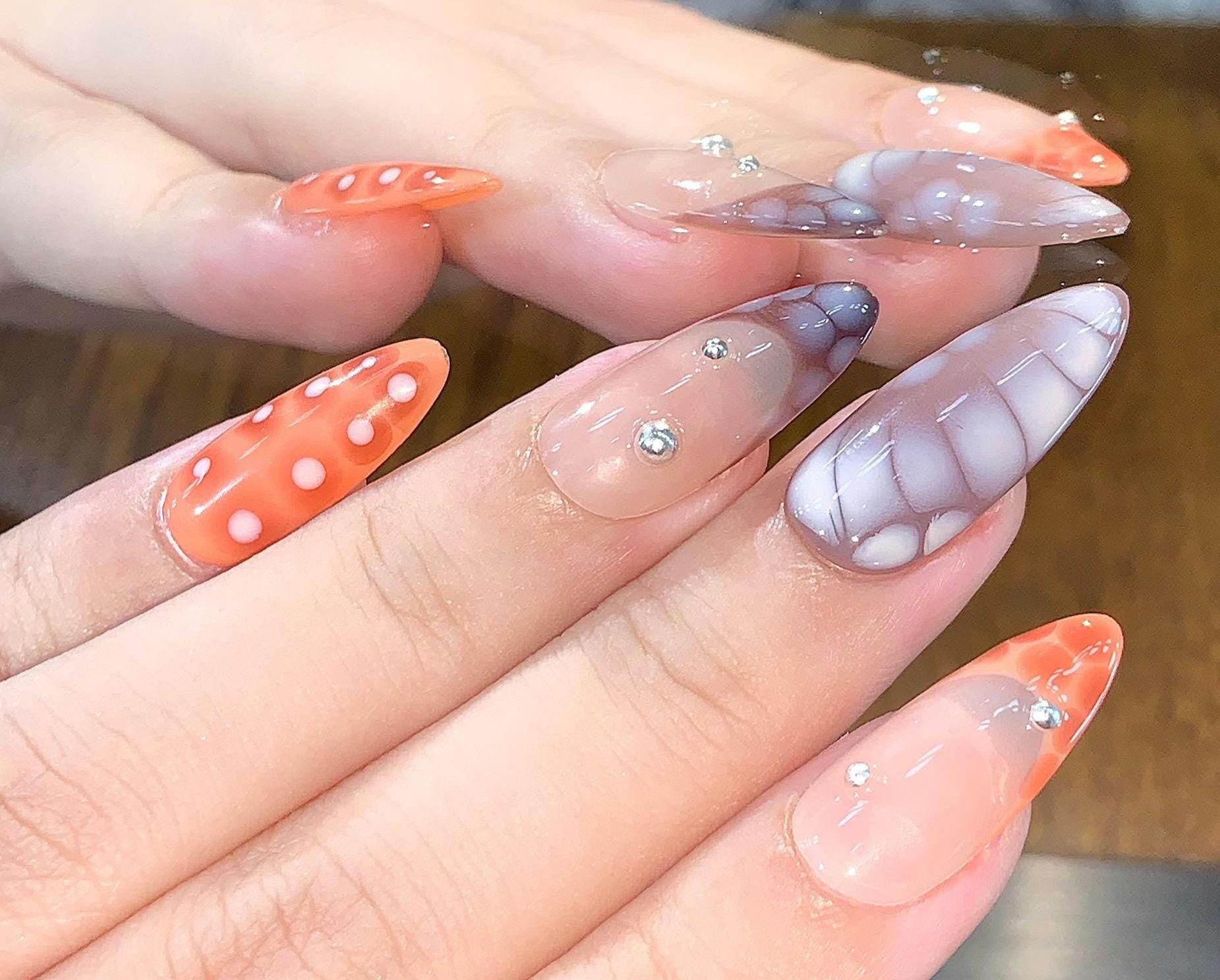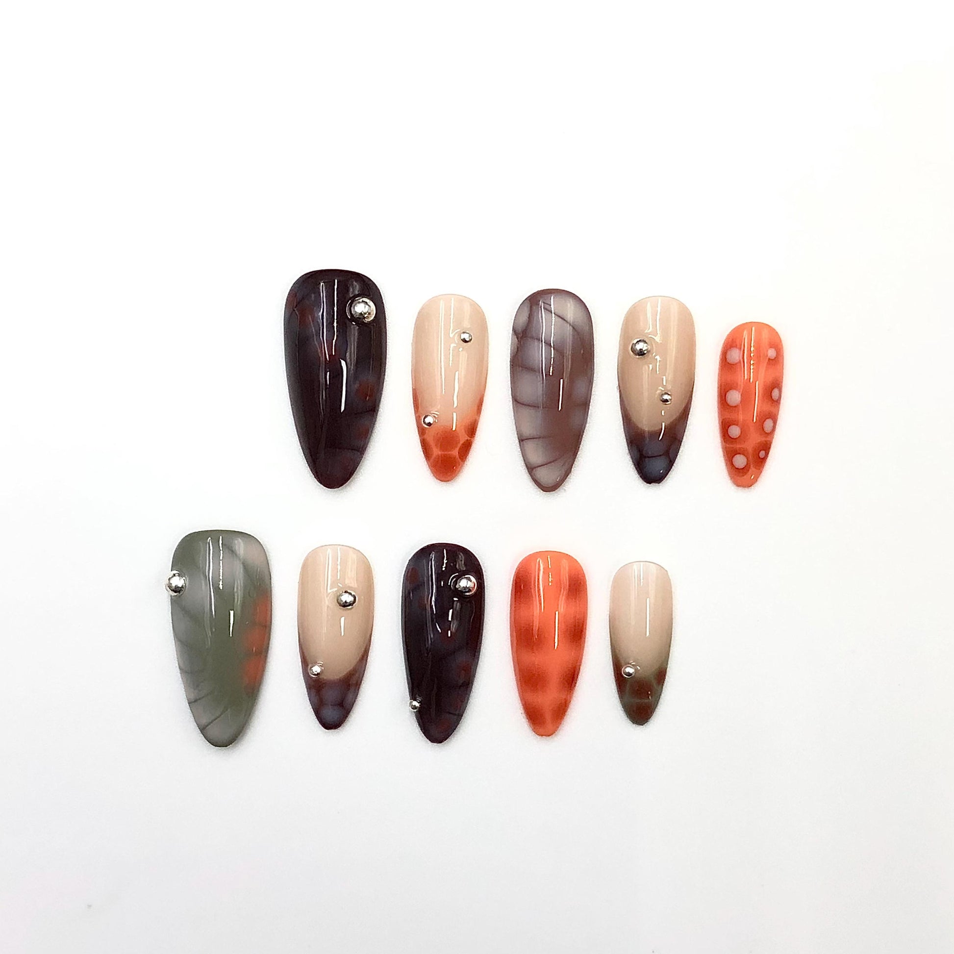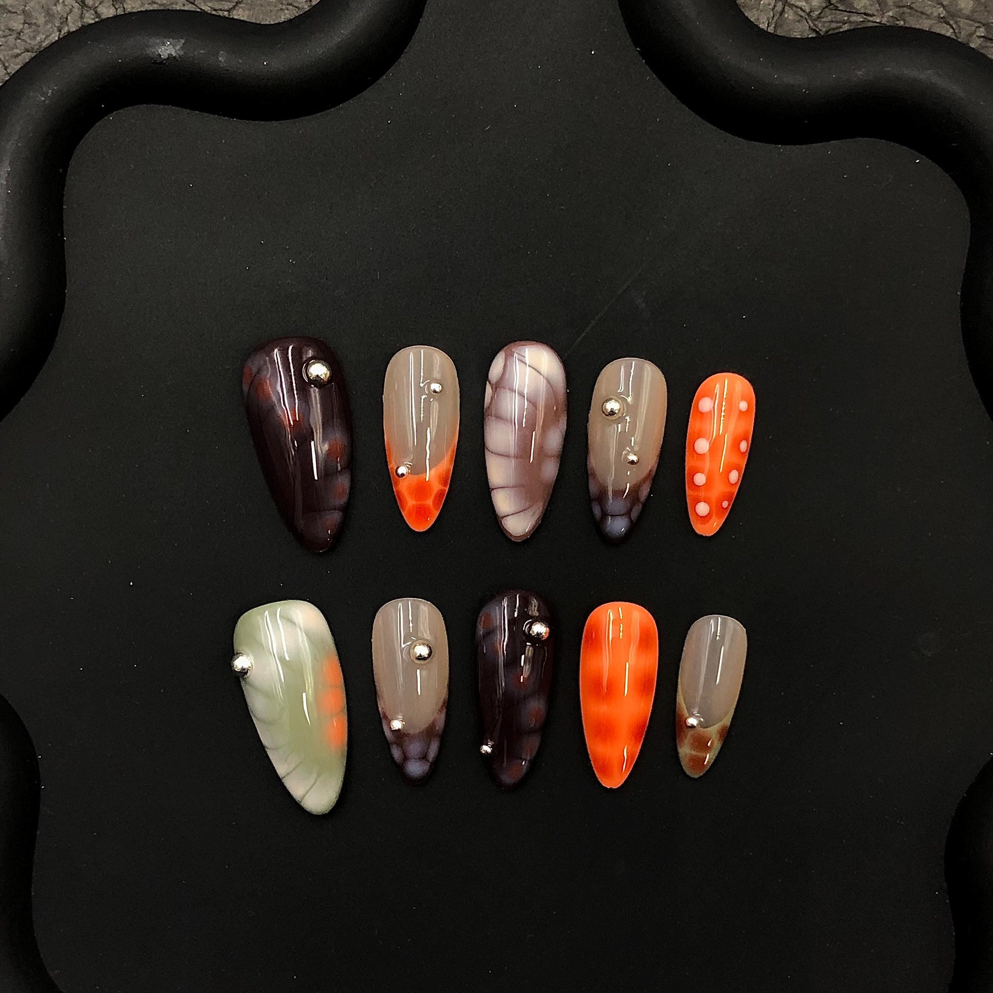 Handmade Marble and Flame Press On Nails Orange Gray & Neutral Tones with Chrome Stud Accents. Halloween edgy fake nails fall hand painted