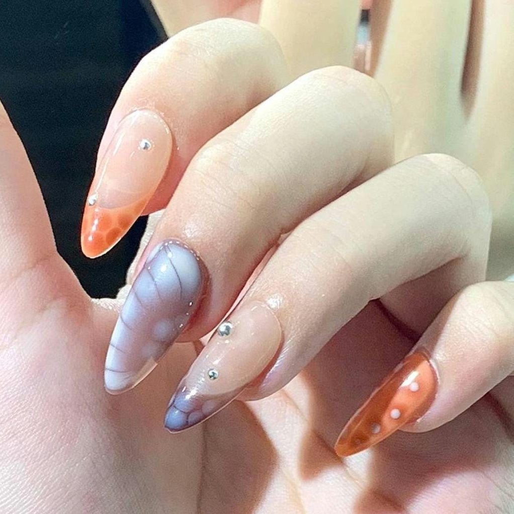 Add a bold, modern touch to your look with this edgy press-on nail set. Featuring a striking blend of smoky marble effects, flame-like gradients, and vibrant orange details, each nail is accented with silver chrome studs for a touch of glam. These handmade press-ons are perfect for anyone who loves unique, artsy nails with a dark twist.