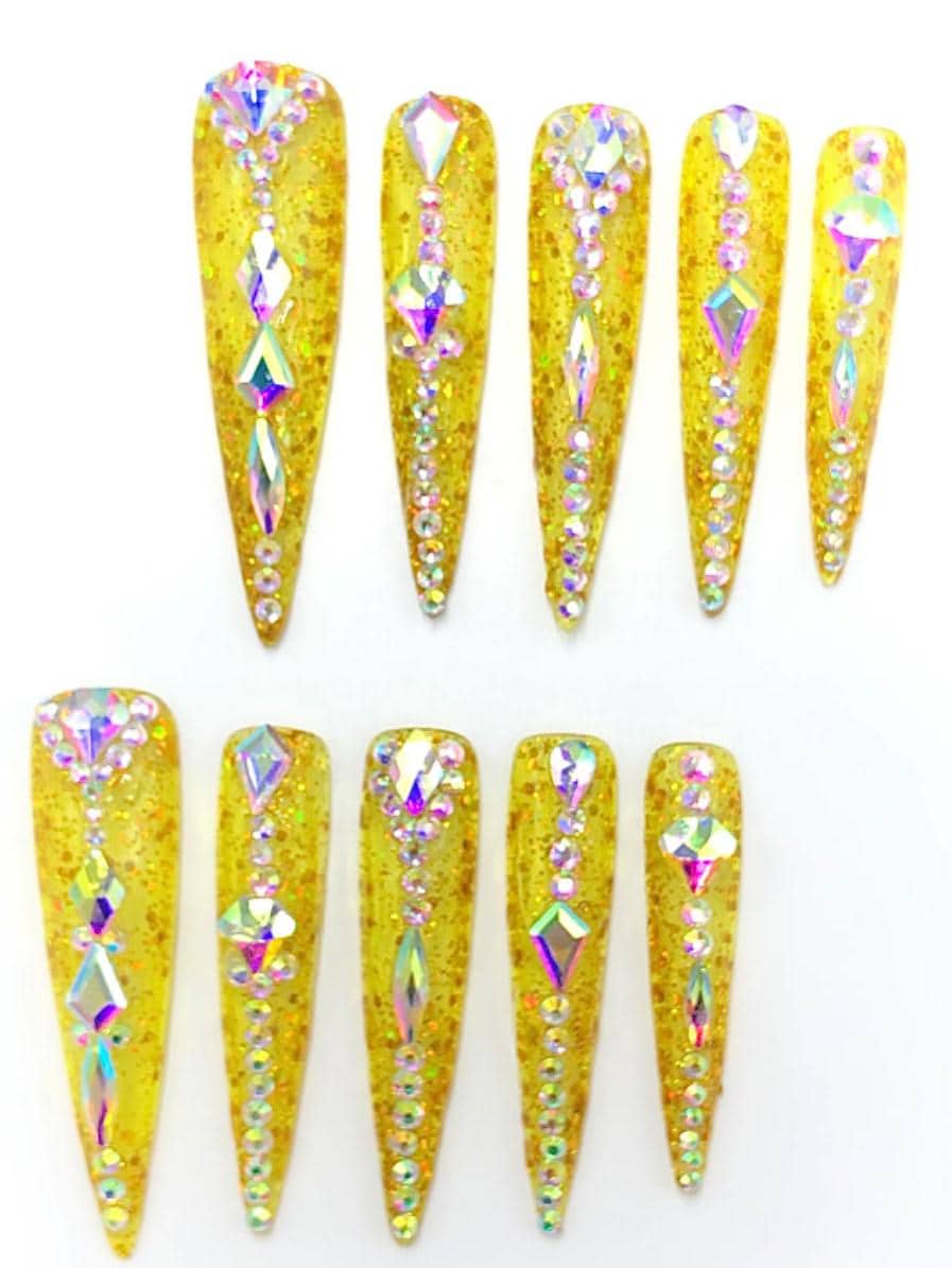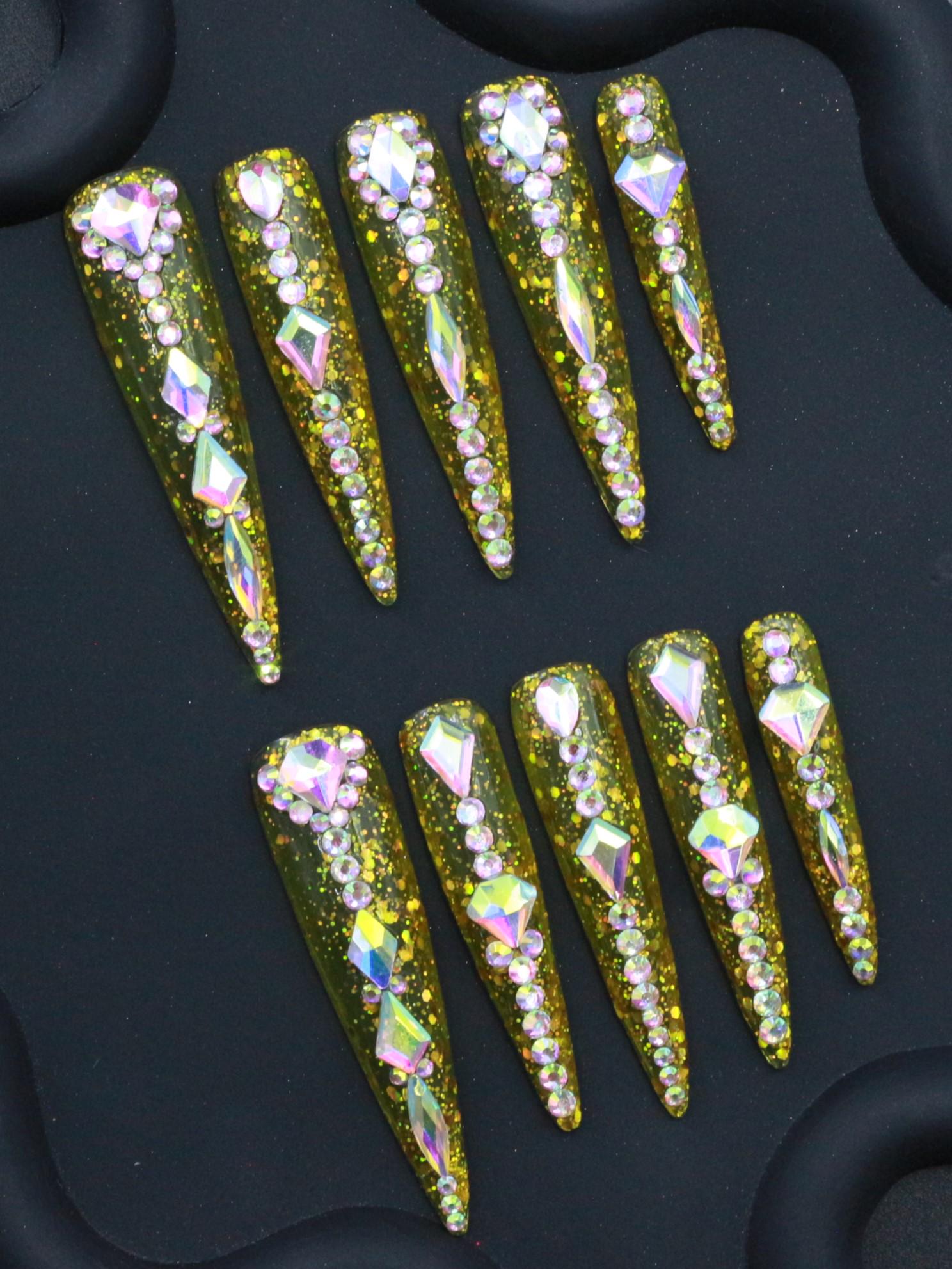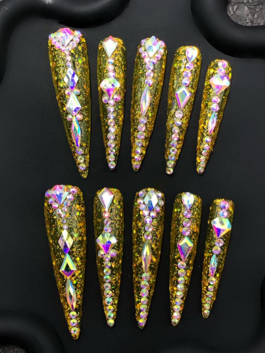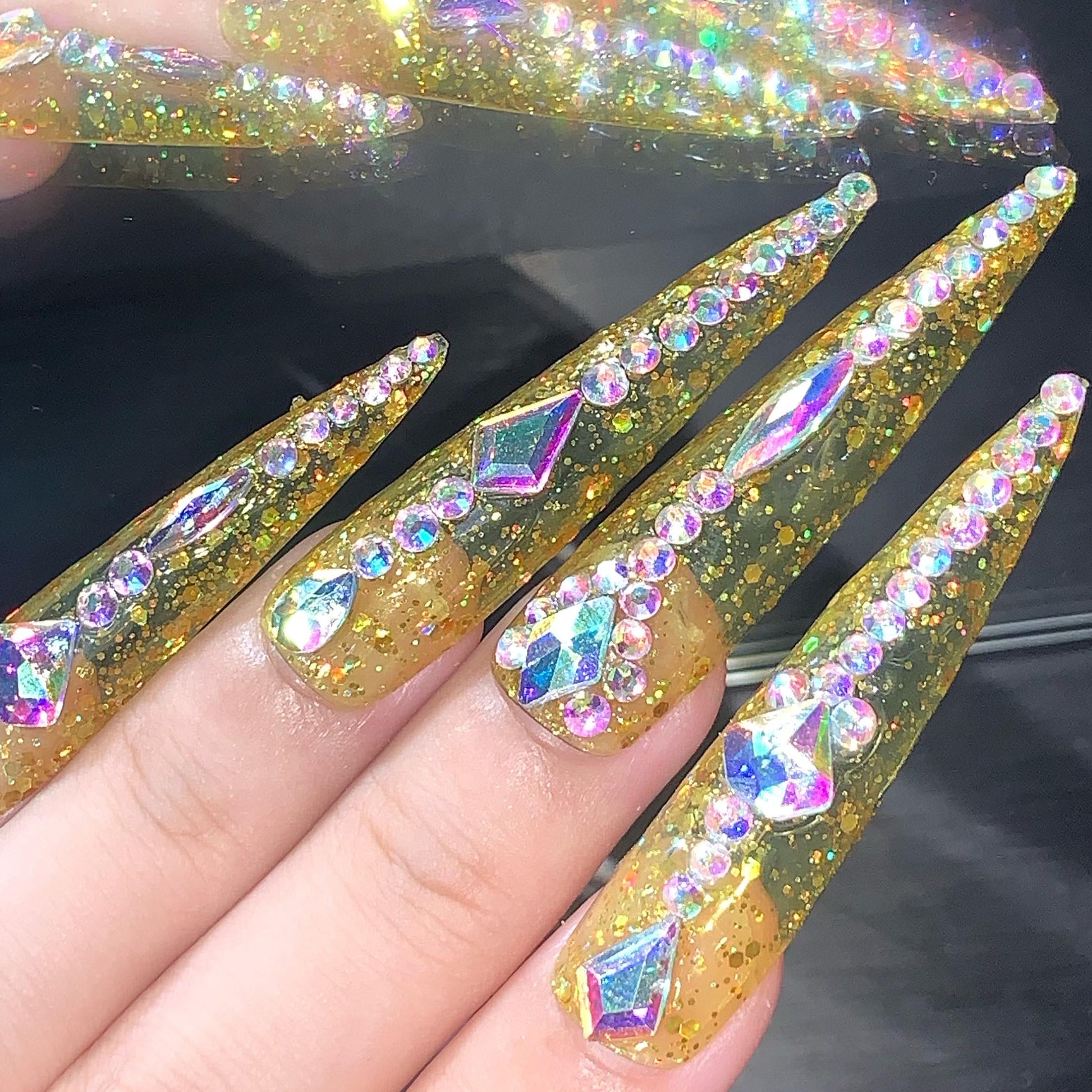 Shine like a star with these bold holographic gold glitter press-on nails. Drenched in golden sparkle and topped with striking iridescent diamond-shaped rhinestones, this long stiletto nail set delivers instant glam. Perfect for special events, parties, or whenever you need a dazzling confidence boost.